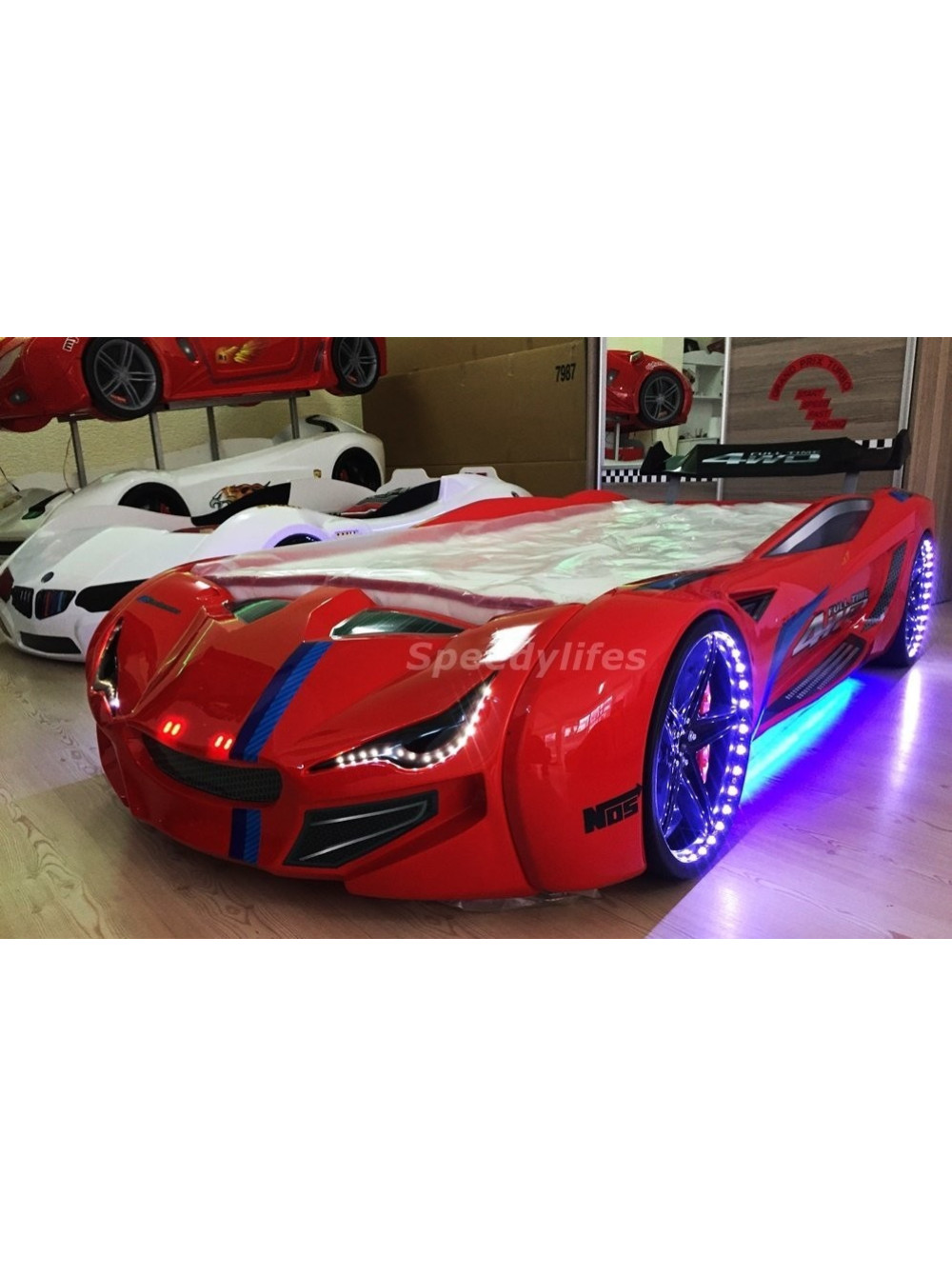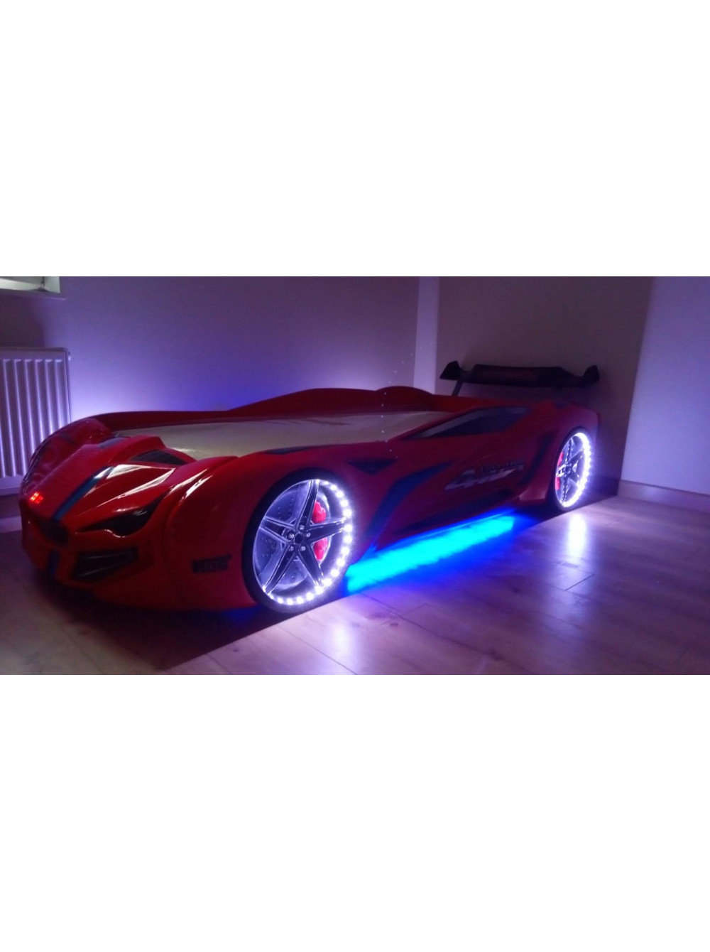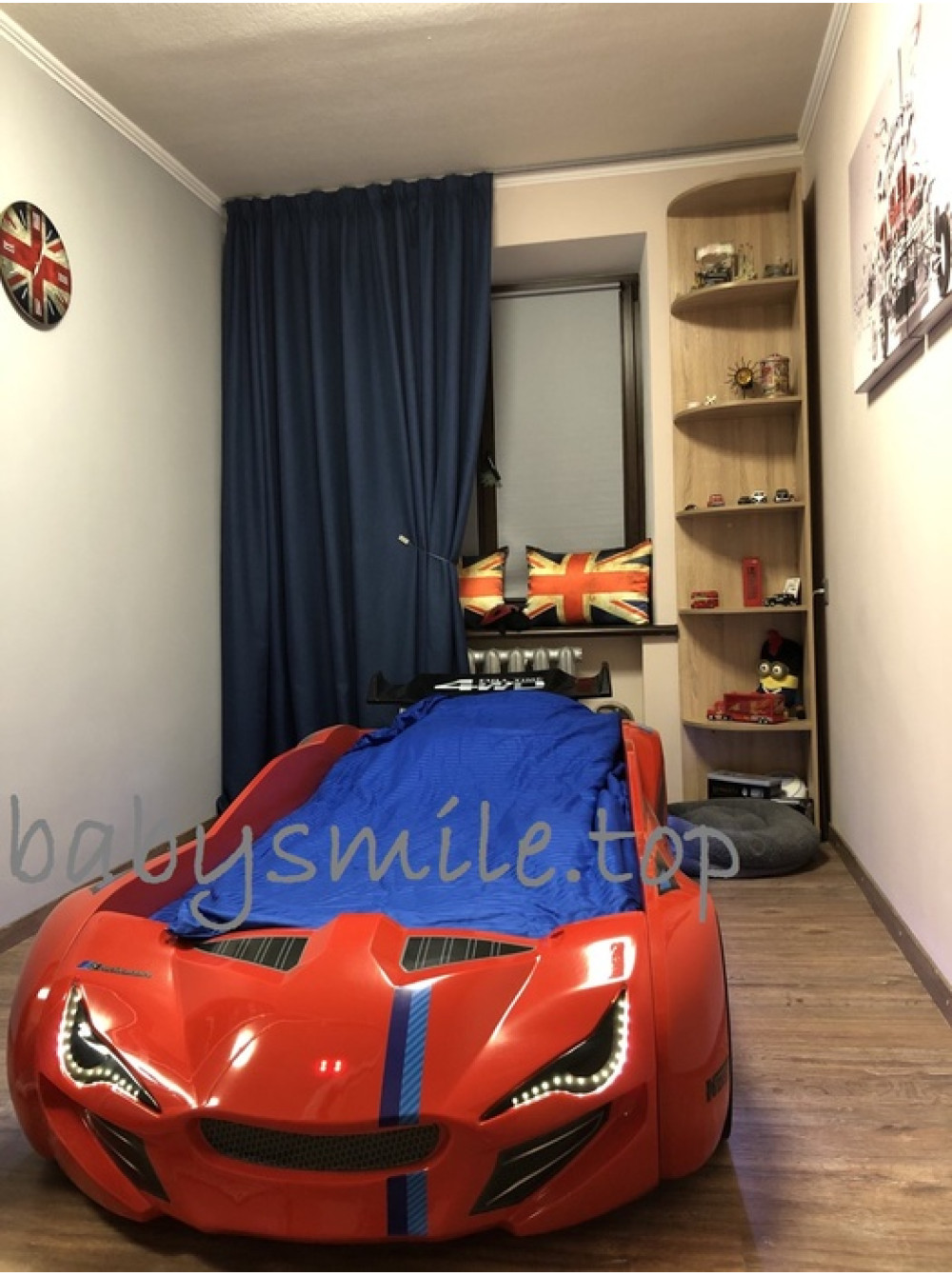 Найголовніше, що Ліжко у вигляді машини BMW червоне виглядає реалістично не тільки зовні. Вона може видавати цілком реальні звуки мотора, що заводиться, і машини, що їде, до того ж підсвічування фар, коліс і дна завершують образ сучасного автомобіля. Таке підсвічування можна використовувати замість нічника, якщо ваша дитина боїться спати в повній темряві.