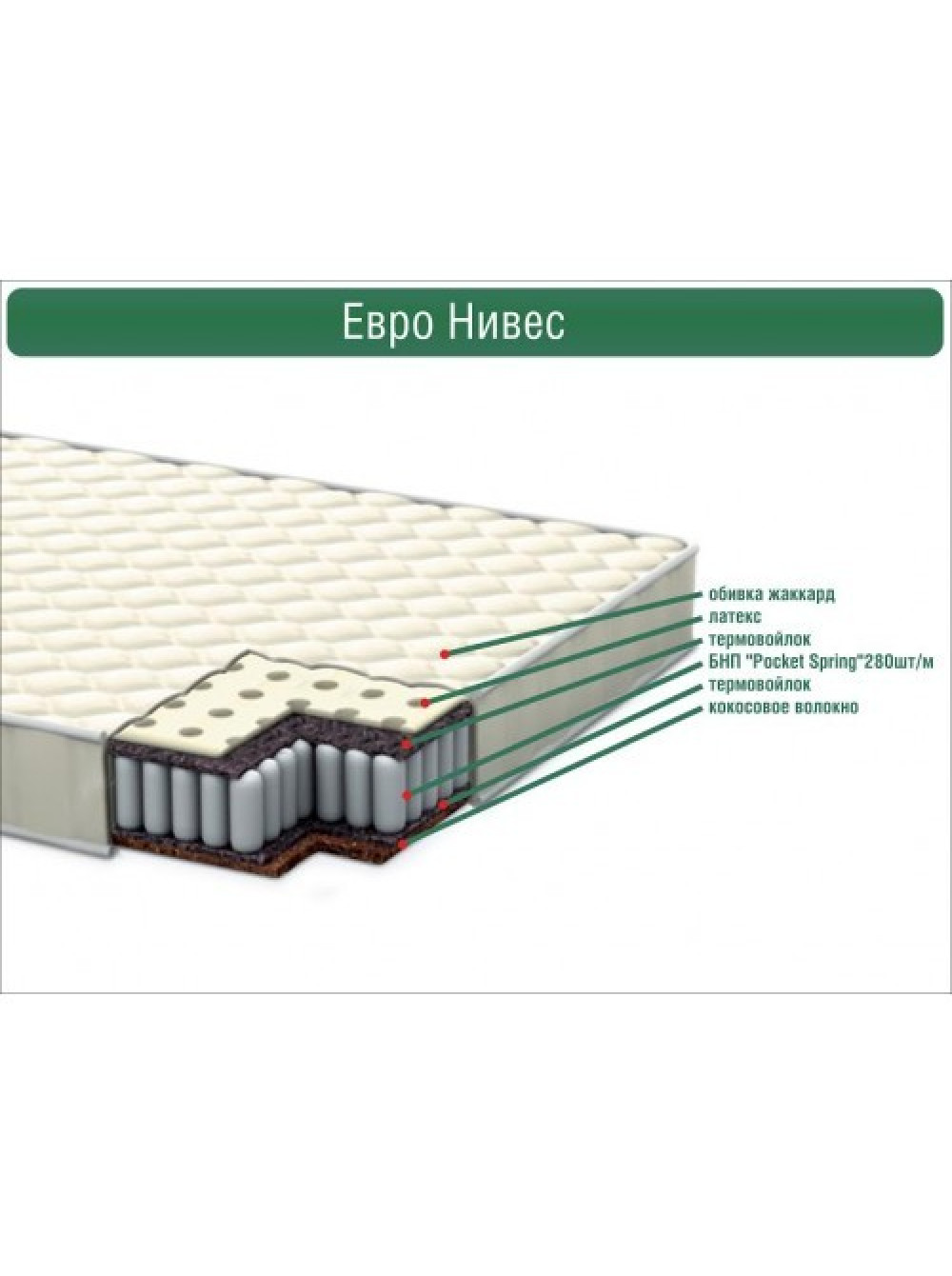 Дитячий матрац Євро Нівес - відмінний варіант для організації спального місця дитини. Матрац має різну ступінь жорсткості з двох сторін: середньої і вище середньої, комфортний і зручний, виконаний на основі пружинного блоку «Pocket Spring» і має яскраво виражені анатомічний і ортопедичний ефект. Він є ідеальним варіантом як для найменших, так і діток по-старше. Зроблений з матеріалів високої якості, тому має тривалий термін експлуатації. На розрізі можна побачити: жаккард, кокосове волокно, латекс,термовойлок, блок незалежних пружин «Pocket Spring», бавовняну вату.