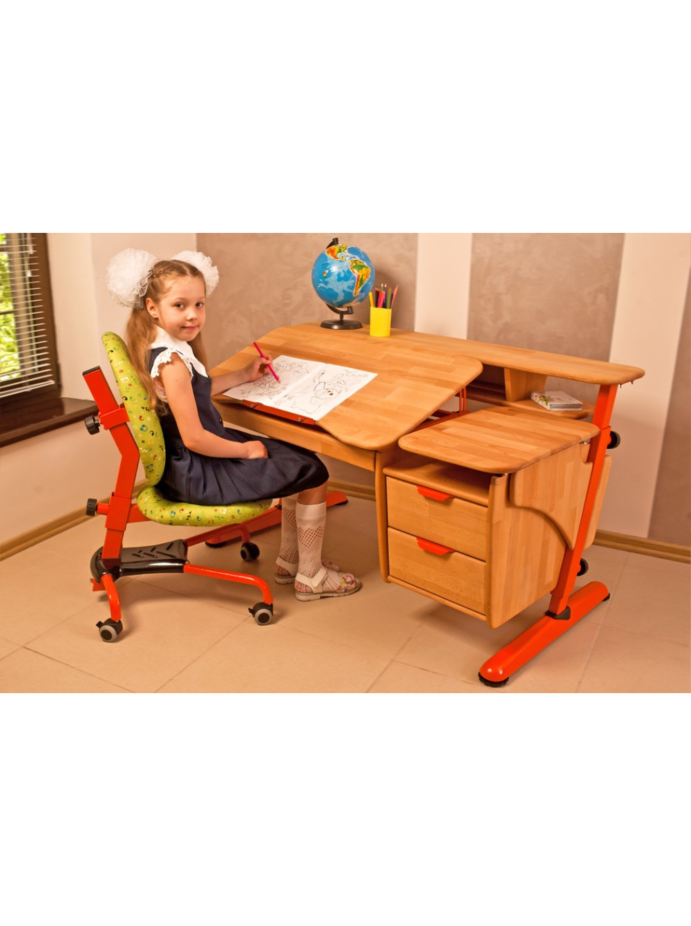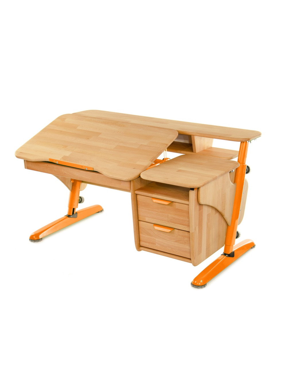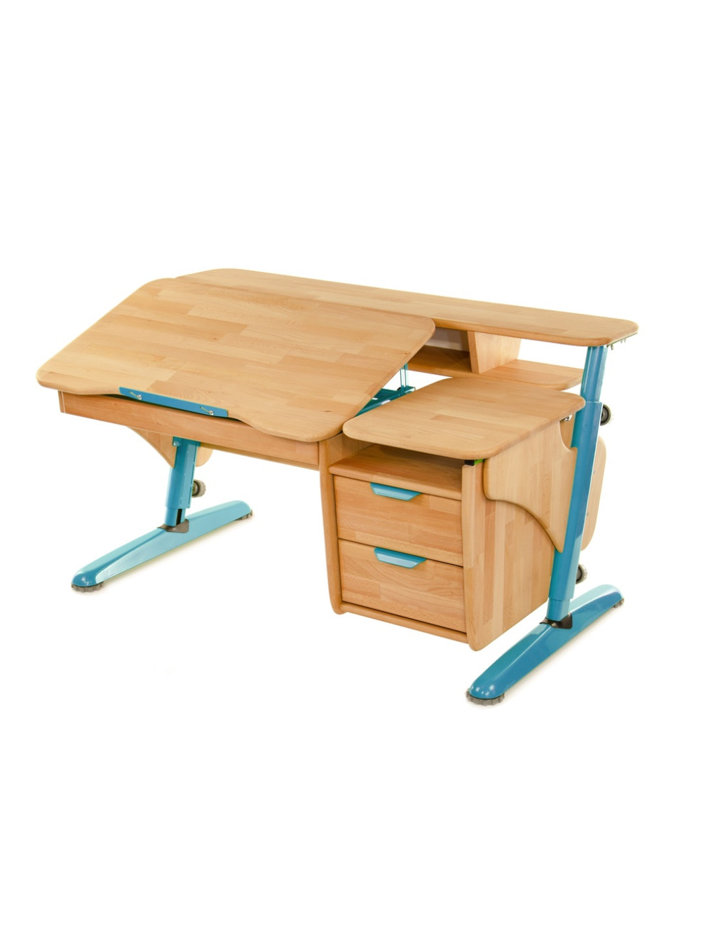 Стільниця може змінювати кут нахилу від горизонтального положення до тридцяти градусів. Для комфорту і безпеки дитини передбачений механізм плавного підйому. Також конструкція доповнена  навісною тумбою з двома ящиками для шкільного приладдя та додатковою полицею.