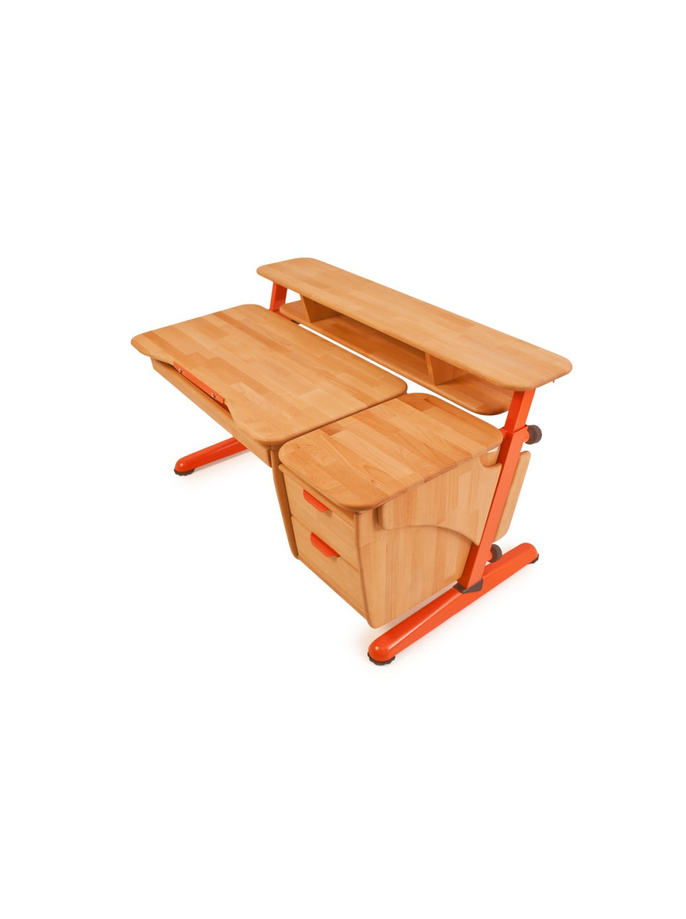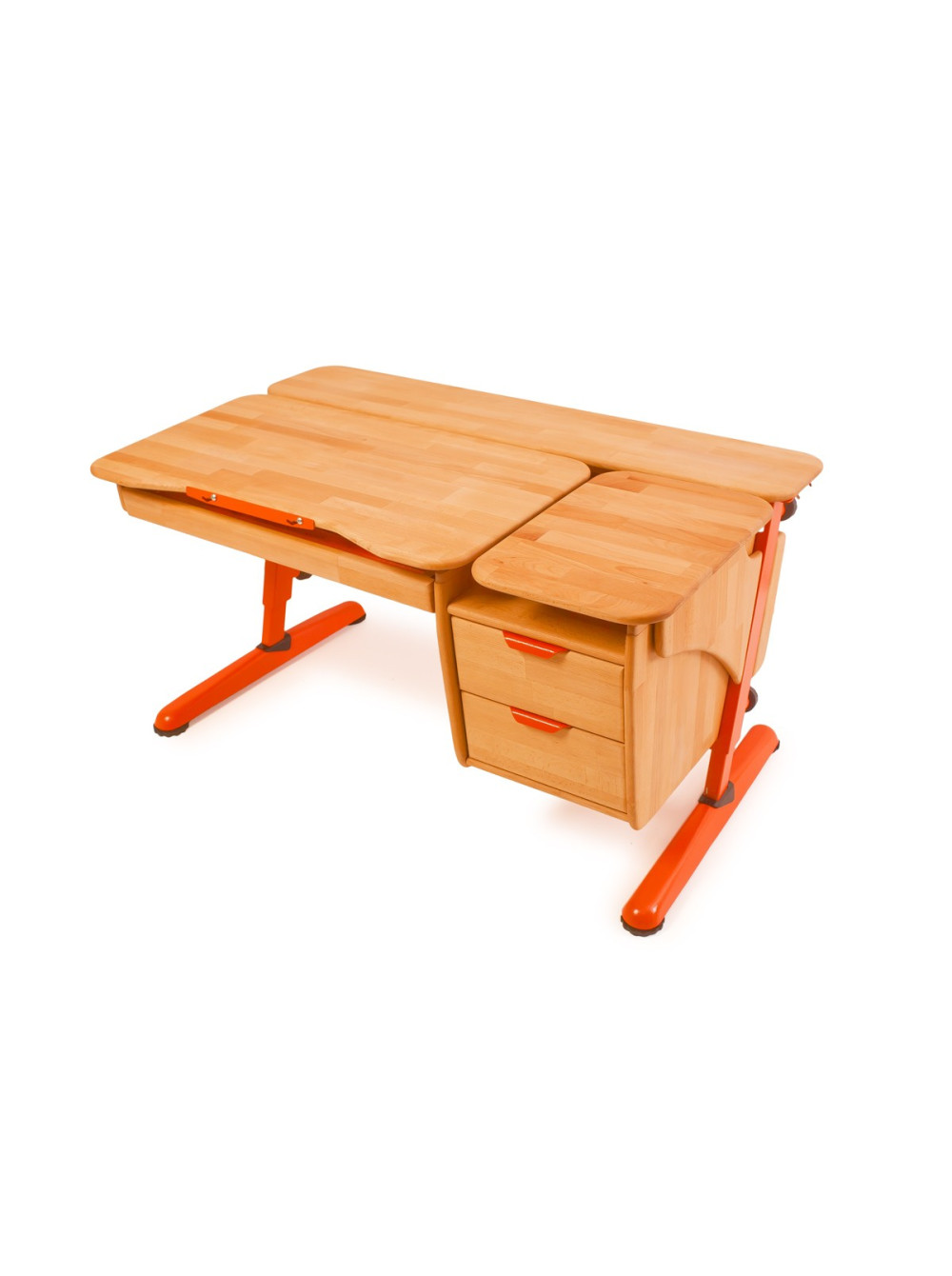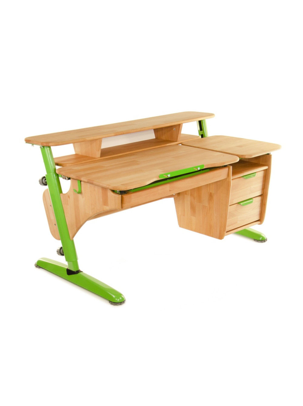 Стільниця може змінювати кут нахилу від горизонтального положення до тридцяти градусів. Для комфорту і безпеки дитини передбачений механізм плавного підйому. Також конструкція доповнена  навісною тумбою з двома ящиками для шкільного приладдя та додатковою полицею.