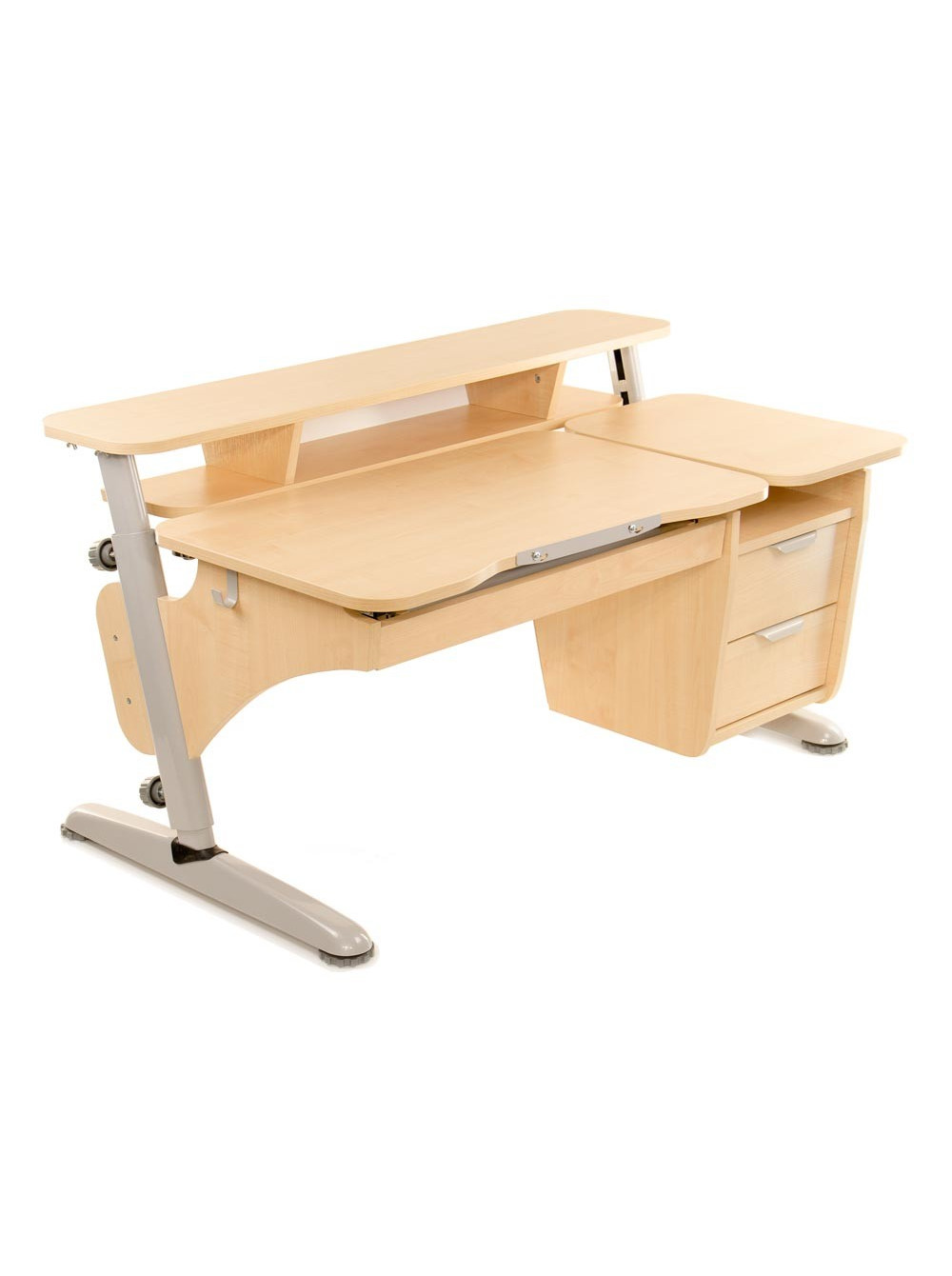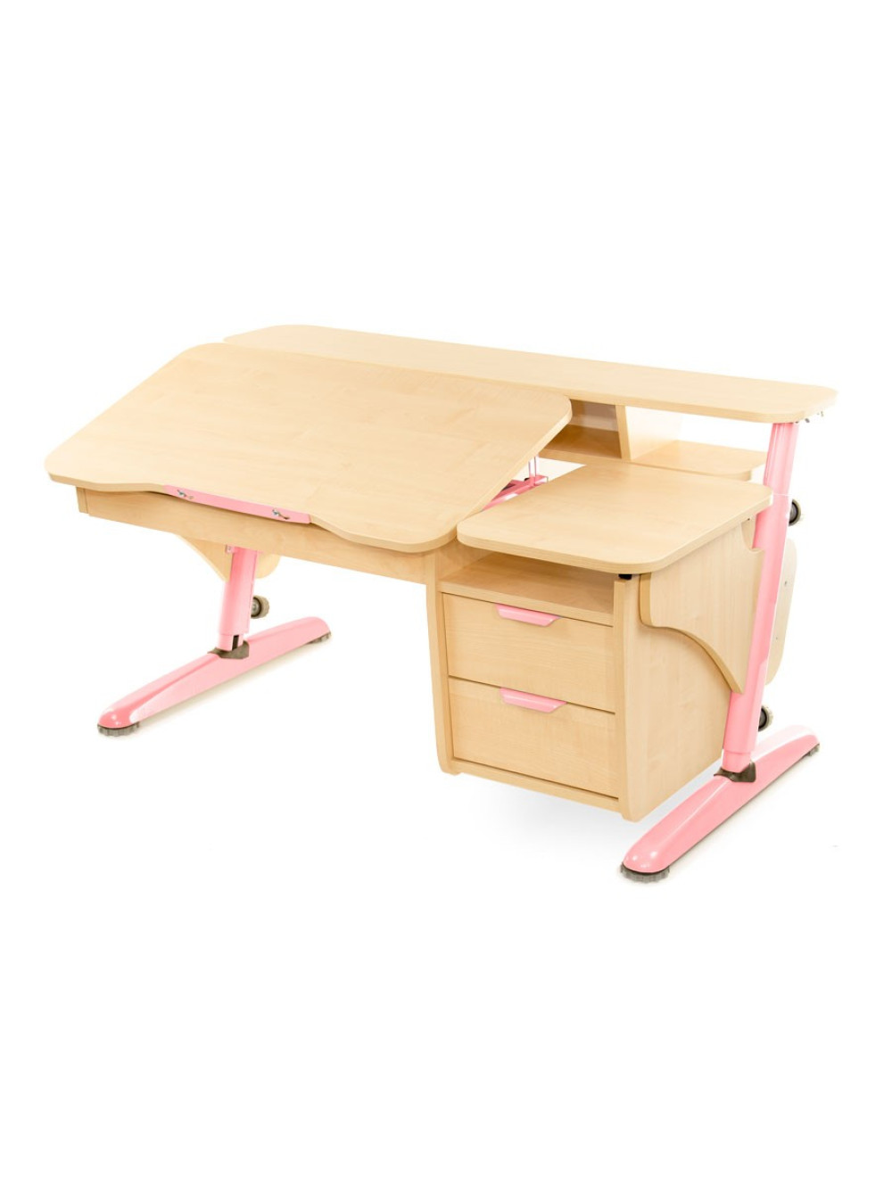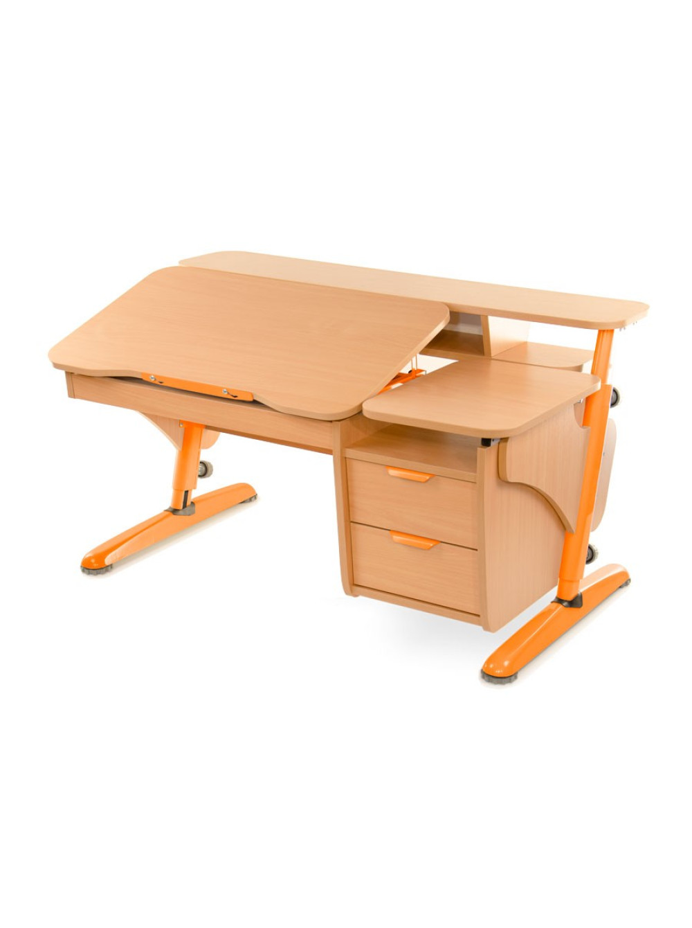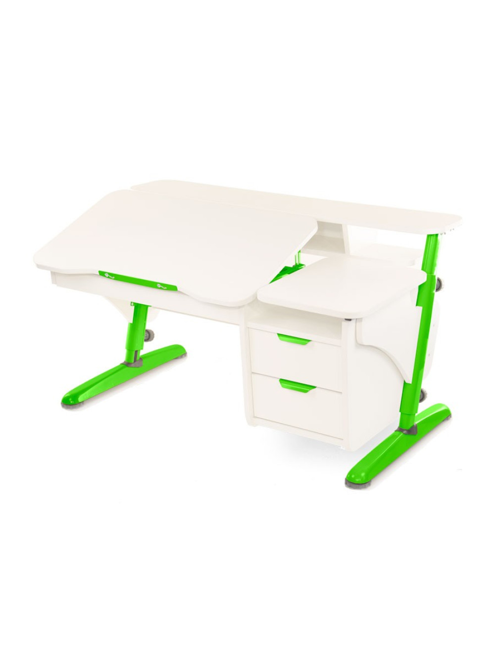 Стільниця може міняти кут нахилу від горизонтального положення до тридцяти градусів. Для комфорту і безпеки дитини передбачений механізм плавного підйому. Також конструкція доповнена навісною тумбою з двома ящиками для шкільного приладдя і додатковою полицею.