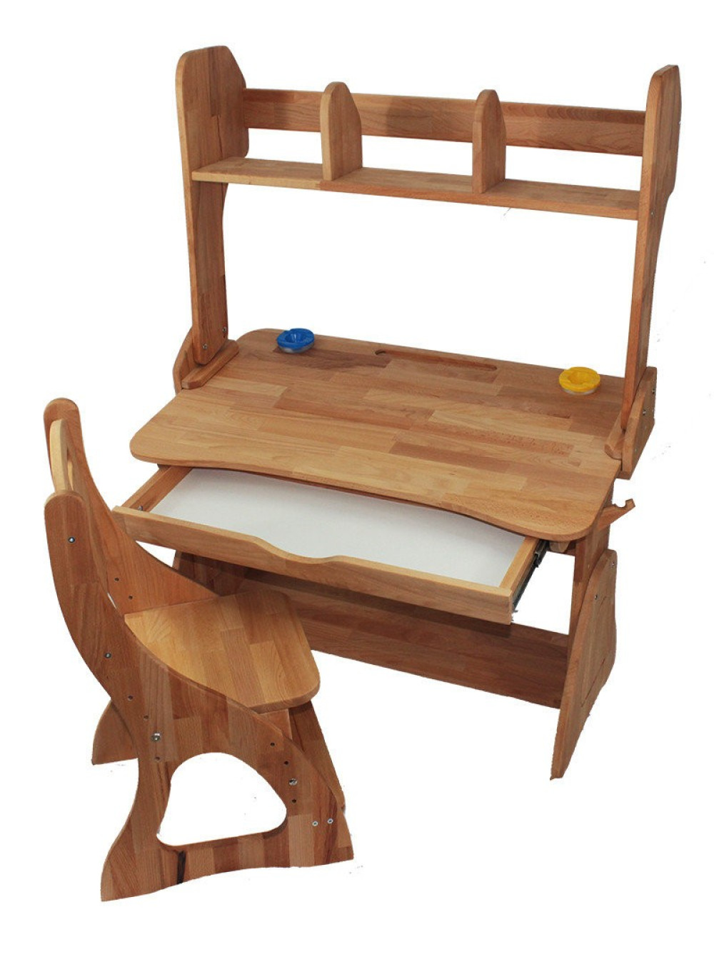 виконані з якісного натурального дерева, з урахуванням усіх ортопедичних особливостей дитини, що росте, розвивається і досить тривалий час проводить сидячи за нею. Сидіти і навчатися за такою партою буде комфортно і зручно в будь-якому віці, так як парта регулюється по висоті в чотирьох рівнях відповідно зростанню: з 115 до 130 см, до 145 см, з 145 до 160 см і з 160 до 175 см.