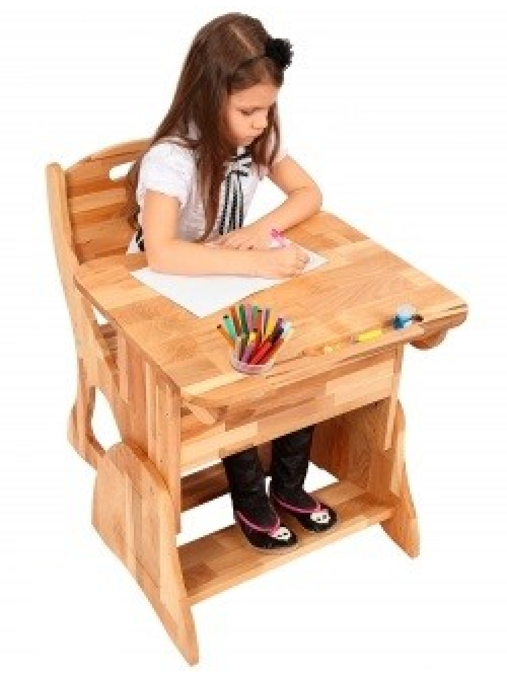 На стільниці є отвори для канцелярського приладдя (ручок і олівців).