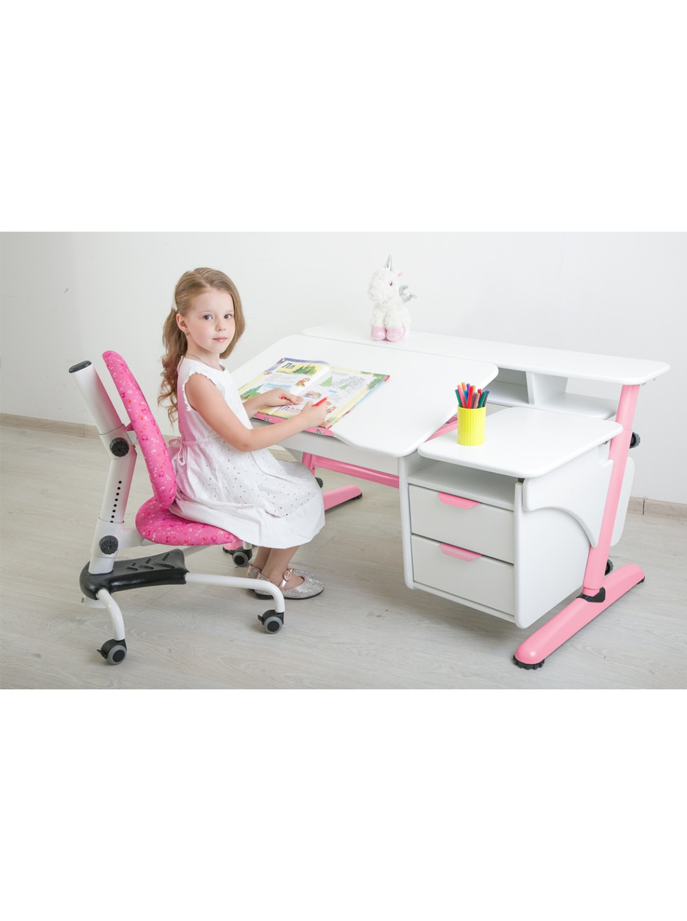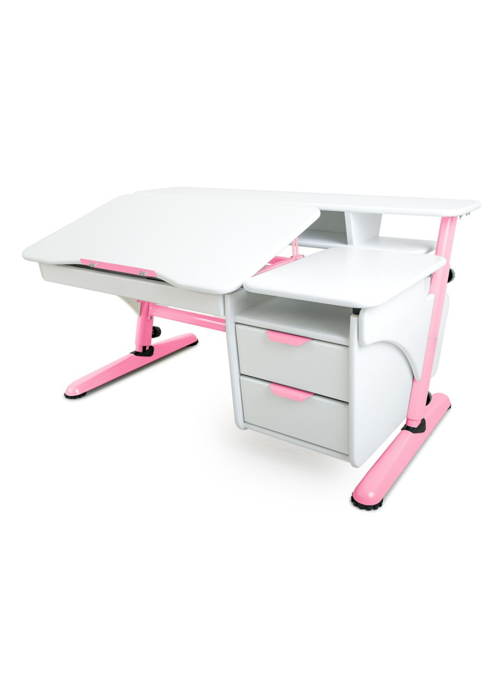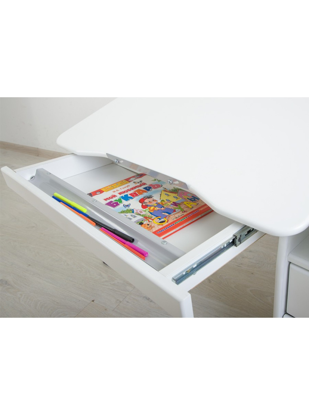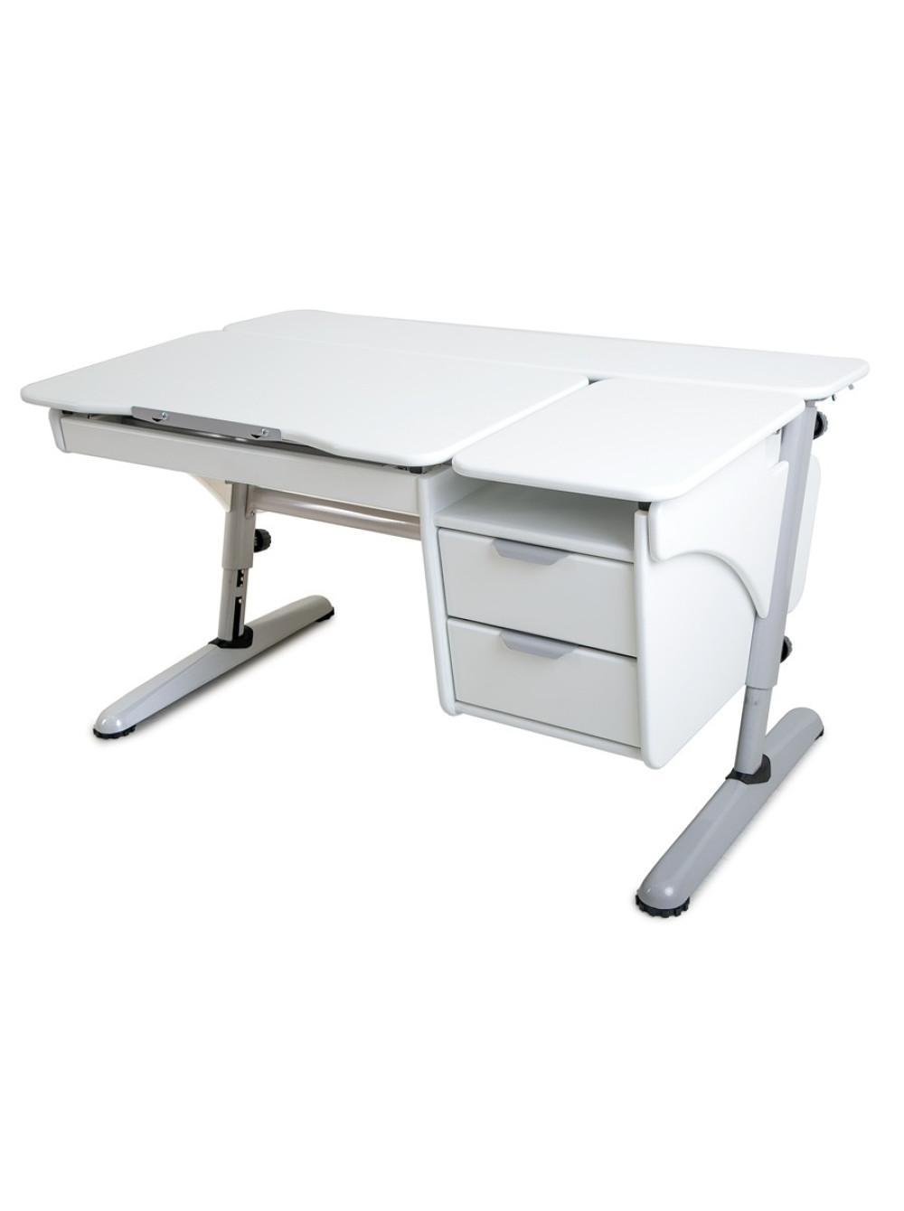 Стільниця може міняти кут нахилу від горизонтального положення до тридцяти градусів. Для комфорту і безпеки дитини передбачений механізм плавного підйому. Також конструкція доповнена навісною тумбою з двома ящиками для шкільного приладдя і додатковою полицею.