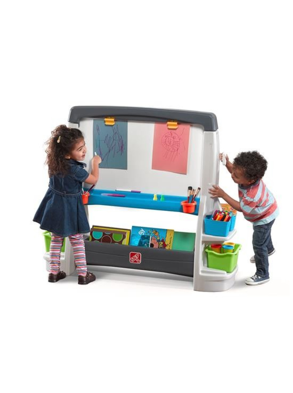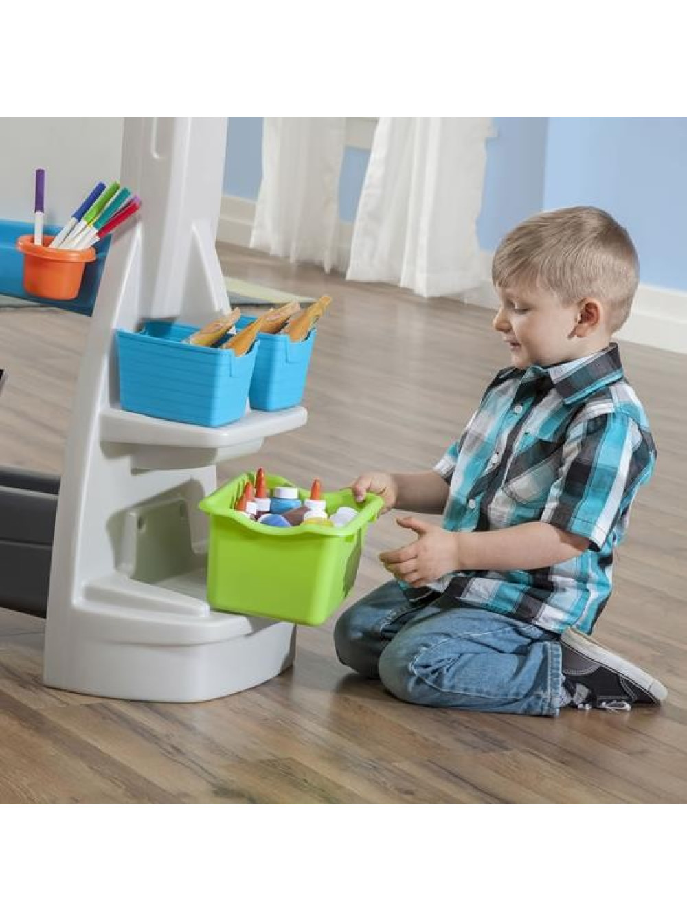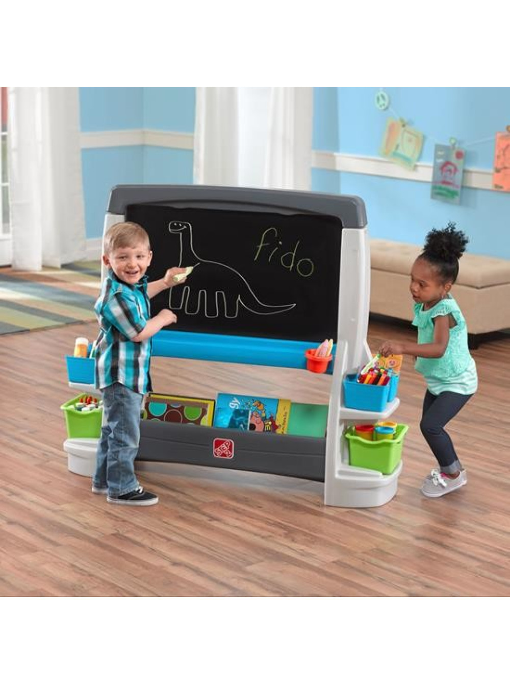Дитяча дошка для малювання Jumbo Art Easel зробить навчання Вашого малюка веселіше і цікавіше. Працювати з цією дошкою зможуть одночасно двоє дітей. З одного боку-дошка для маркера і магнітів, з іншого - для письма і малювання крейдою. Після закінчення творчих занять все приладдя для письма і малювання можна розмістити у великих кошиках і кишенях дошки.