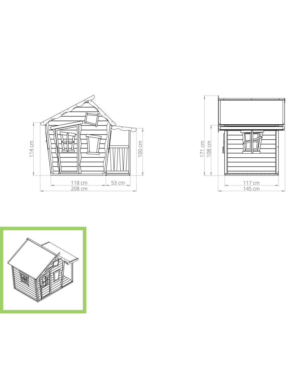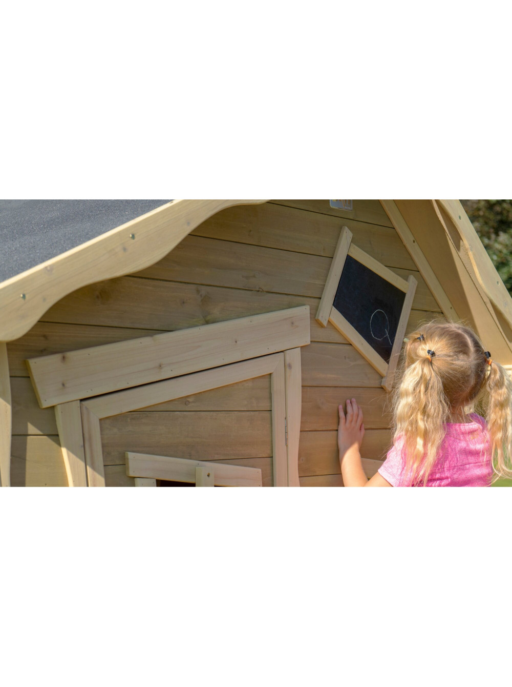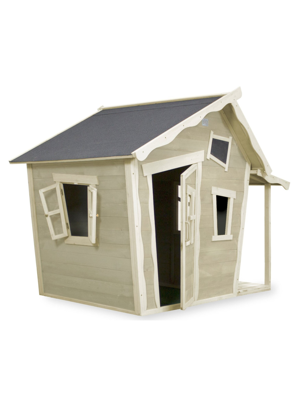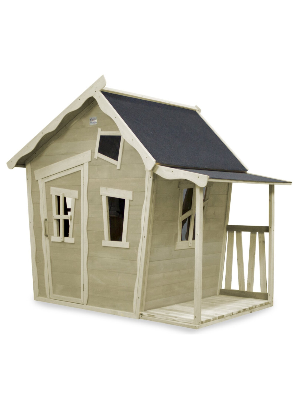 Дерев'яний будиночок з кедра EXIT Crooky 150 сіро-бежевий - це відмінна "казкова хатина" з дивовижним дизайном, де діти можуть грати і веселитися достатньо довго. Відкрита веранда з навісом, двері, що відкриваються, вікна химерної форми - підкреслює стиль і якість цієї ігрової території.