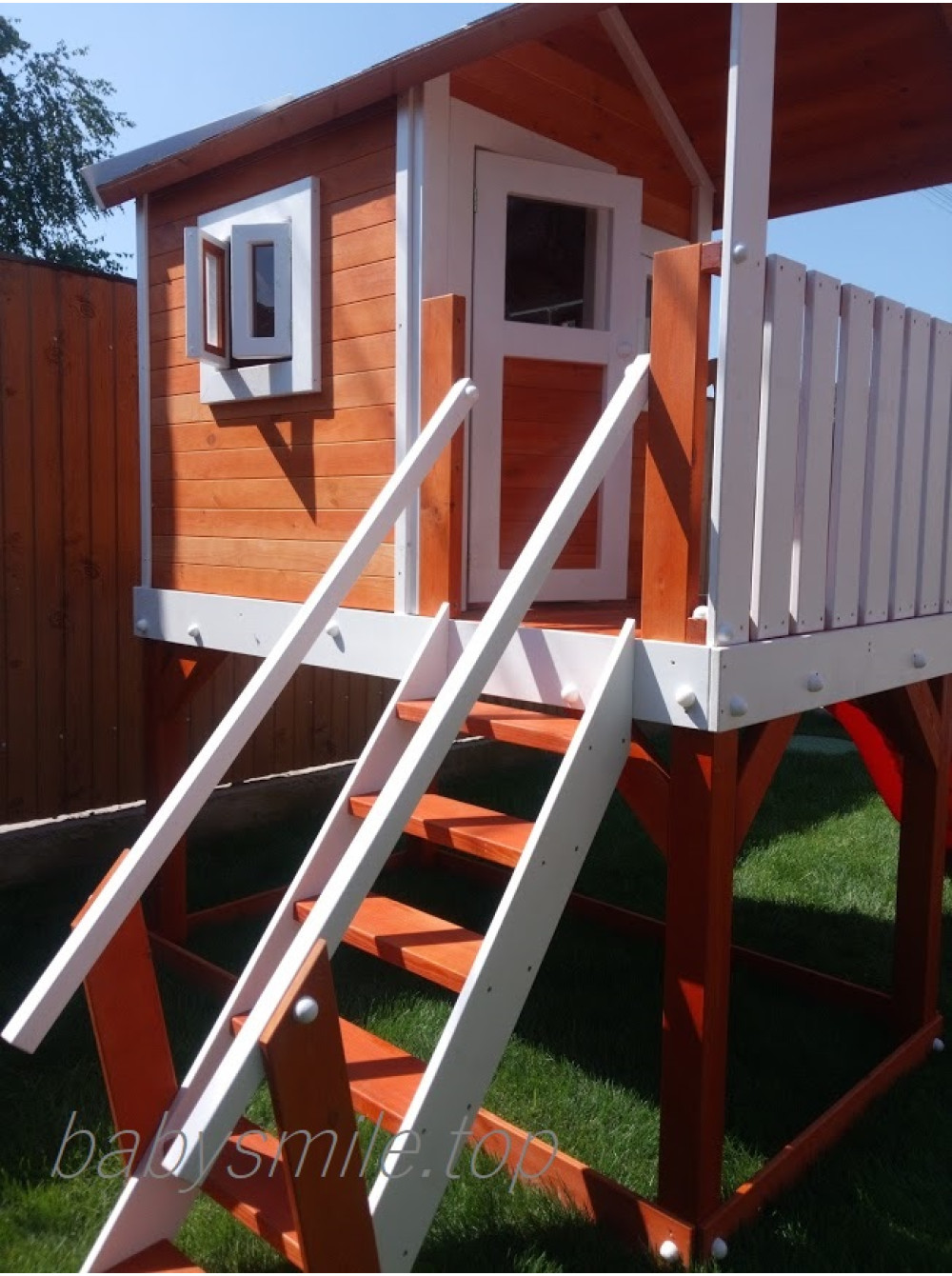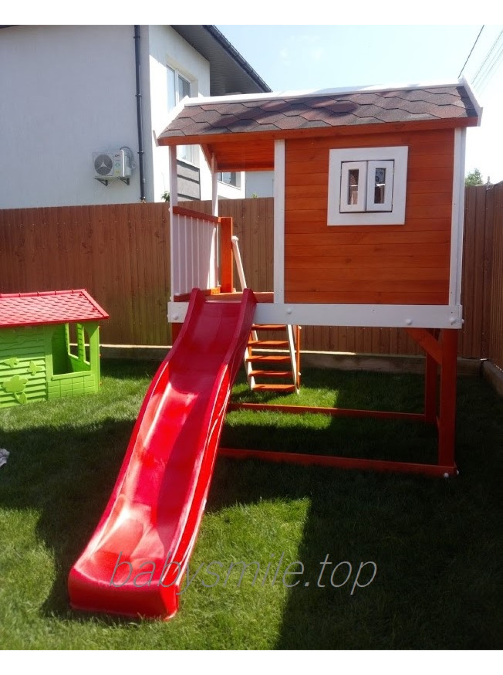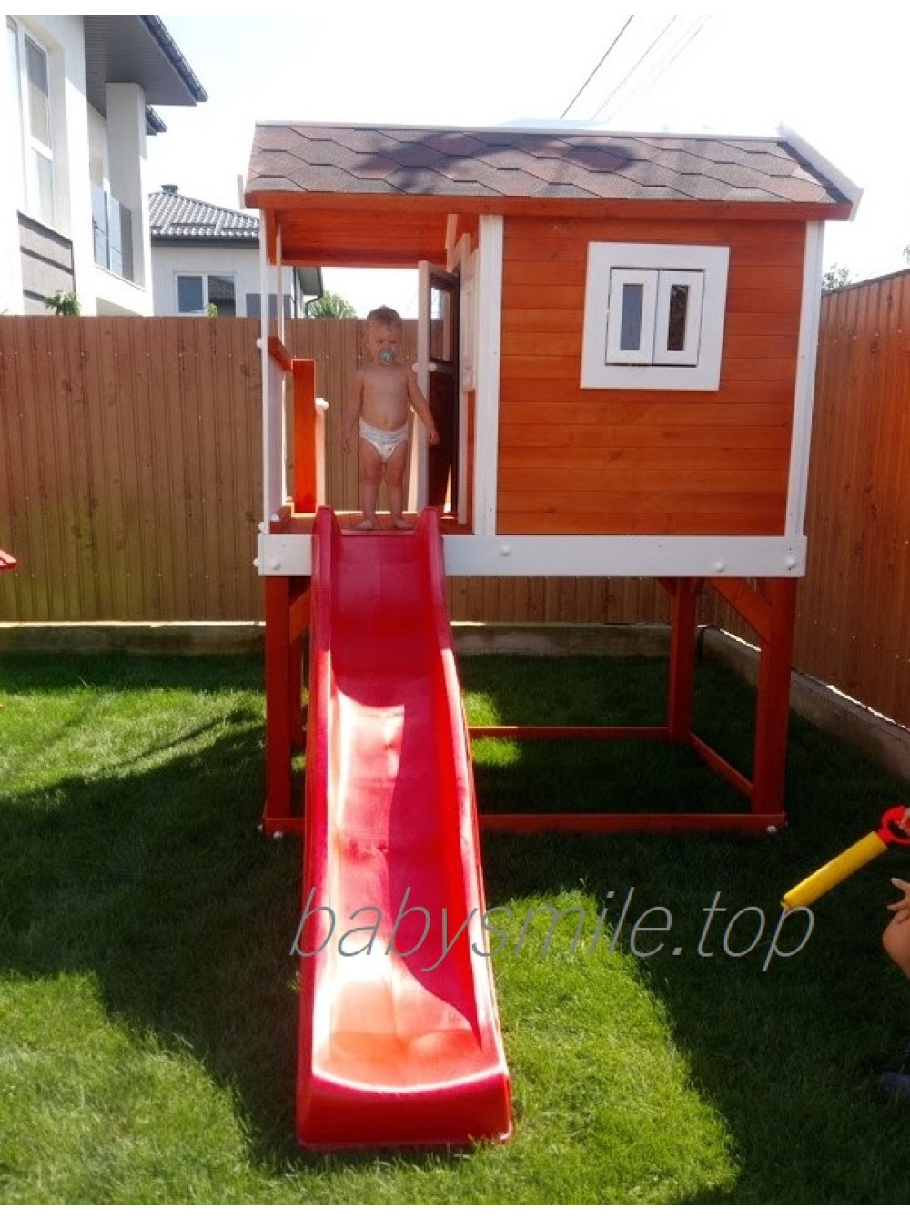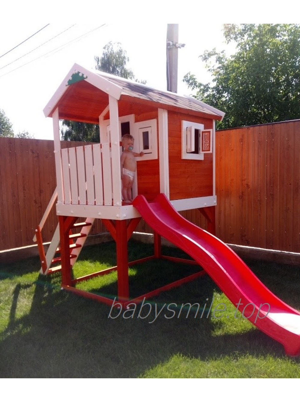 З таким ігровим будиночком вашій дітворі не буде нудно жодну хвилину. Конструкція стоїть на палях і має сходи і спуск, які можна прикріпити як ліворуч, так і справа.