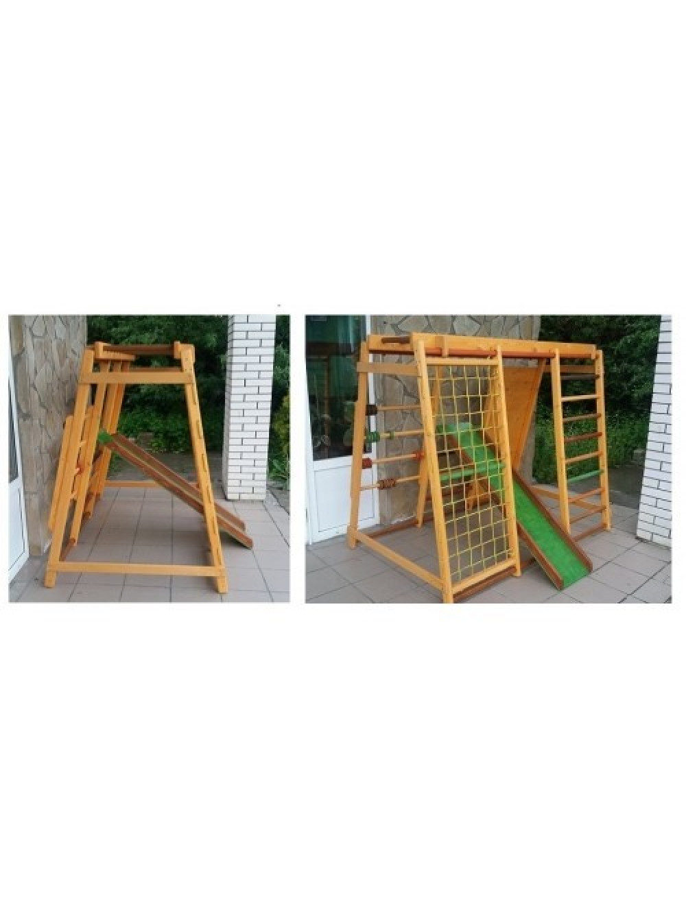 - міні-майданчик для домашнього використання. Поставте його у дворі своєї дачі і, ось побачите, він неодмінно зацікавить вашого малюка! У такому невеликому виробі вдало поєднані декілька секцій для зайняття і ігор - гладіаторська сітка, шведська драбинка, сходи, рукохід, скалолазка. Так, непомітно, спеціально не роблячи ніяких комплексів вправ, в ігровій формі, ваша дитина щодня зможе масажувати стопи ніг, змінюватиме усі групи м'язів і черевний прес, що в майбутньому допоможе уникнути ускладнень у формуванні і розвитку хребта і, відповідно, внутрішніх органів. Це такий один позитивний момент, який торкається здоров'я.