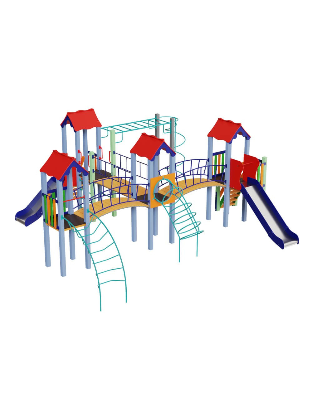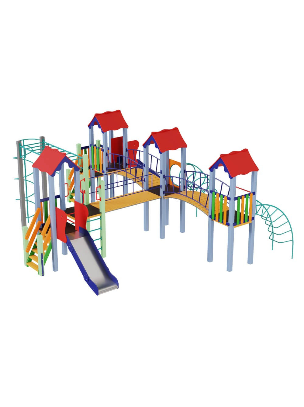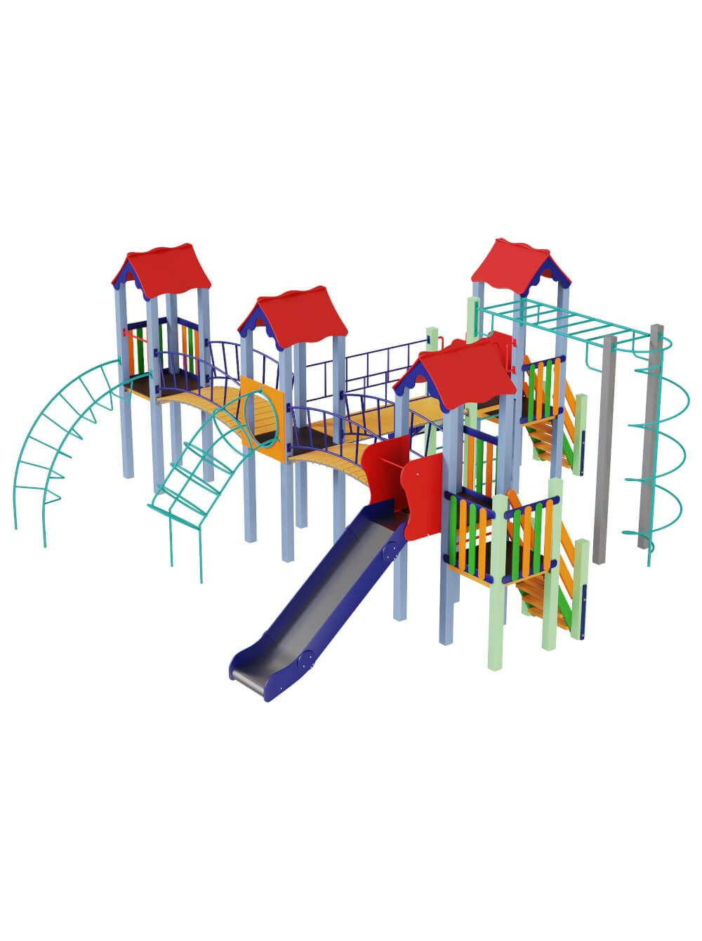 Ігровий майданчик вуличний Замок сподобається всім дітям без винятку завдяки великій кількості спортивних елементів, з яких складається ця модель. А це 4 платформи і вежі, 3 опуклих містка, рукохід, 2 дитячих гірки, лазалки-ліани, лазалки-тунелі. Комплекс призначений для діток у віці 6-12 років з вагою користувача не більше 80 кг.