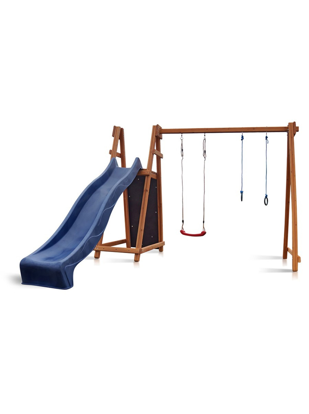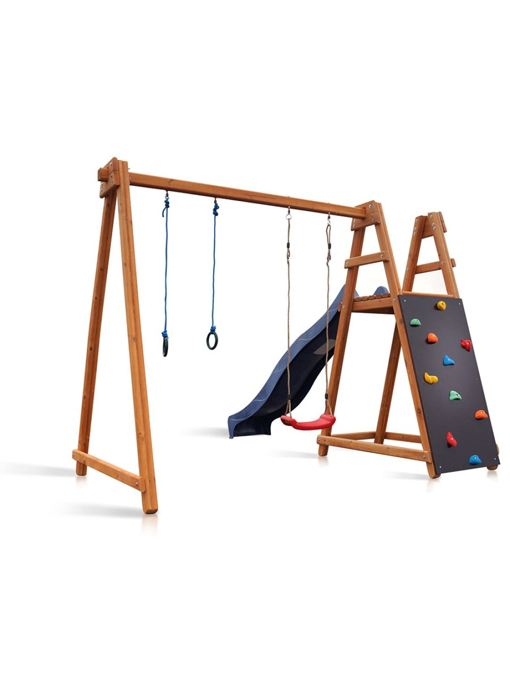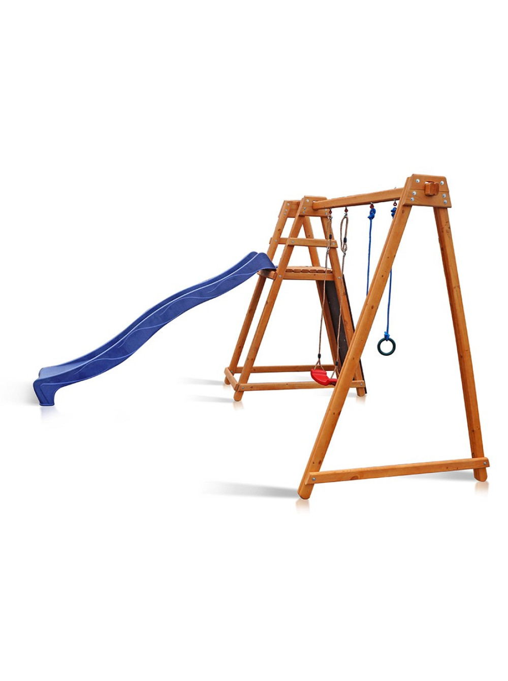 Майданчик з гіркою, гойдалок, гімнастичними кільцями і скелелазом буде притягувати дітей будь-якого віку, навіть підлітків. Можна проявити фантазію і додати до неї ще пару ігрових елементів, наприклад баскетбольне кільце або дартс з м'якими м'ячиками. Дерево просякнуте спеціальним антисептиком, тому не покривається грибком або цвіллю і що, відповідно, подовжує термін використання конструкції.