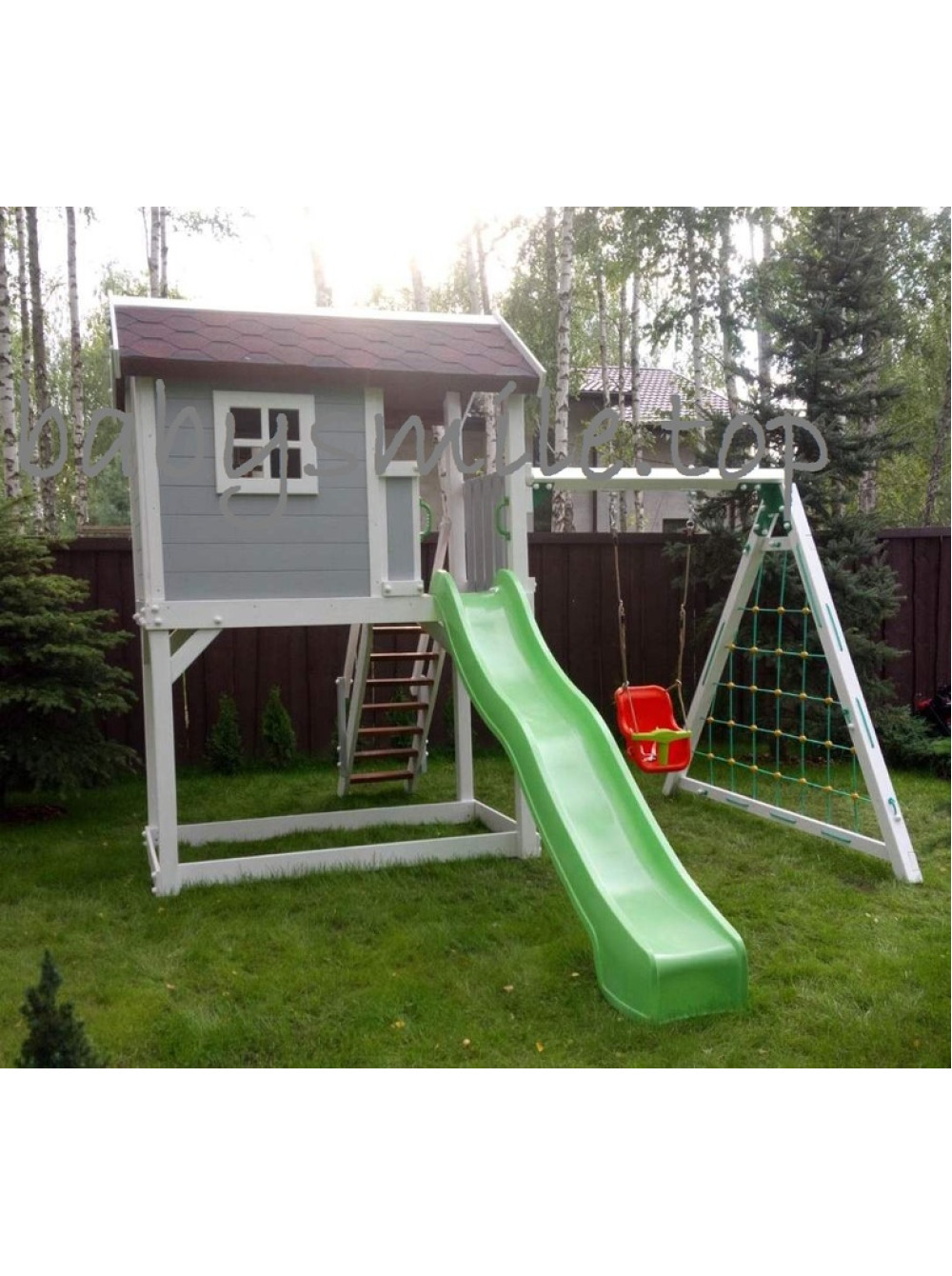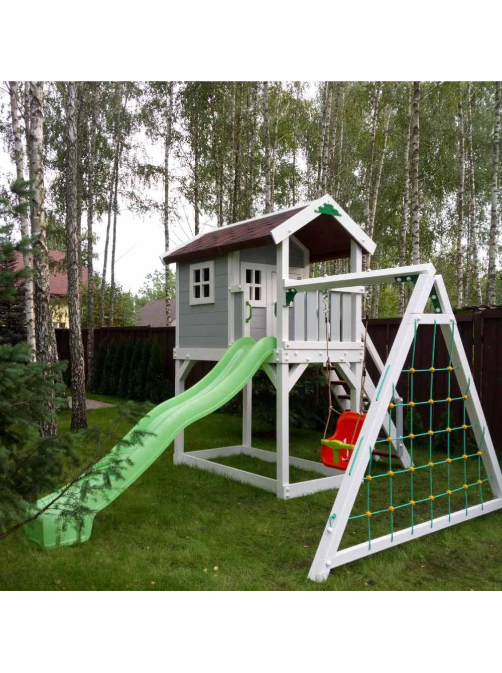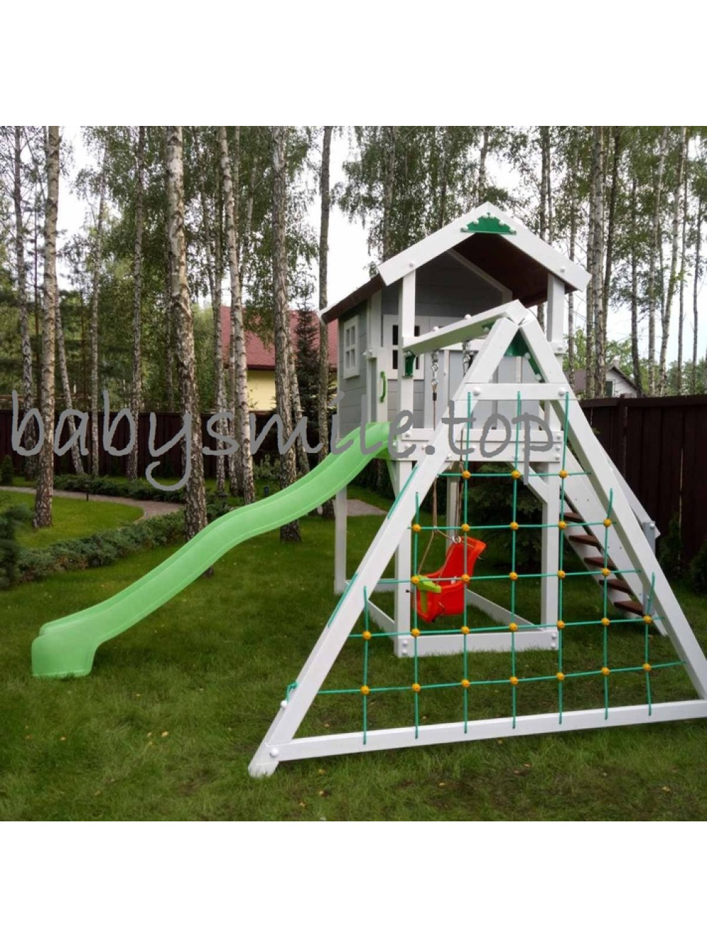 Будиночок дерев'яний з гойдалкою і гіркою Spielplatz виконаний в пастельних тонах за індивідуальним замовленням нашого покупця. Під будиночком розташовується пісочниця.