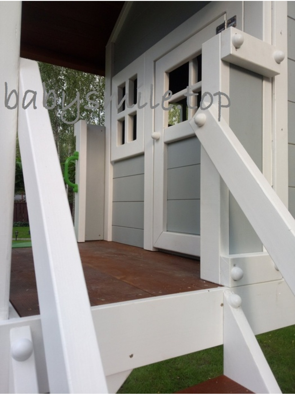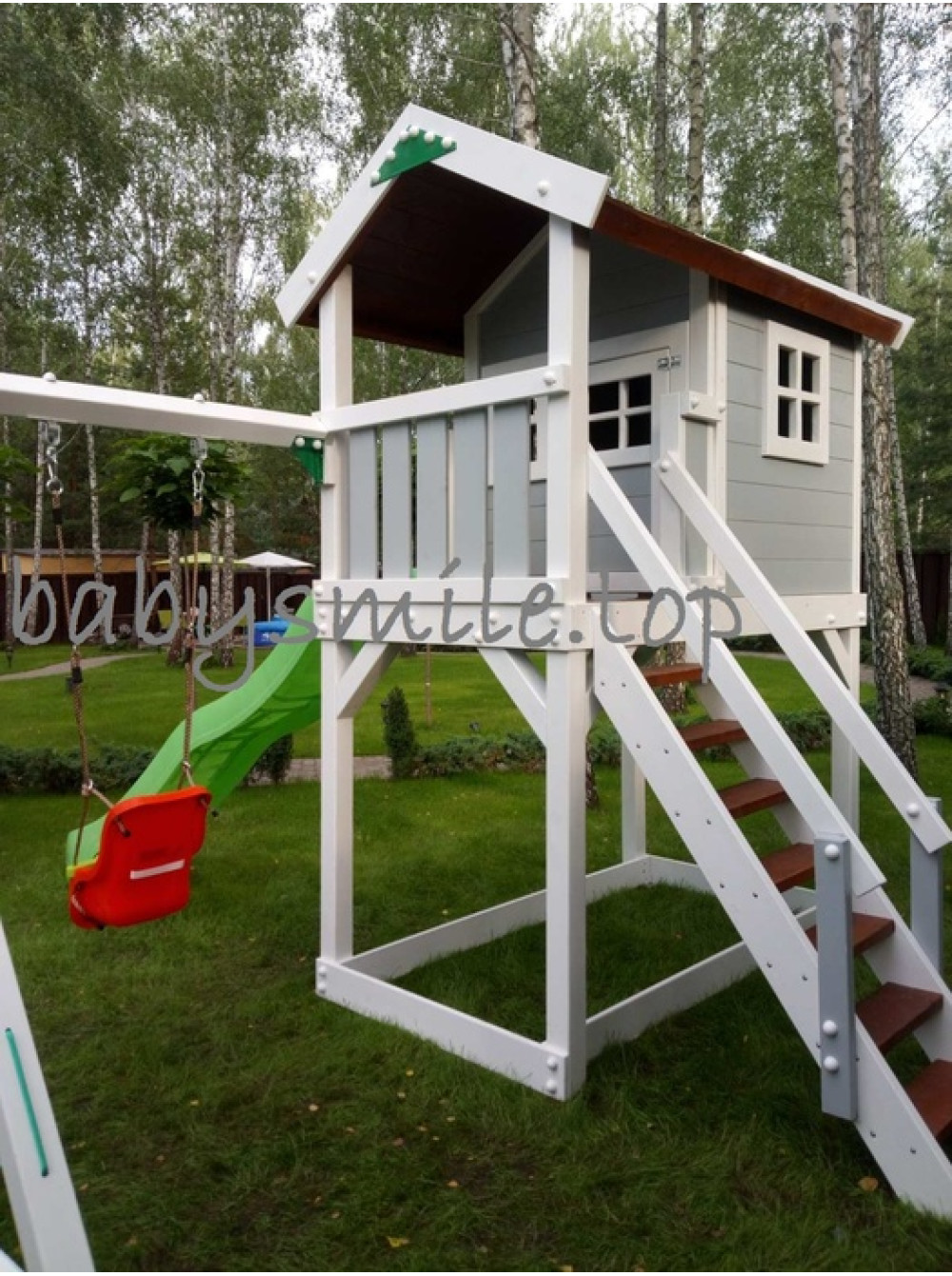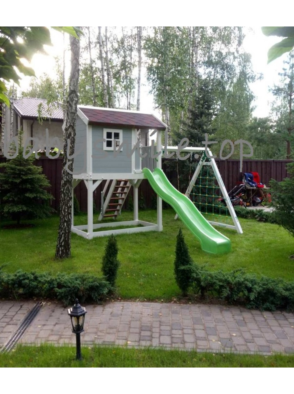 Будиночок дерев'яний з гойдалкою і гіркою Spielplatz виконаний в пастельних тонах за індивідуальним замовленням нашого покупця. Під будиночком розташовується пісочниця.