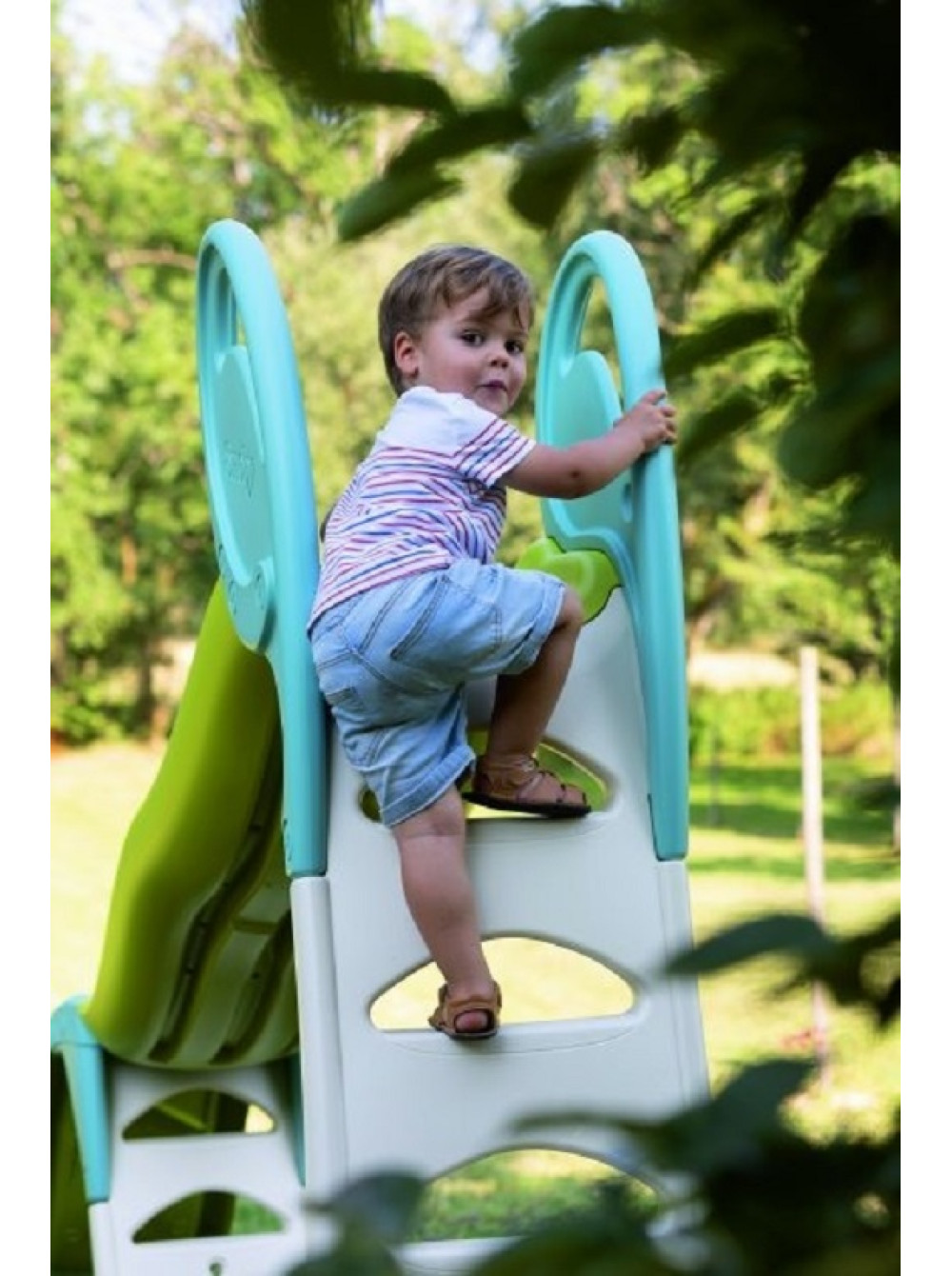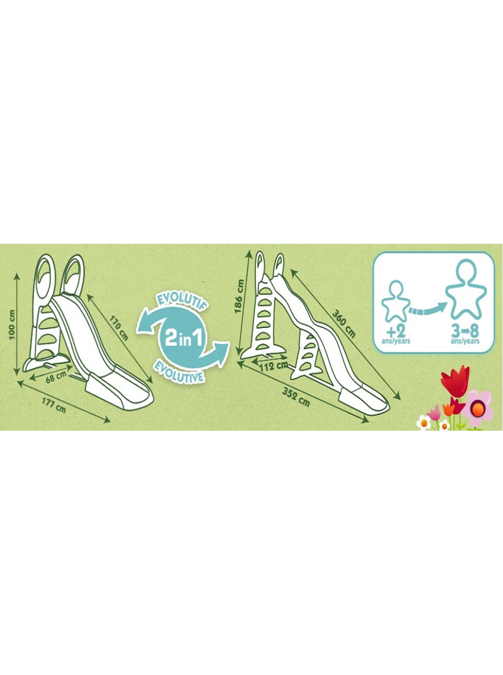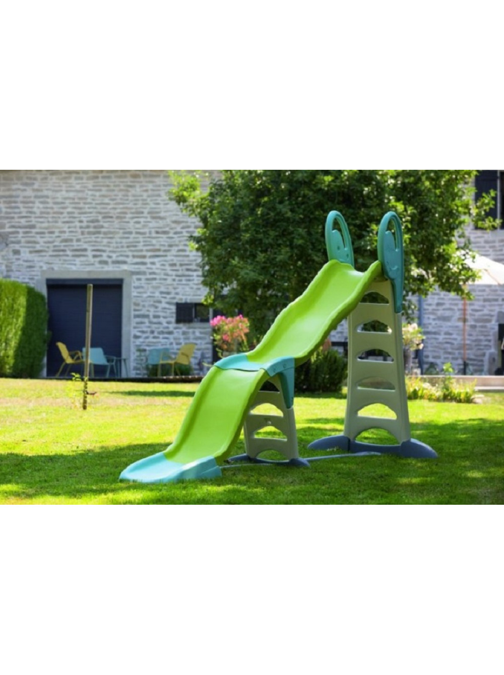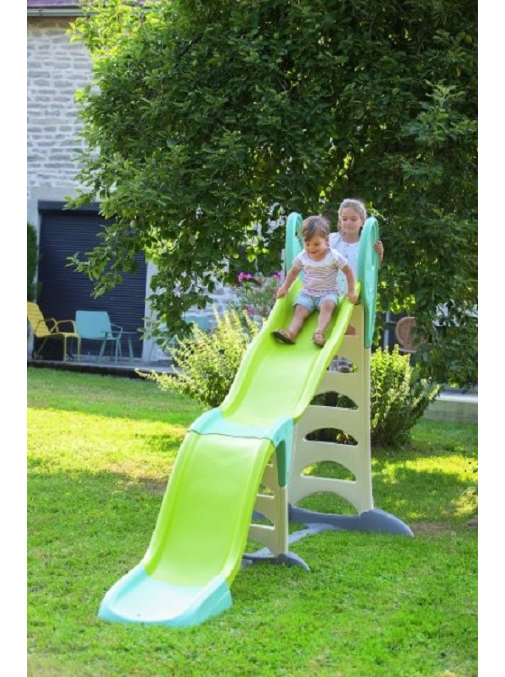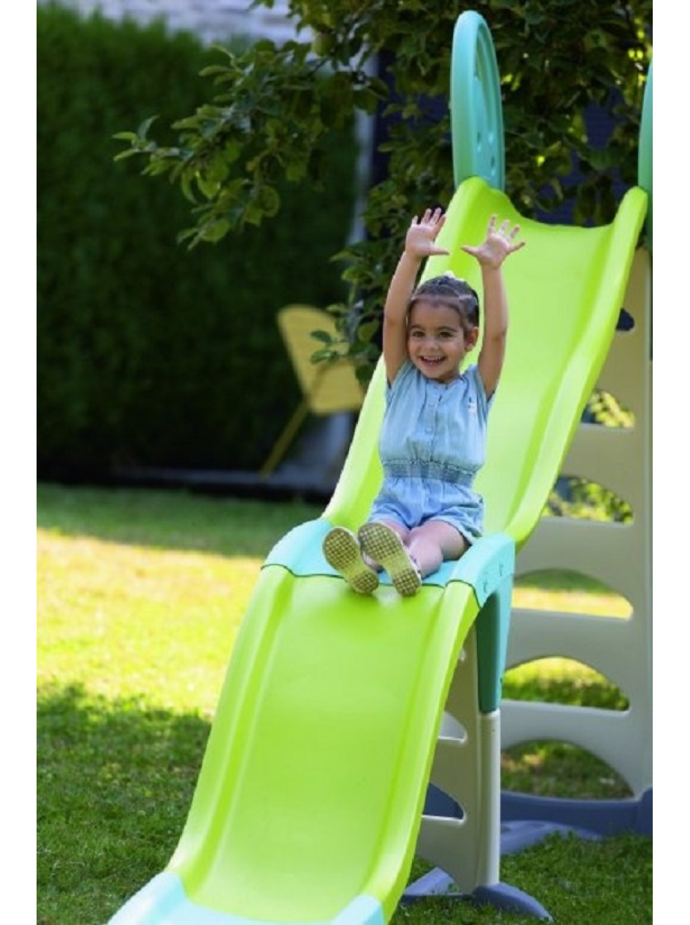Гірка має два модуля і її висота регулюється від 70 см до 180 см, тому вона ідеально підходить як для дітей старшого віку так і для малюків. Також в основу спуску можна підвести шланг з водою, яка буде стікати по гірці, тим самим збільшуючи ковзання. Особливо актуальною ця функція буде в спекотний сонячний день.