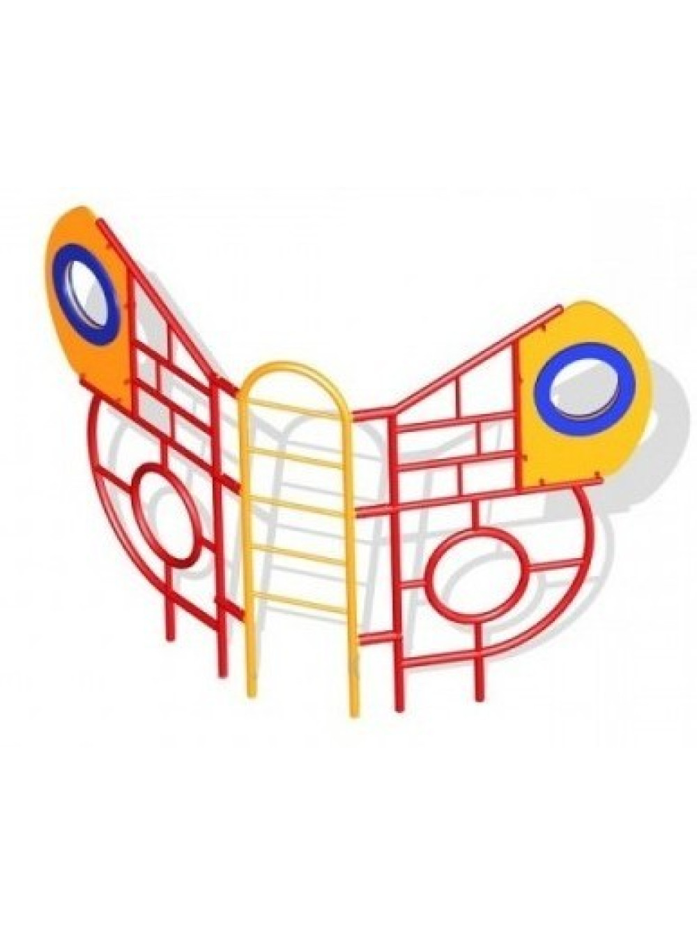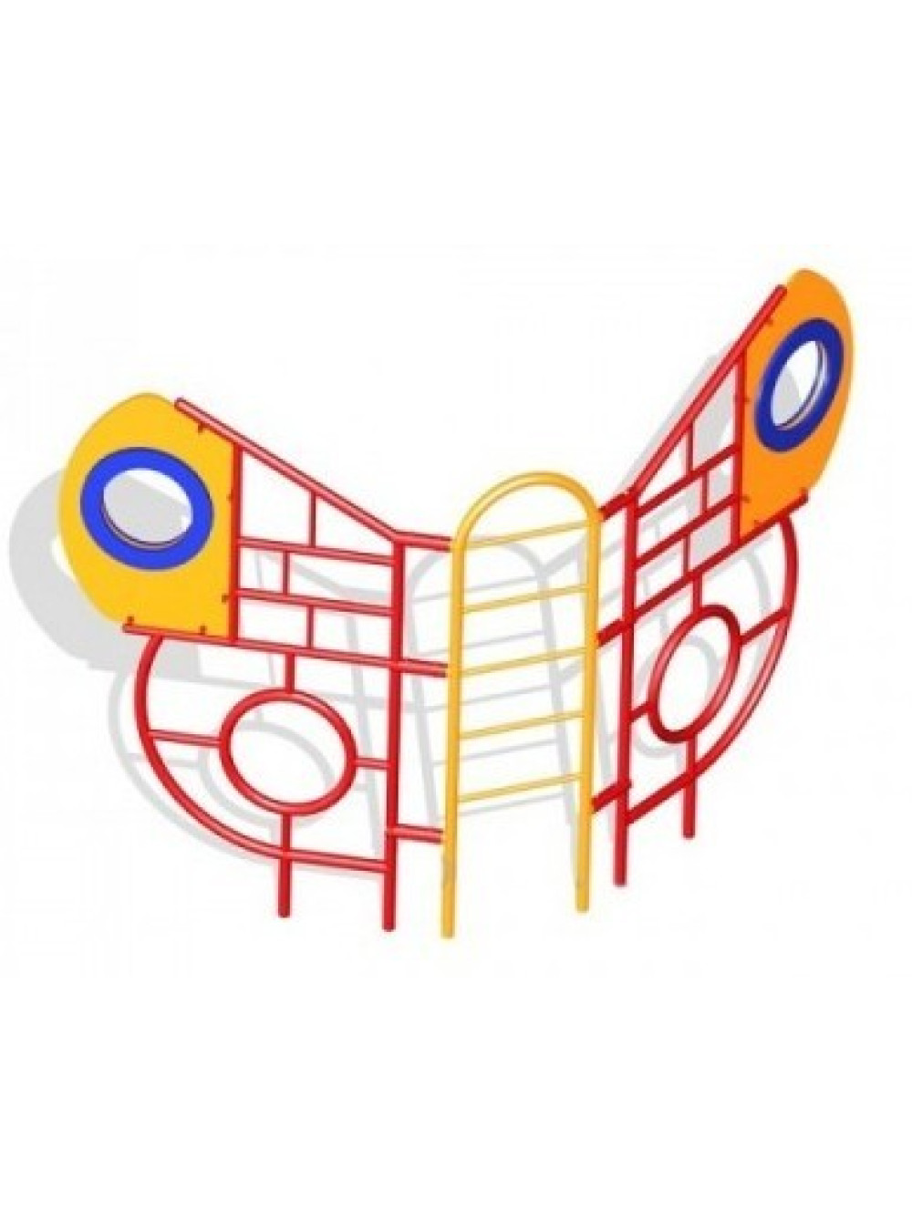 Спорткомплекс ігровий металевий Метелик досить оригінальна, красива і нарядна модель для установки в спортивній або ігровій зоні для дітей. Це дуже практичний і надійний варіант комплексу для установки в місцях громадського користування. Виріб виконаний з металевих труб різного діаметра та імітує положення метелика в польоті, в крилах якого безліч лазів, а в спині драбинка.