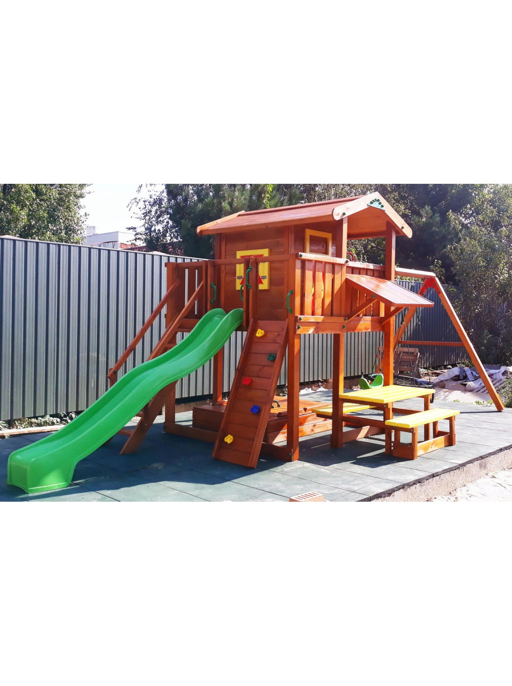 Дерев'яний майданчик Spielplatz-4 - чудовий ігровий будиночок з великою терасою, столом з навісом і двома лавками, пісочницею з кришкою, яка при відкритті трансформується в дві лавки.
