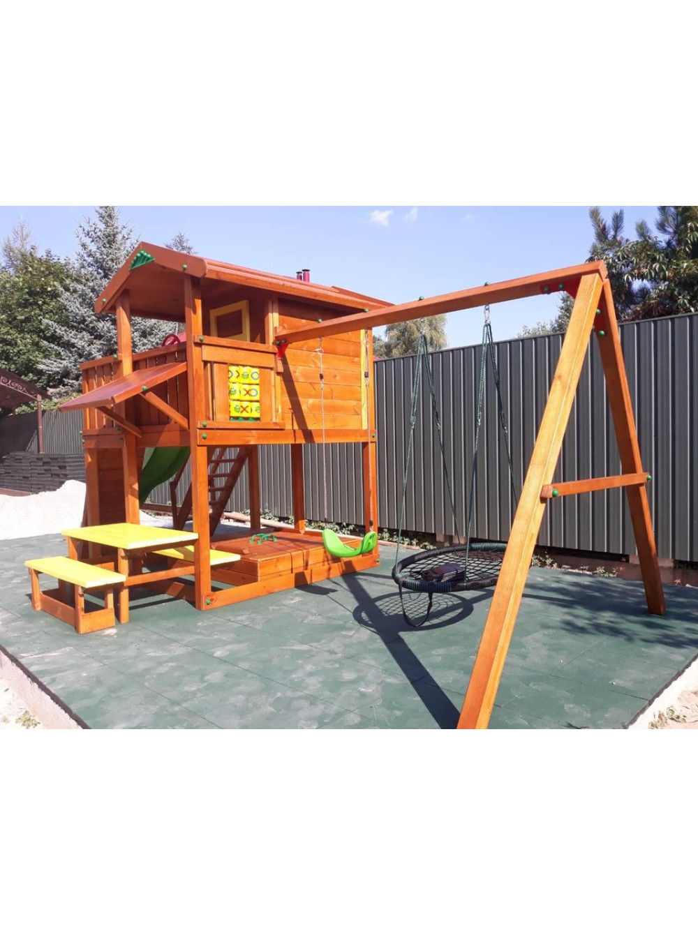 В комплекті пластикова гірка, скелелаз, гойдалка пластикова і гойдалка - гніздо лелеки. Комплекс витримує навантаження до 250 кг.