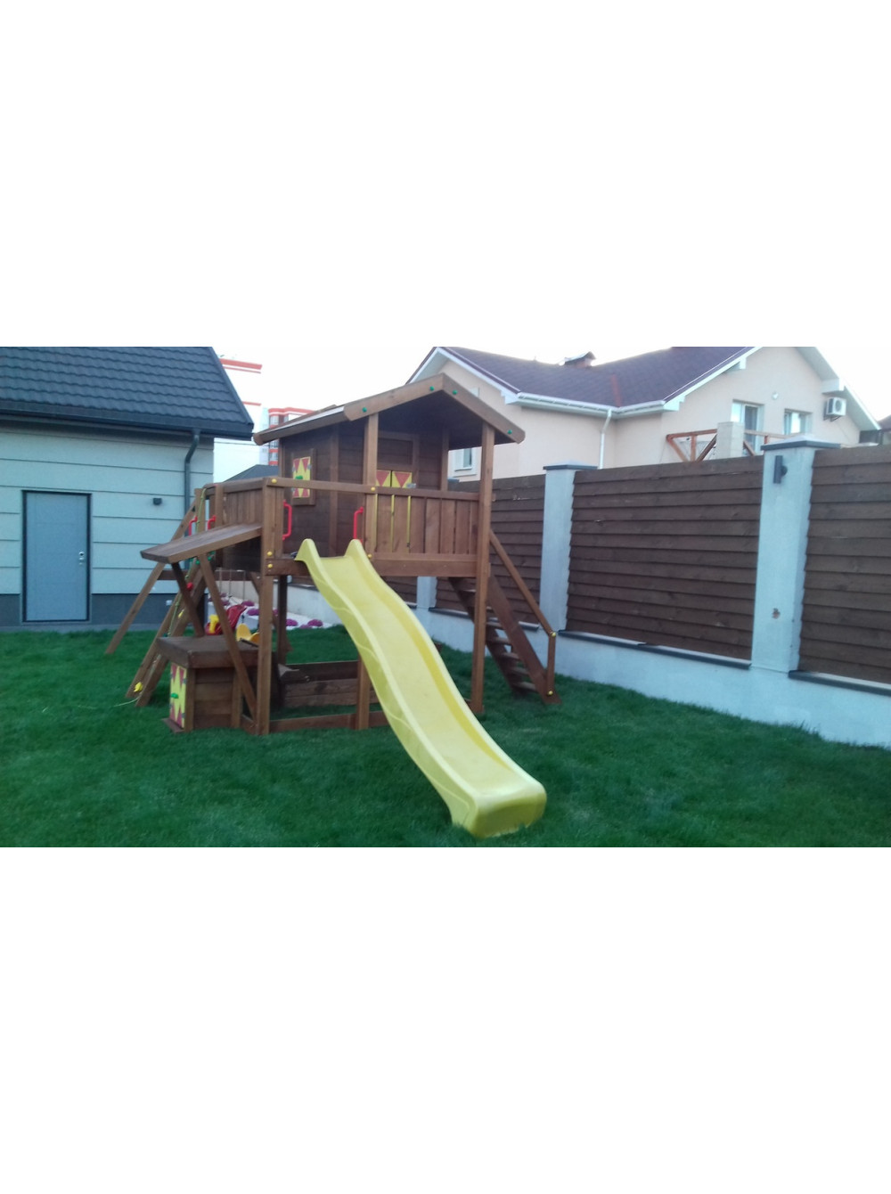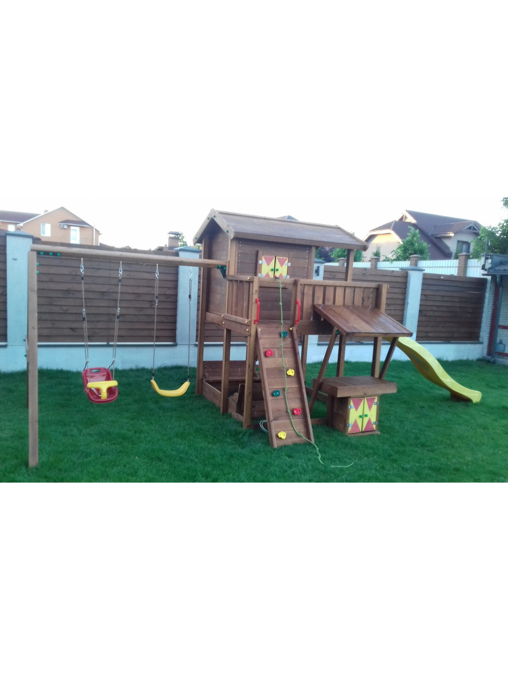В комплекті Пластикова гірка, скелелаза, дві гойдалки пластикові. Комплекс витримує навантаження до 250 кг.