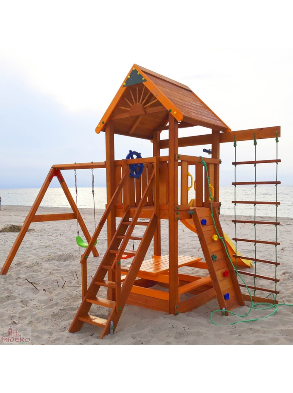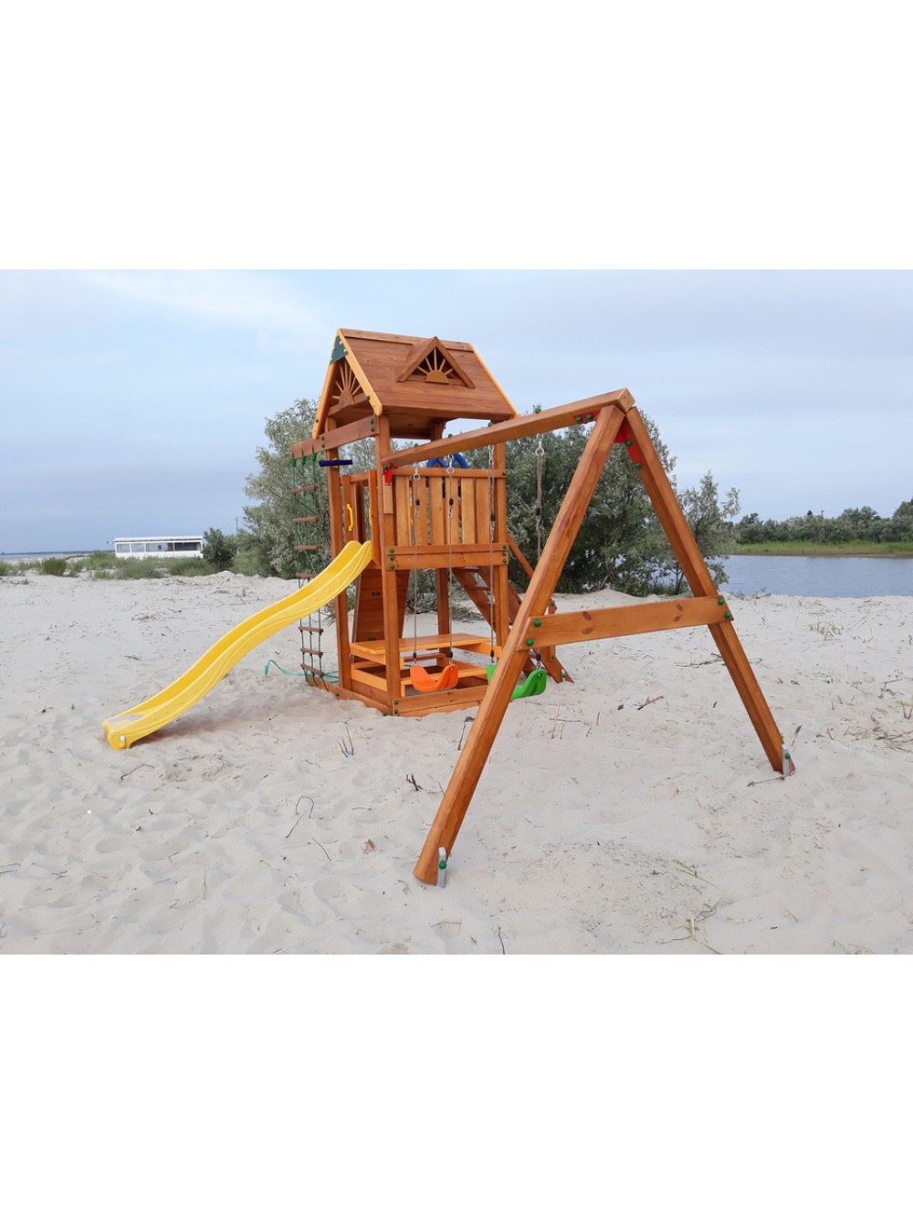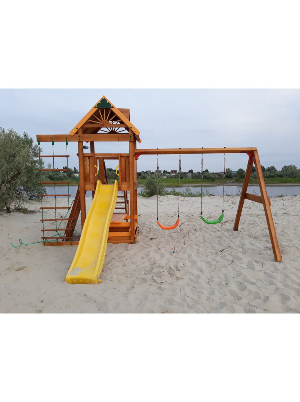 В комплекті Пластикова гірка, дошка скелелаза з зачіпками, дві гойдалки пластикові, канатна драбинка. Комплекс витримує навантаження до 250 кг.