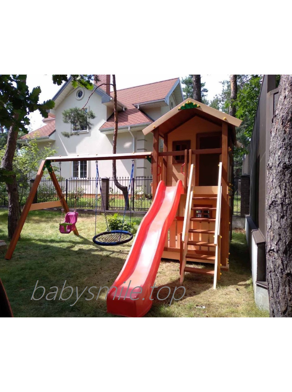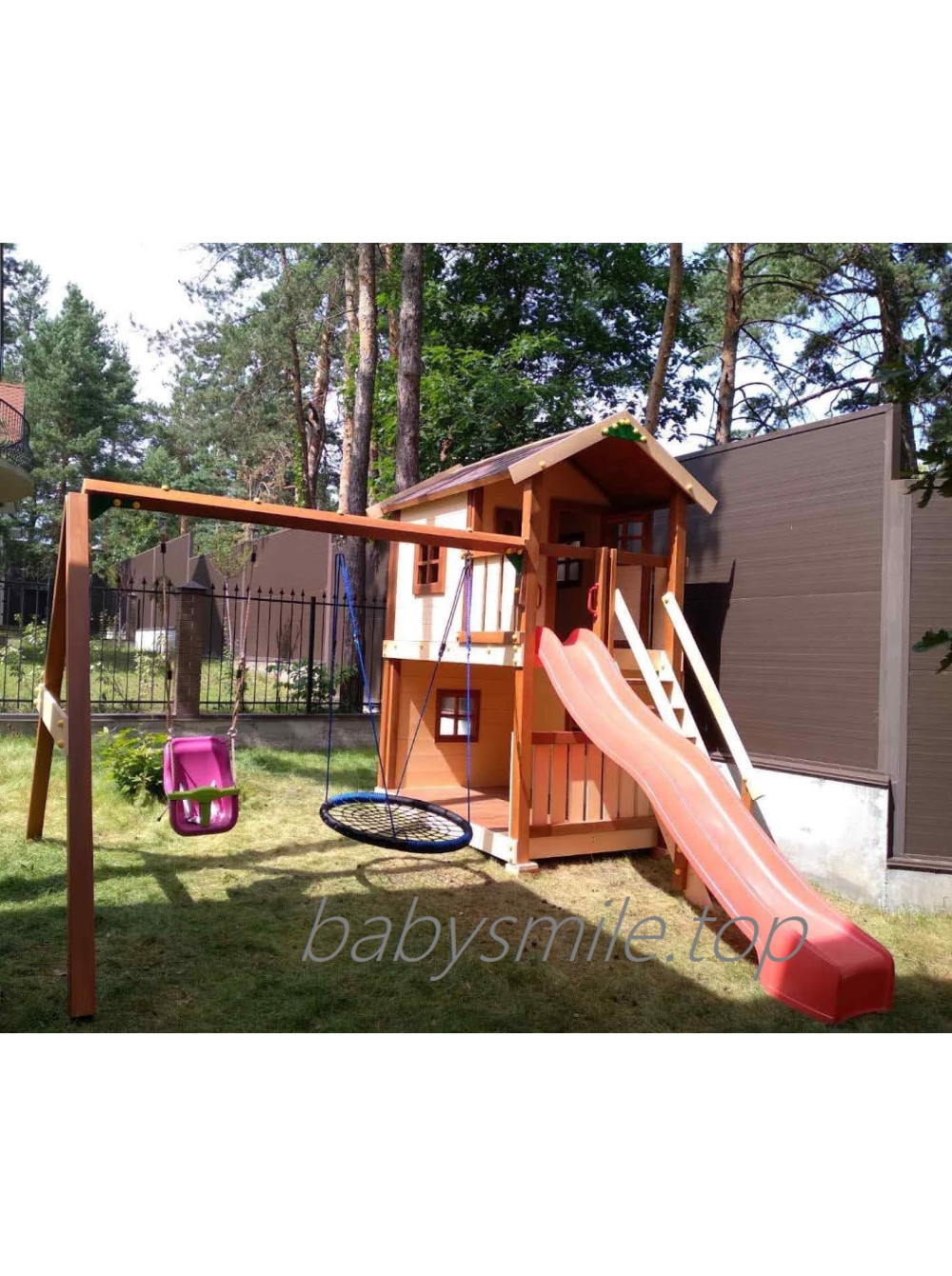 Дерев'яний майданчик Spielplatz - 27 з гойдалками - відмінний ігровий комплекс, виготовлений відповідно до індивідуальних переваг замовника. Чудове колірне рішення, функціональне наповнення і дизайн. Нам подобатися, що ця модель двоповерхового будиночка для дітей доповнена двома видами гойдалок : з обмежувачем для малюків і "гніздо лелеки". А ще на першому поверсі вийшла зручна веранда, яку завжди можна доукомплектувати столиком з крамницями або ігровою кухнею.