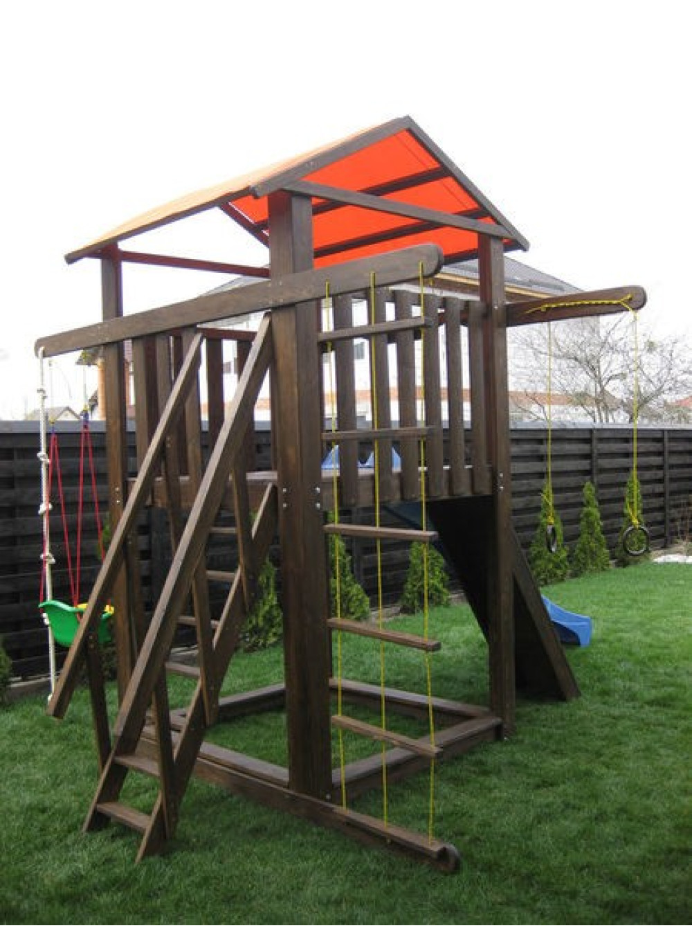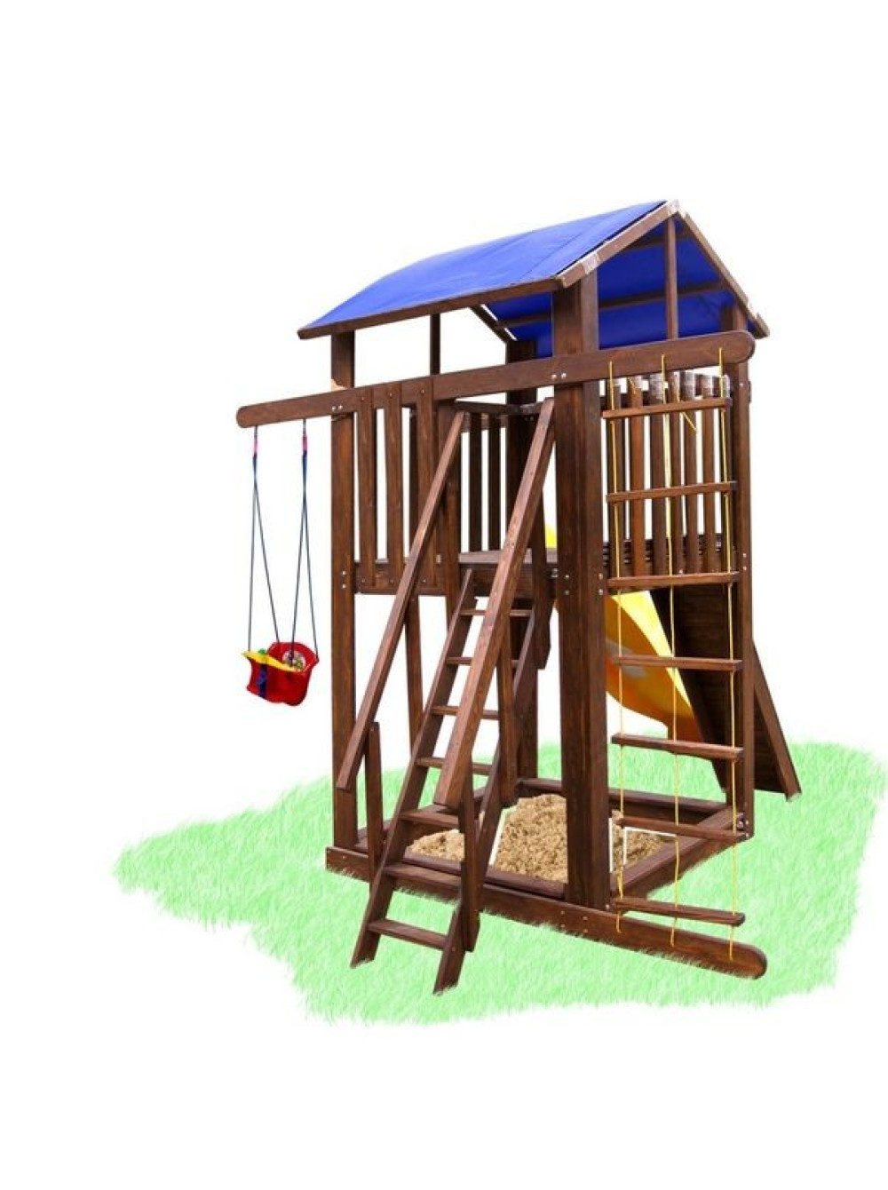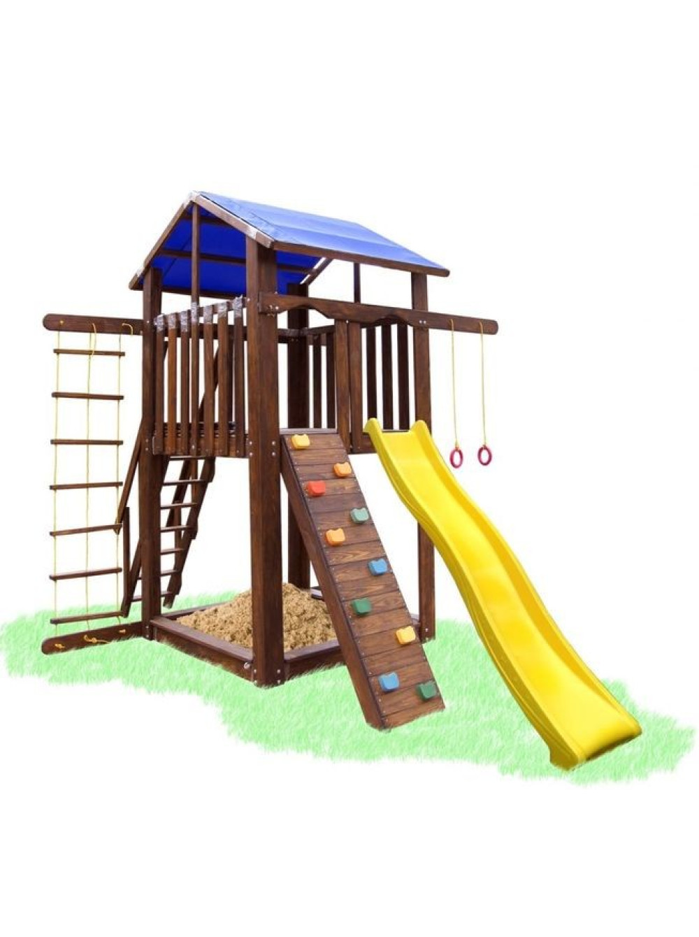 По-перше, він компактний і не займе багато місця, по - друге, пісочниця розташована під ігровим будиночком, що захищає її від дощу та сонця, в третіх, вдала комплектація (гірка, гойдалка, скелелаза, мотузковий набір, пісочниця і ігровий будиночок), все, що допоможе урізноманітнити дозвілля Вашої дитини і його друзів. По-четверте, у виробництві використовується натуральне дерево сосни, сам дотик до якої подарує заряд бадьорості та енергії, зігріє внутрішнім теплом.