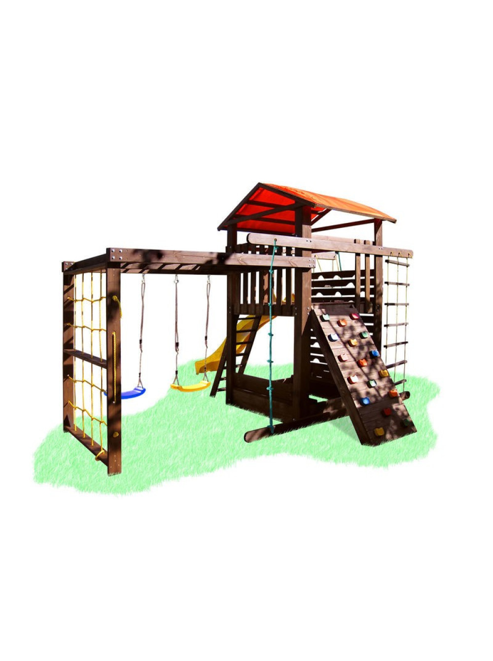Цей ігровий комплекс виготовлений із сосни в  тонуванні кольору Венге, з кольоровою стіною для лазіння. Такий майданчик наповнить простір зарядом позитиву і веселощів, від такого подарунка Ваші діти будуть в захваті.