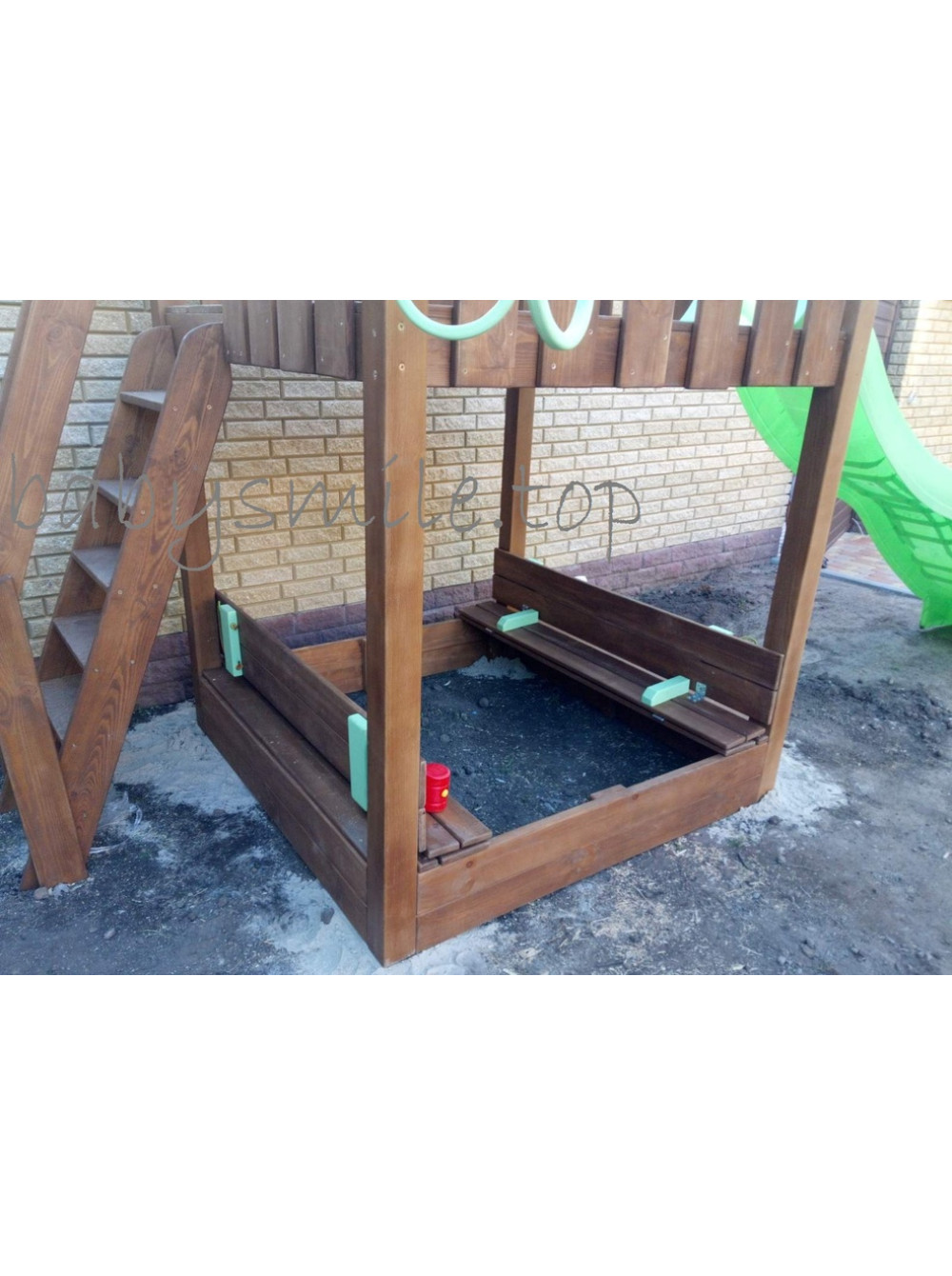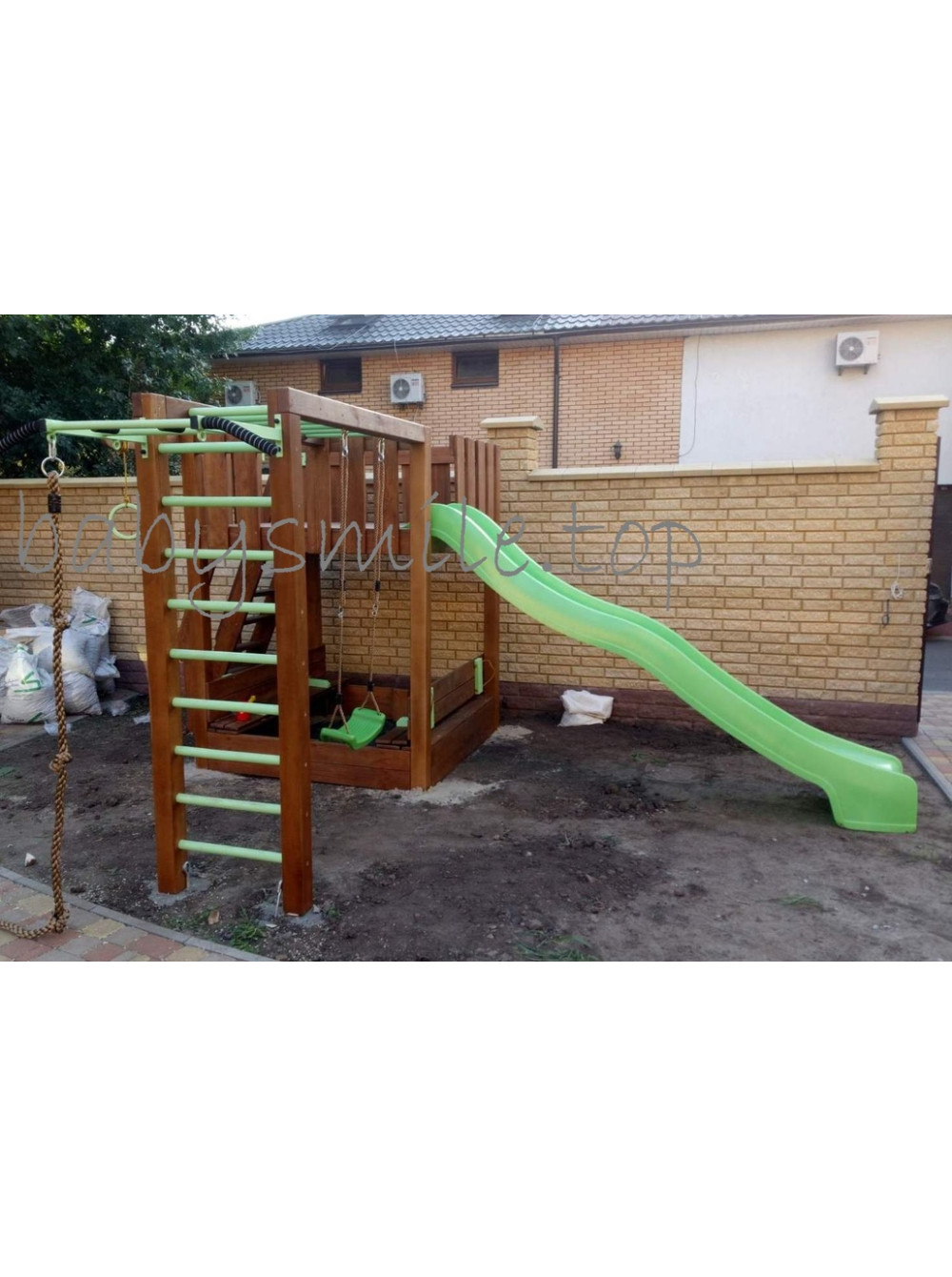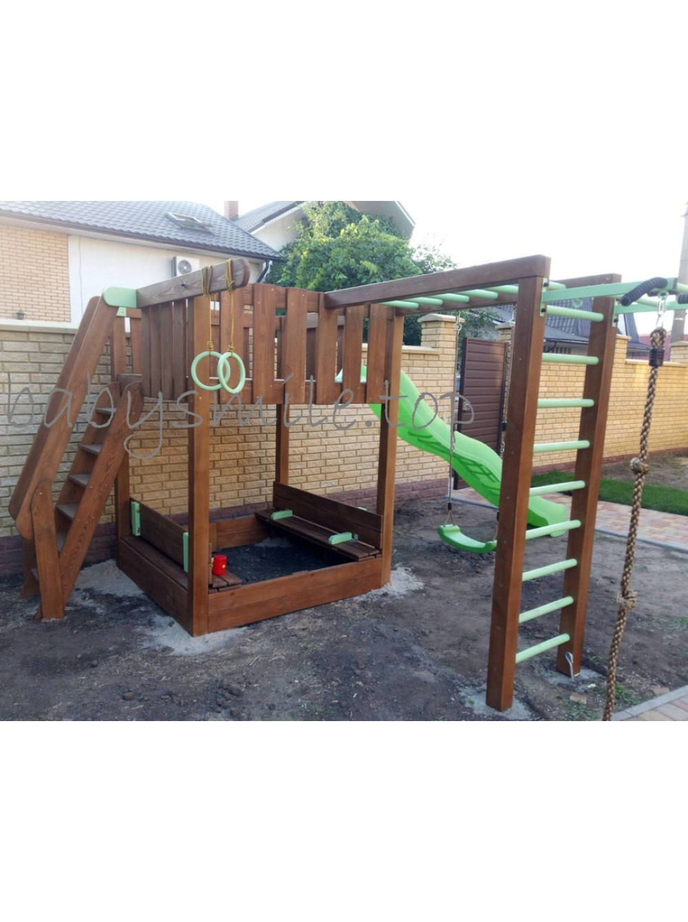 Ігровий майданчик Дача + спортивний куточок - цей ігровий комплкс ми виготовили по индивідуальному замовленню нашого покупця. Конструкція вийшла досить компактною, але в той же час, в наборі усе необхідне для ігор: палуба, пісочниця з кришкою і крамницями, гірка, гойдалки, а для активнішого дозвілля - шведська стінка з канатом і турніком, на якому зможе позайматися і папа.