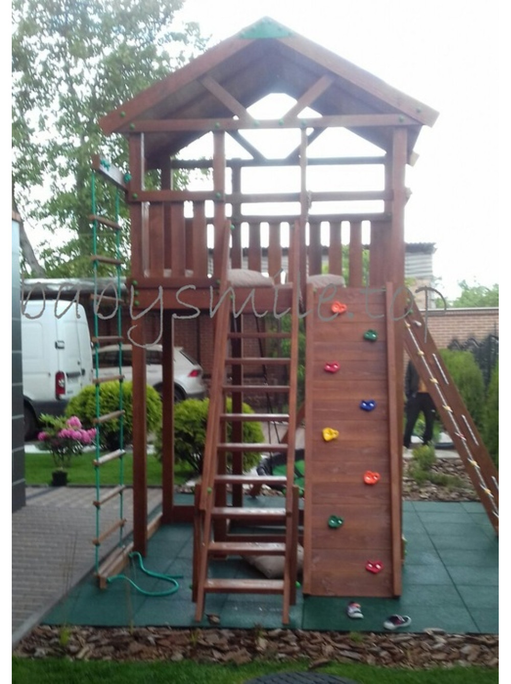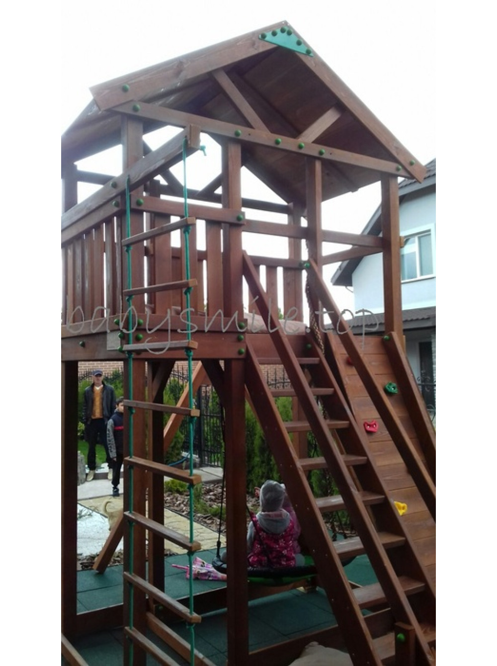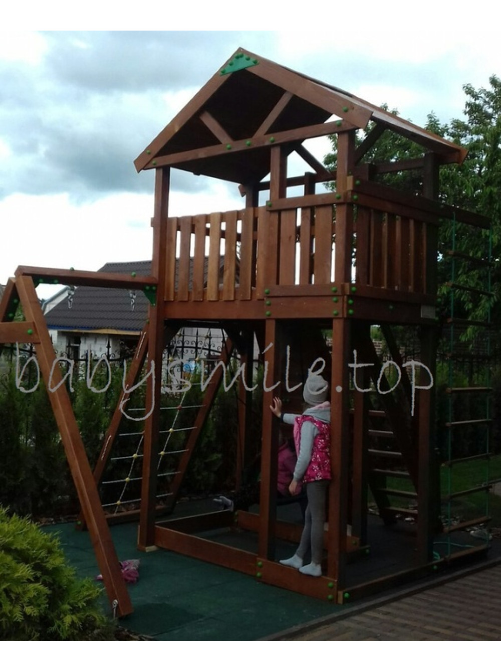 Ігровий майданчик дерев'яний Вежа-20 виконанний відповідно до побажань замовника. Місце для установки - територія житлового багатоквартирного будинку і ділянка була зовсім невелика. Виходячи з ввідних даних ми зупинилися на моделі без гірки для спусків, але з дошкою для скелелазіння, сіткою і двома гойдалками - стандартною ( на фотографії немає, ще не встигли навісити) і гніздом лелеки. Висота платформи вежі - 2 метри.