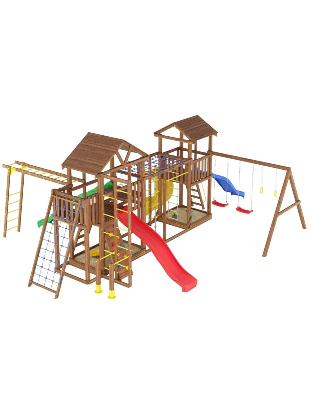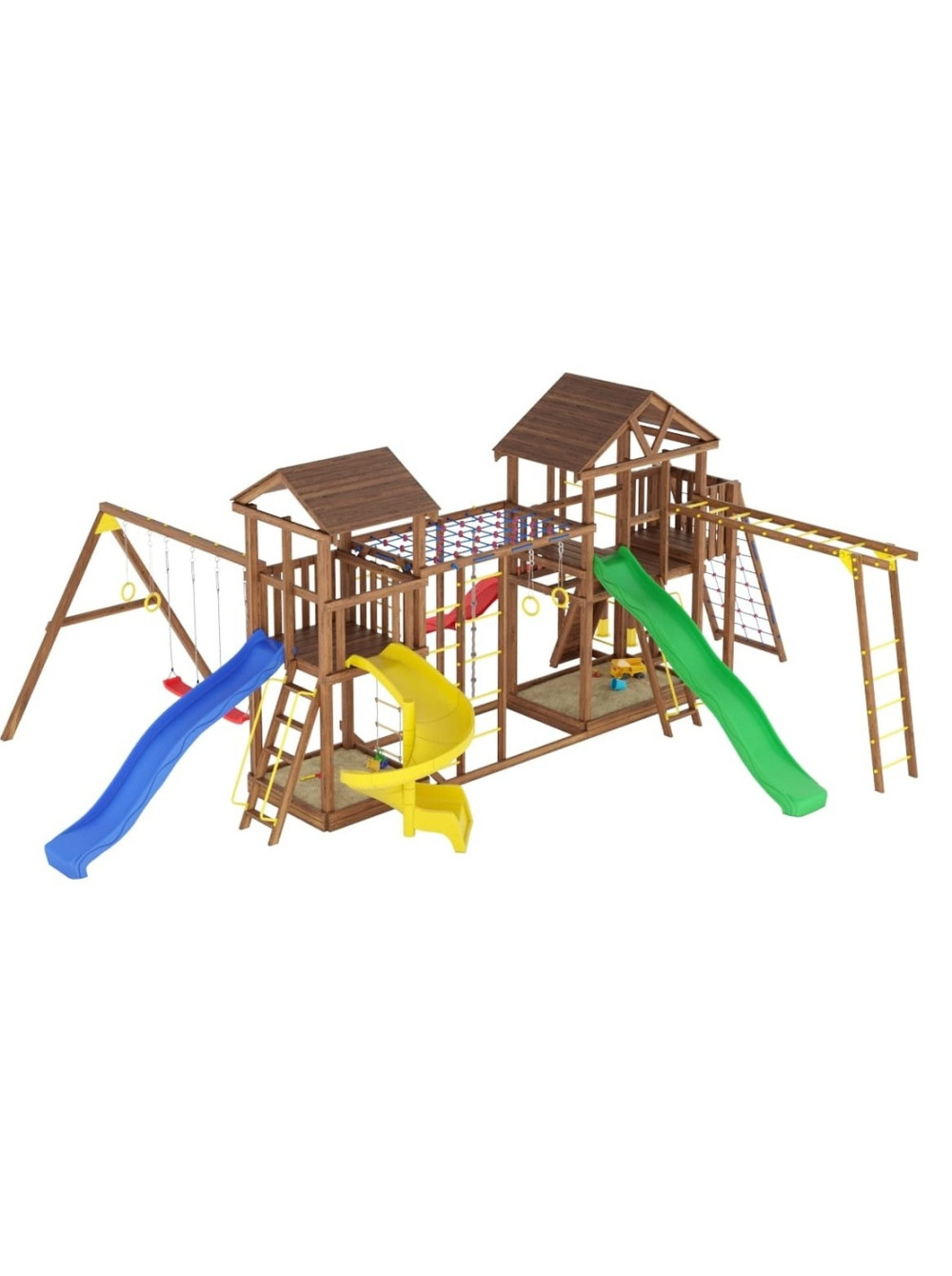 Відмінно підійде для розваг дітей різного віку. Ігровий комплекс має дві вежі, які з'єднані між собою ігровою мотузяною сіткою, доповнений цікавими ігровими та спортивними елементами, також в комплекті чотири пластикових гірки, одна з яких - гвинтоподібна.
