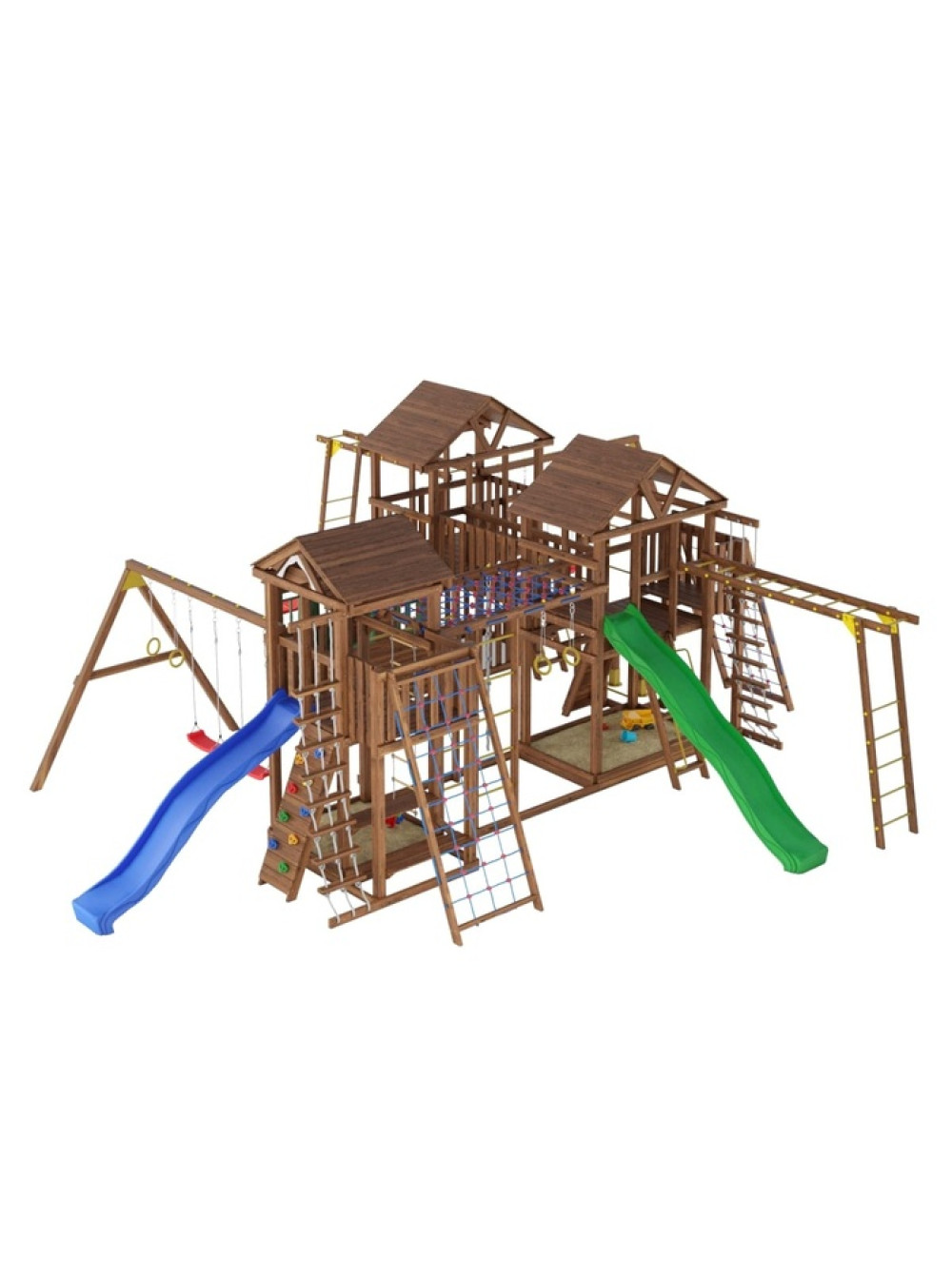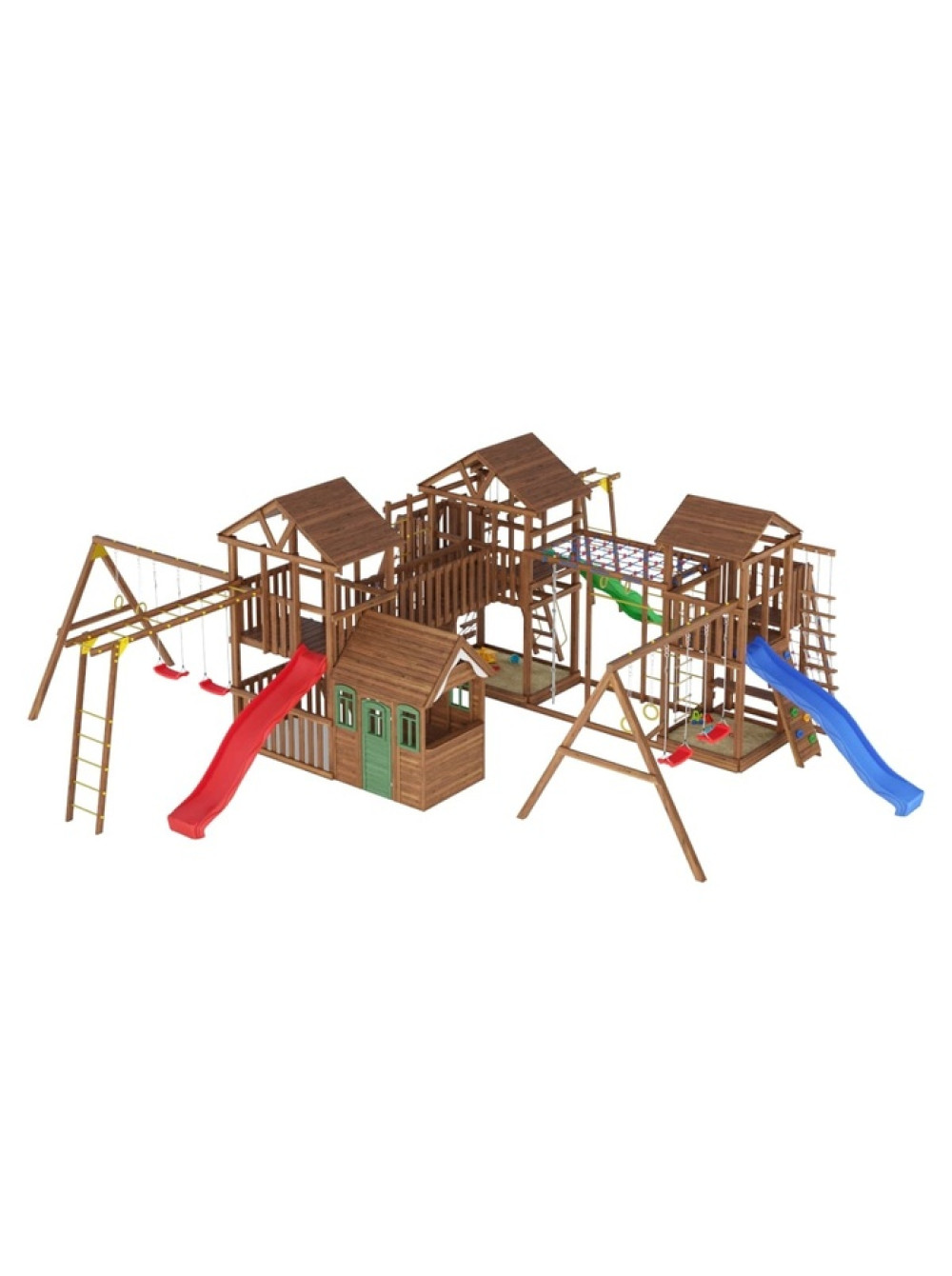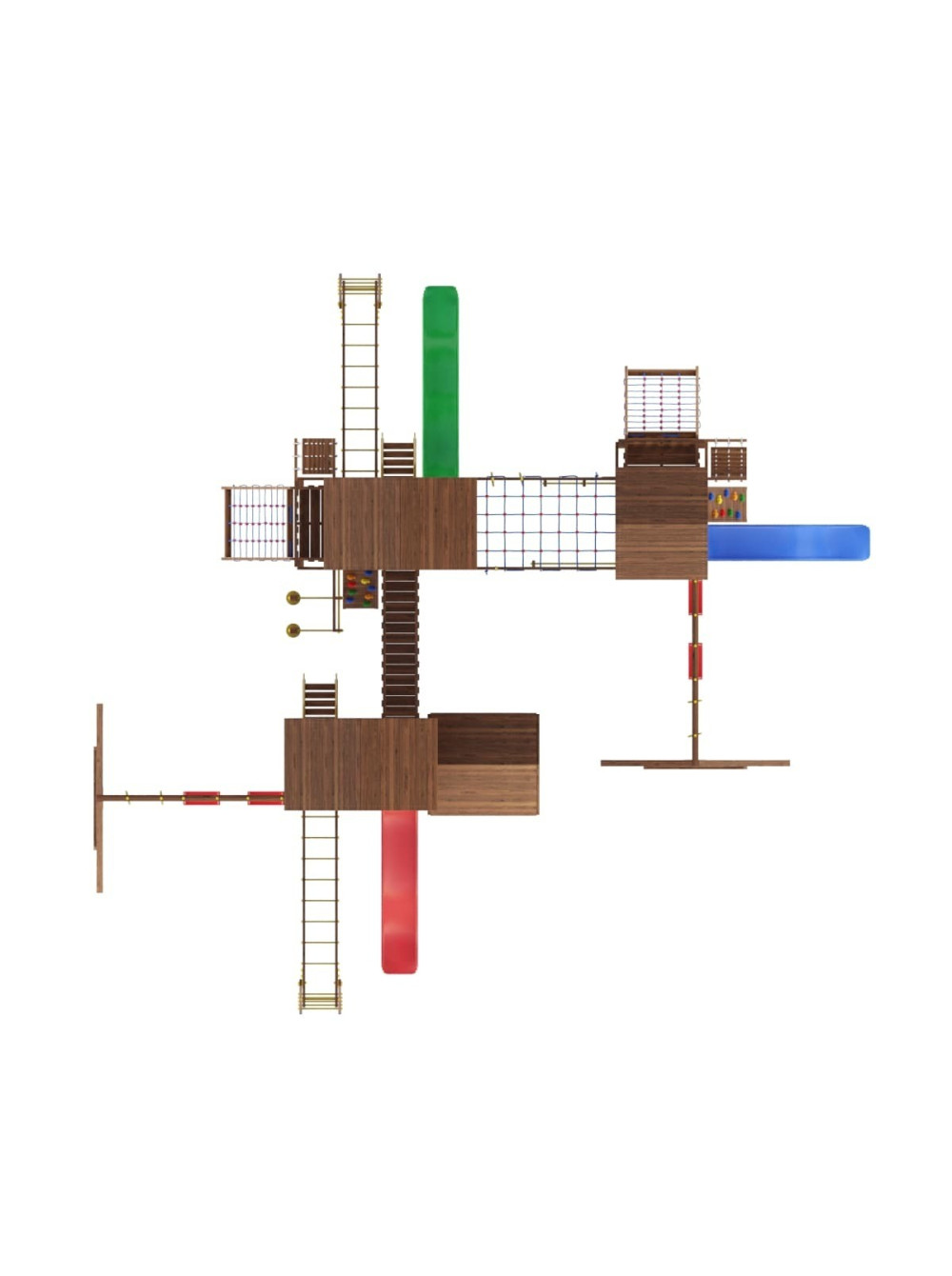 Відмінно підійде для розваг дітей різного віку. Ігровий комплекс має три вежі, які з'єднані між собою підвісним містком і ігровою мотузяною сіткою, доповнений дерев'яним будиночком з верандою, цікавими ігровими та спортивними елементами.