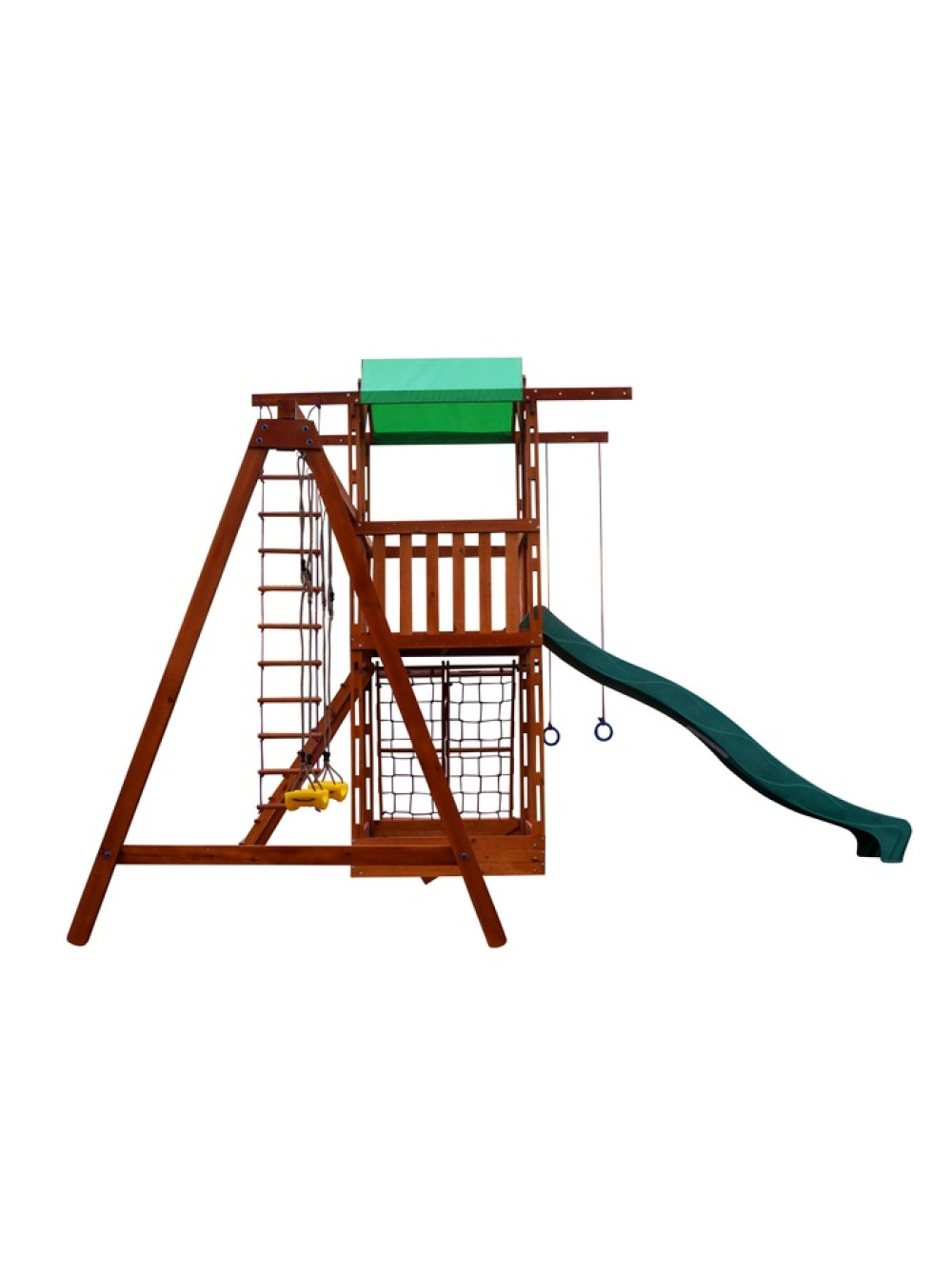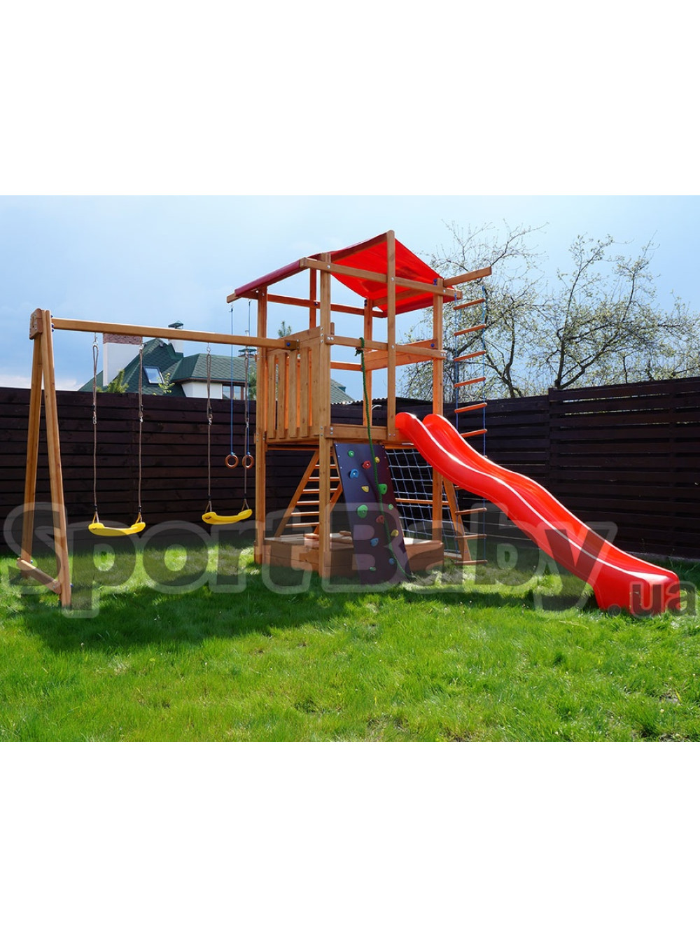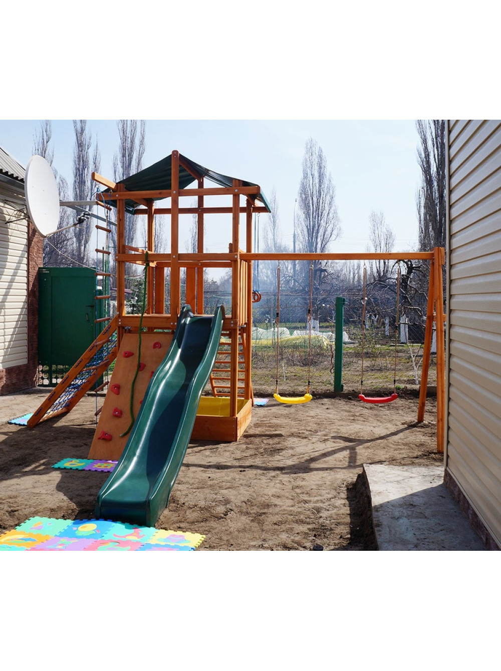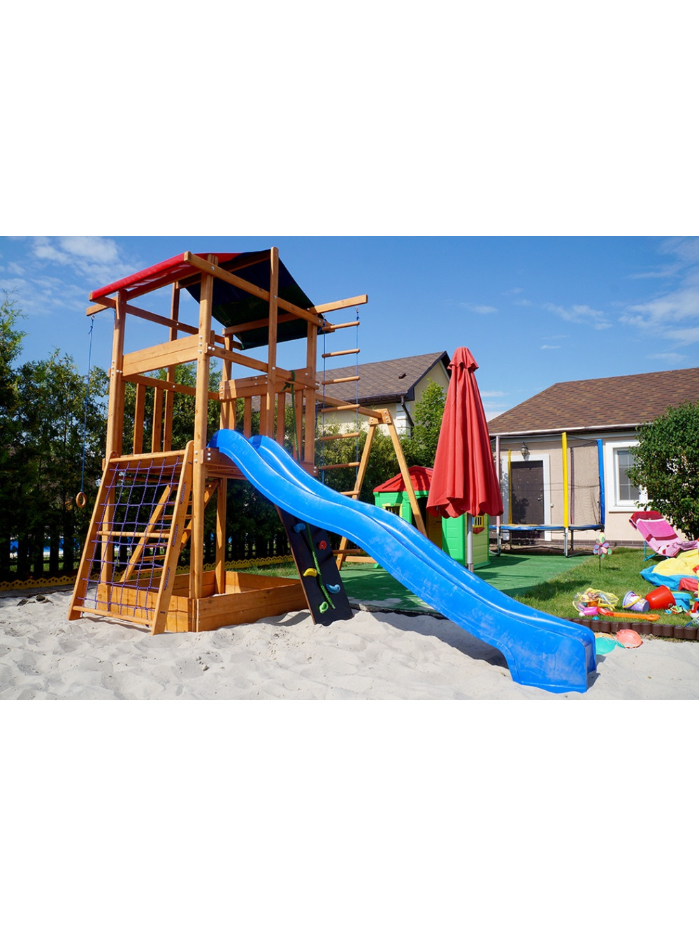 Даний майданчик виконаний з сосни, дерево відшліфовано і оброблено антисептиком, який захищає від появи грибків і цвілі. Колір тентованого даху чудово поєднується з кольором пластикової гірки, вибираєте на свій розсуд.