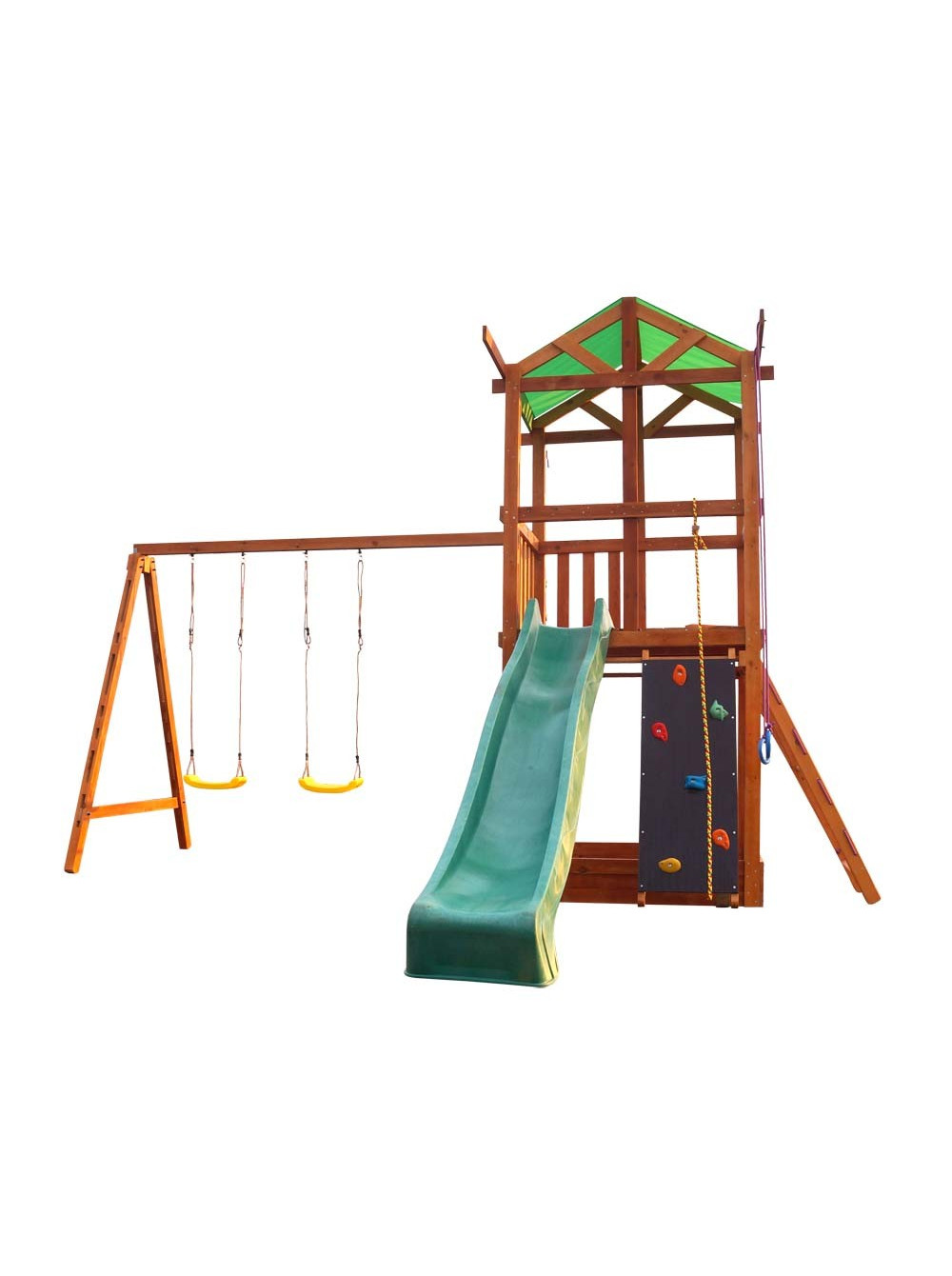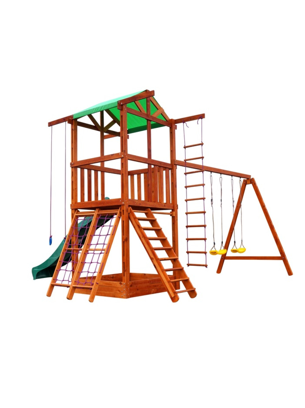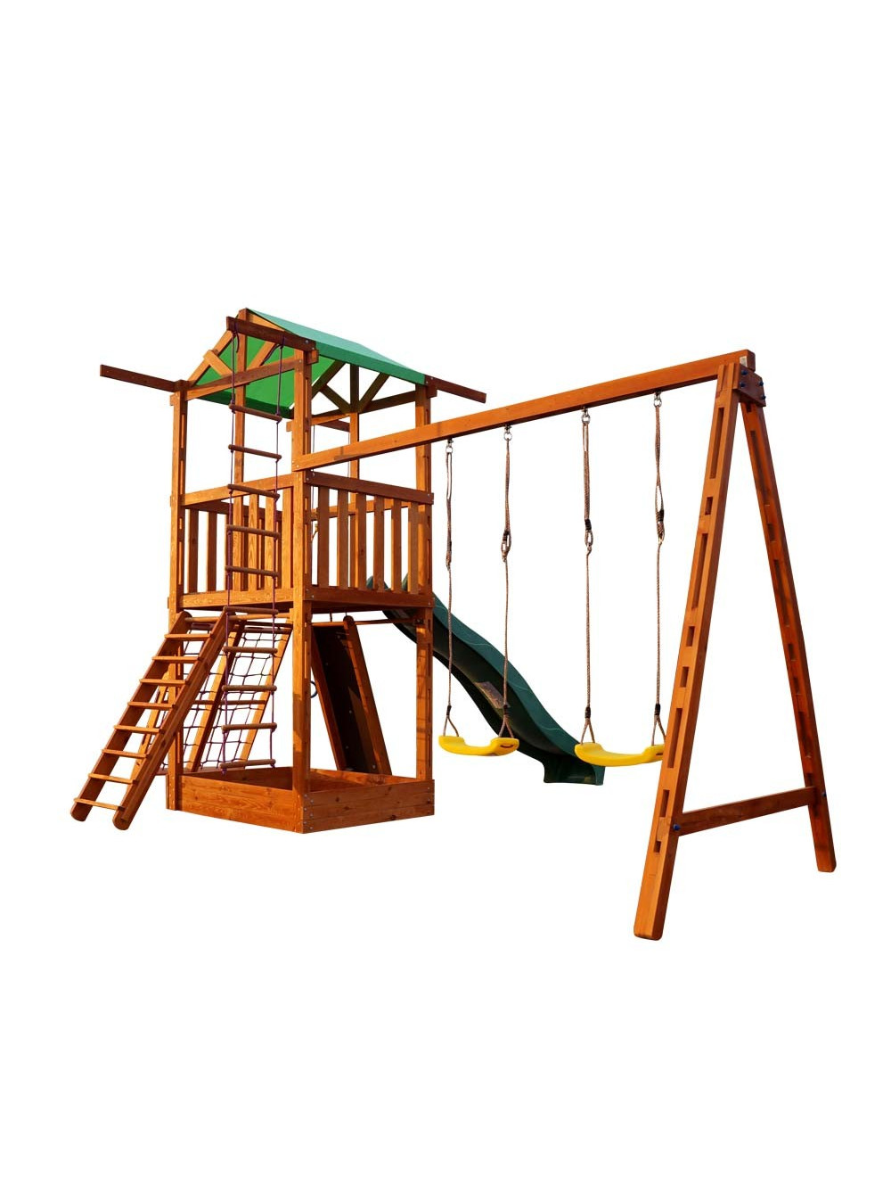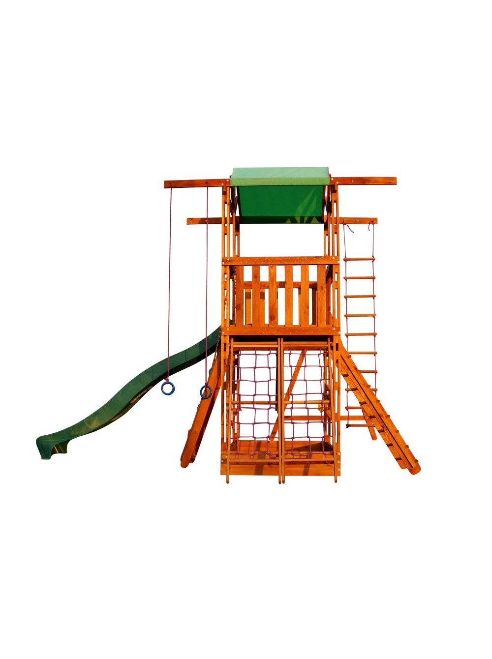 Даний майданчик виконаний з сосни, дерево відшліфовано і оброблено антисептиком, який захищає від появи грибків і цвілі. Колір тентованого даху чудово поєднується з кольором пластикової гірки, вибираєте на свій розсуд.