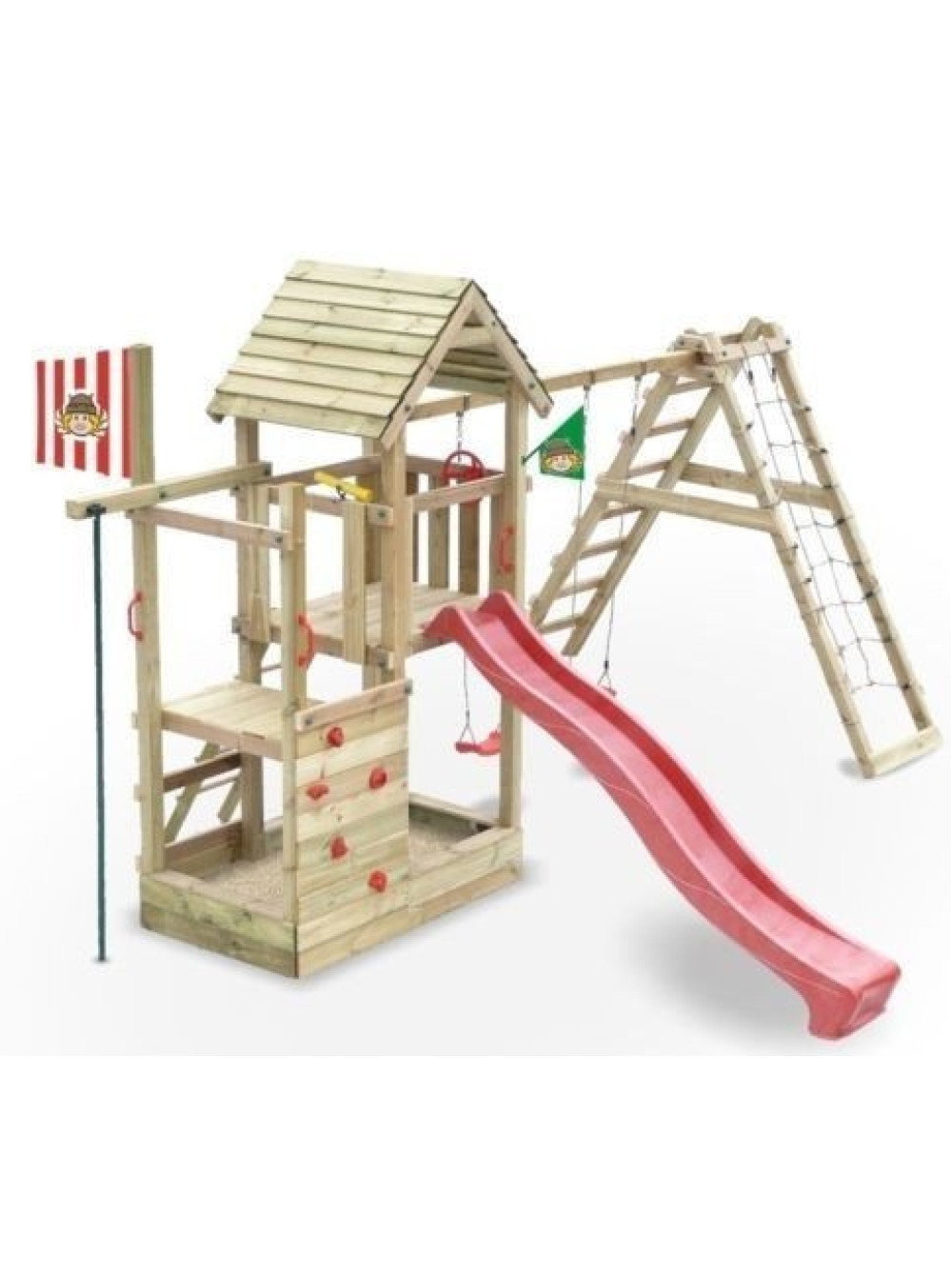 Майданчик дворівнева, складається з двох веж, різних по висоті платформи, одна з яких з дахом. До однієї з платформ (120 см), яку можна використовувати як спостережний пункт, встановлена скелелаза-дошка. А до вежі (140 см) - пластиковий спуск.