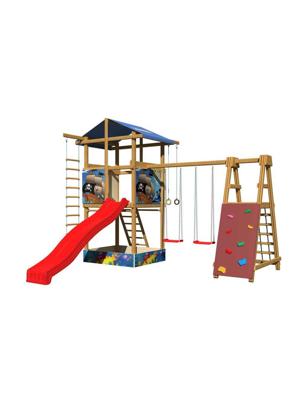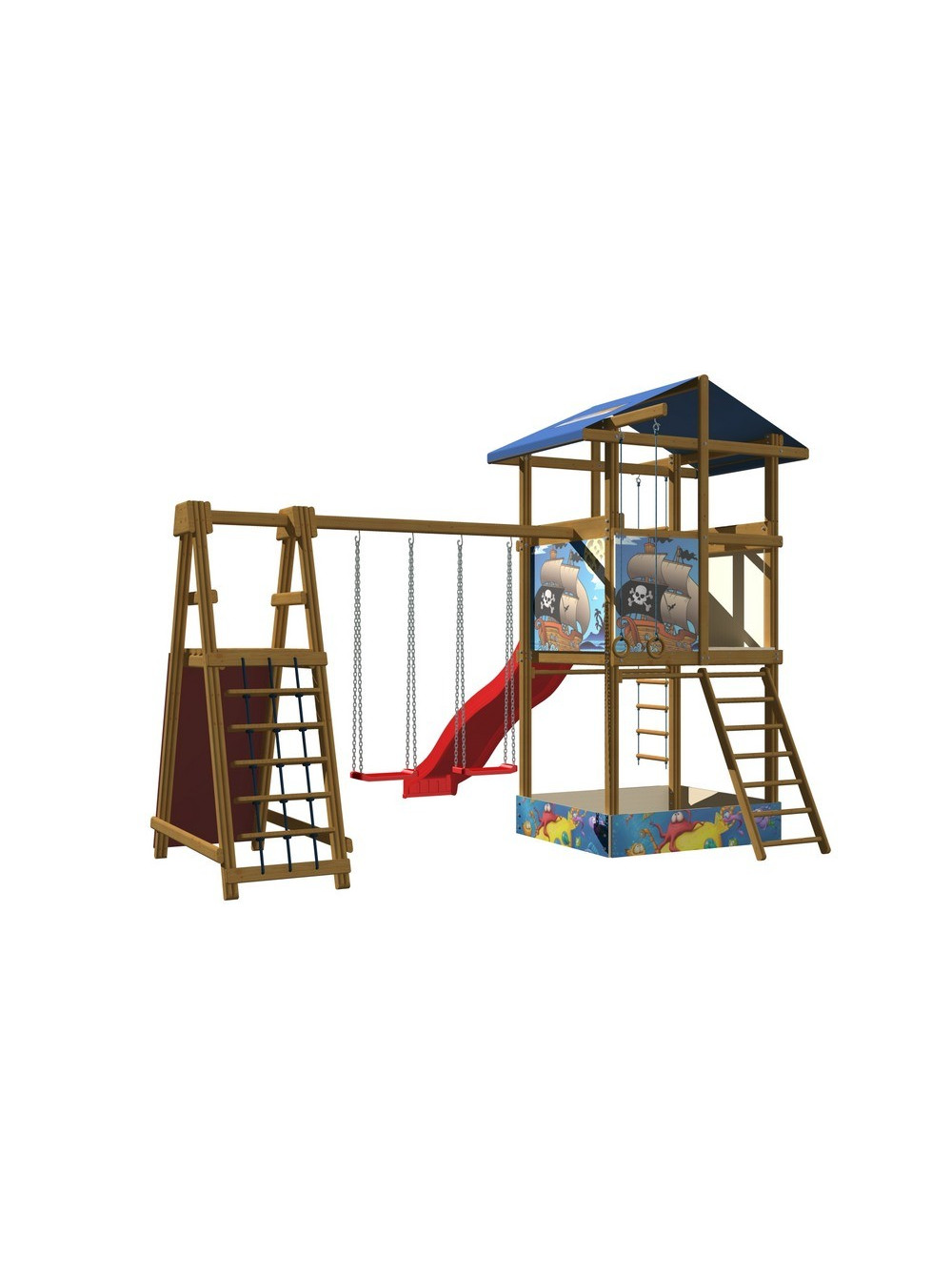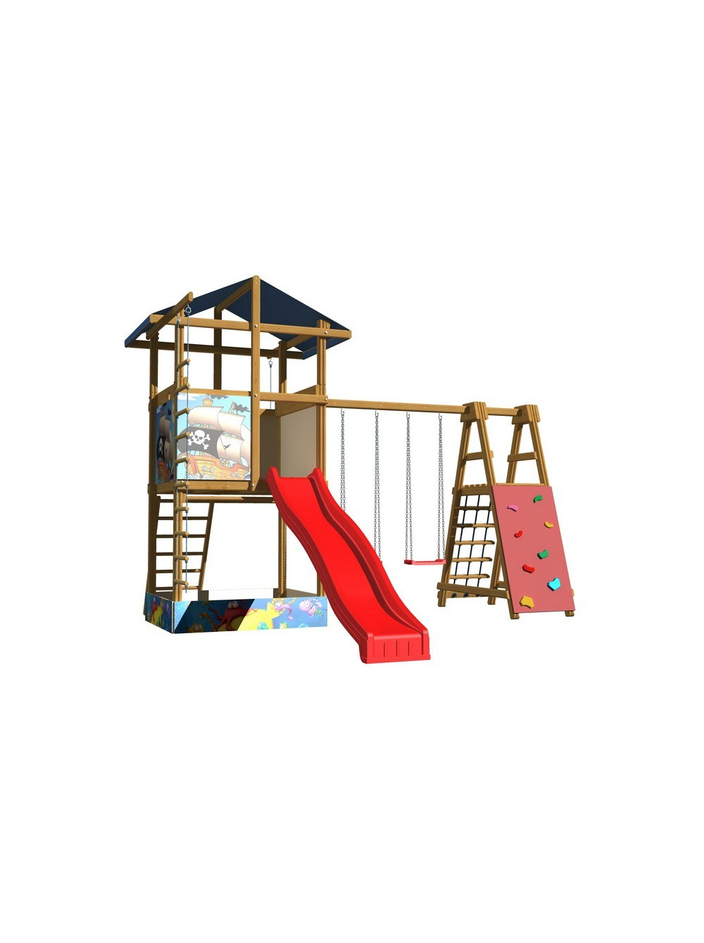 Майданчик дитячій для дачі SB-9 - це один з найпопулярніших комплексів, який має відразу кілька особливо улюблених ігрових елементів, включаючи дошку для скелелазіння, піратську сітку, гірку і дві гойдалки.
