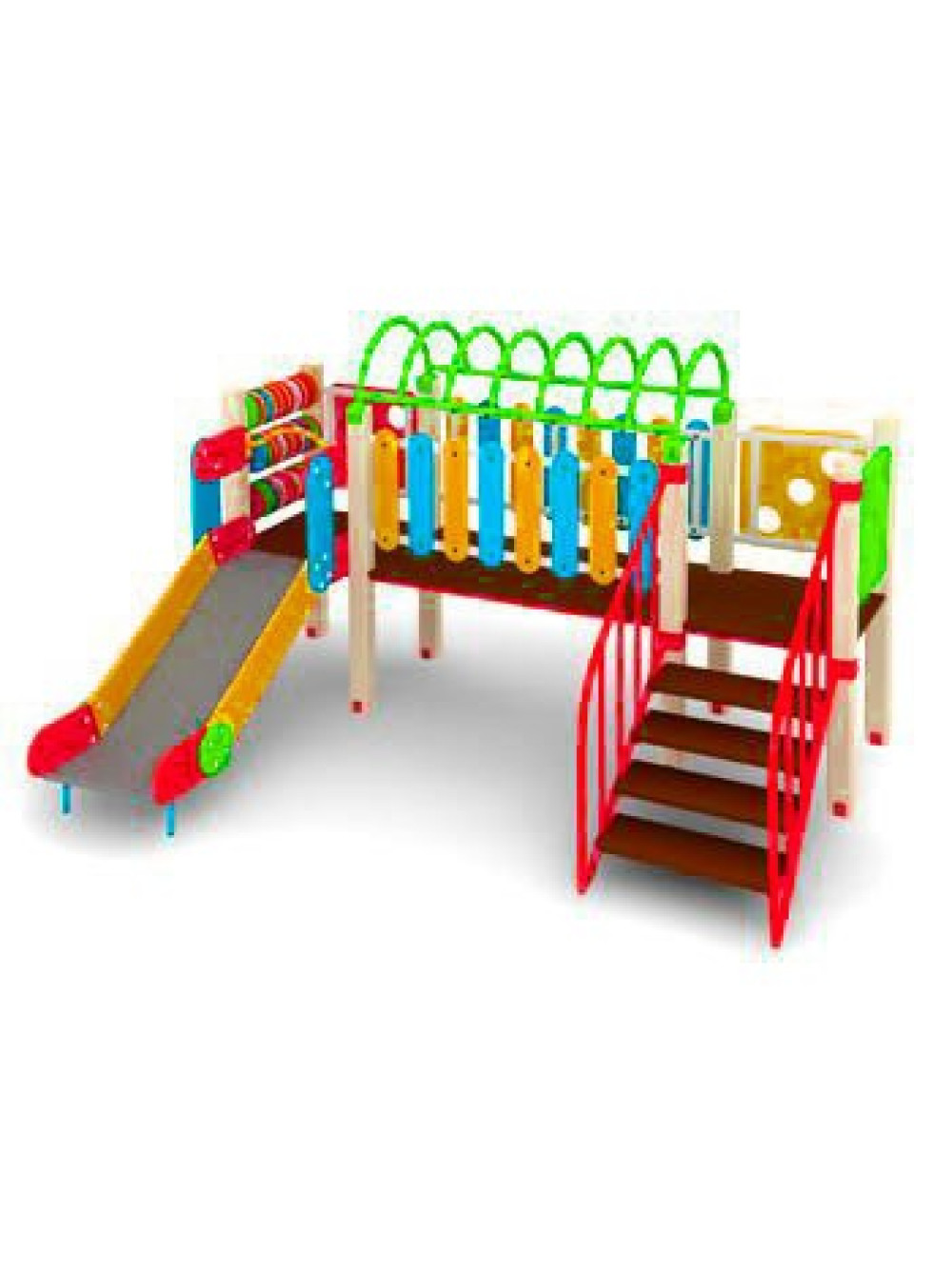Цікавий варіант для тих хто хоче, щоб діти більше рухалися і не просто підіймалися сходами до спуску, але і долали незначні перешкоди. У даному комплексі таких є два - це спеціальний перехід на шляху до гірки і дуга-рукохід з металу. І ще одна інтелектуальна родзинка цього майданчика - різнокольорові рахунки.