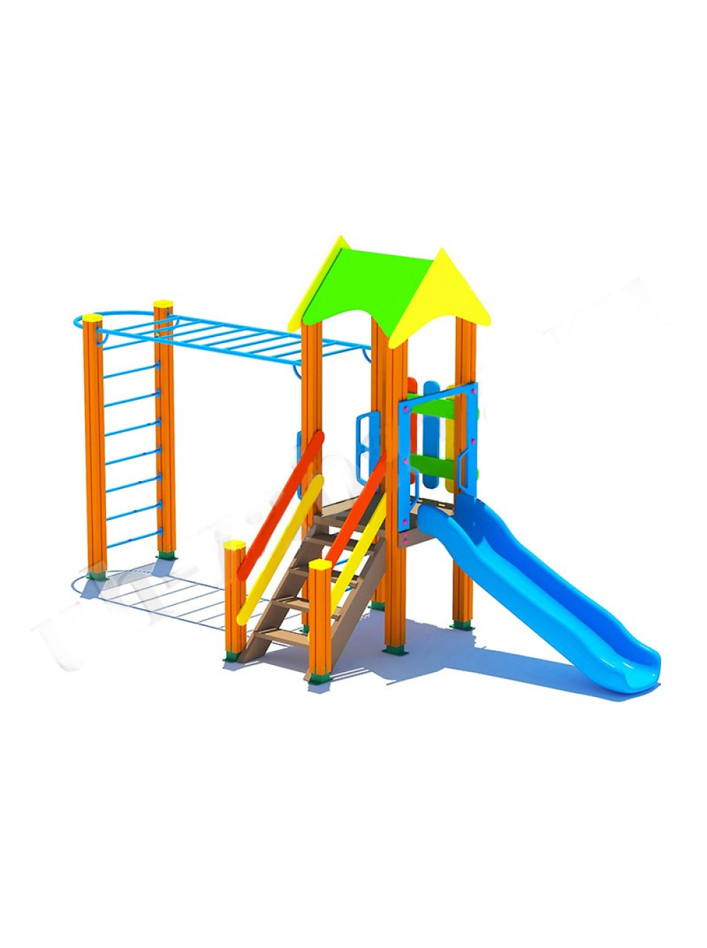 Ігровий майданчик з пластиковою гіркою №1 - цікаве і корисне поєднання вежі із спуском і рукохода. Тут можна не лише попустувати і з'їхати з гірки, але і пройтися по перекладинах сходів збоку і згори.