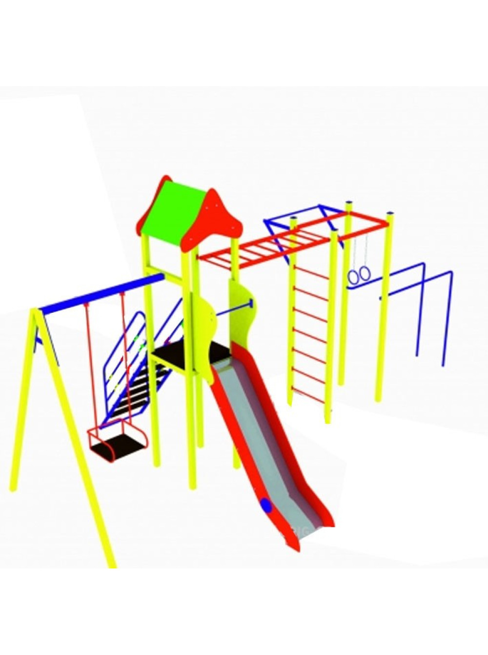 І це рішення дуже правильне, тому, що граючи, непомітно для себе й без усякого примусу з боку дорослих, дітвора поступово буде освоювати світ спортивних занять. До того ж на такому комплексі одночасно зможуть перебувати різновікові діти від трьох до десяти років та кожен знайде розвагу за своїм бажанням і можливостям. Зовсім маленьким будуть цікаві гойдалка та гірка, а старші діти зможуть позмагатися один з одним у спритності та силі.