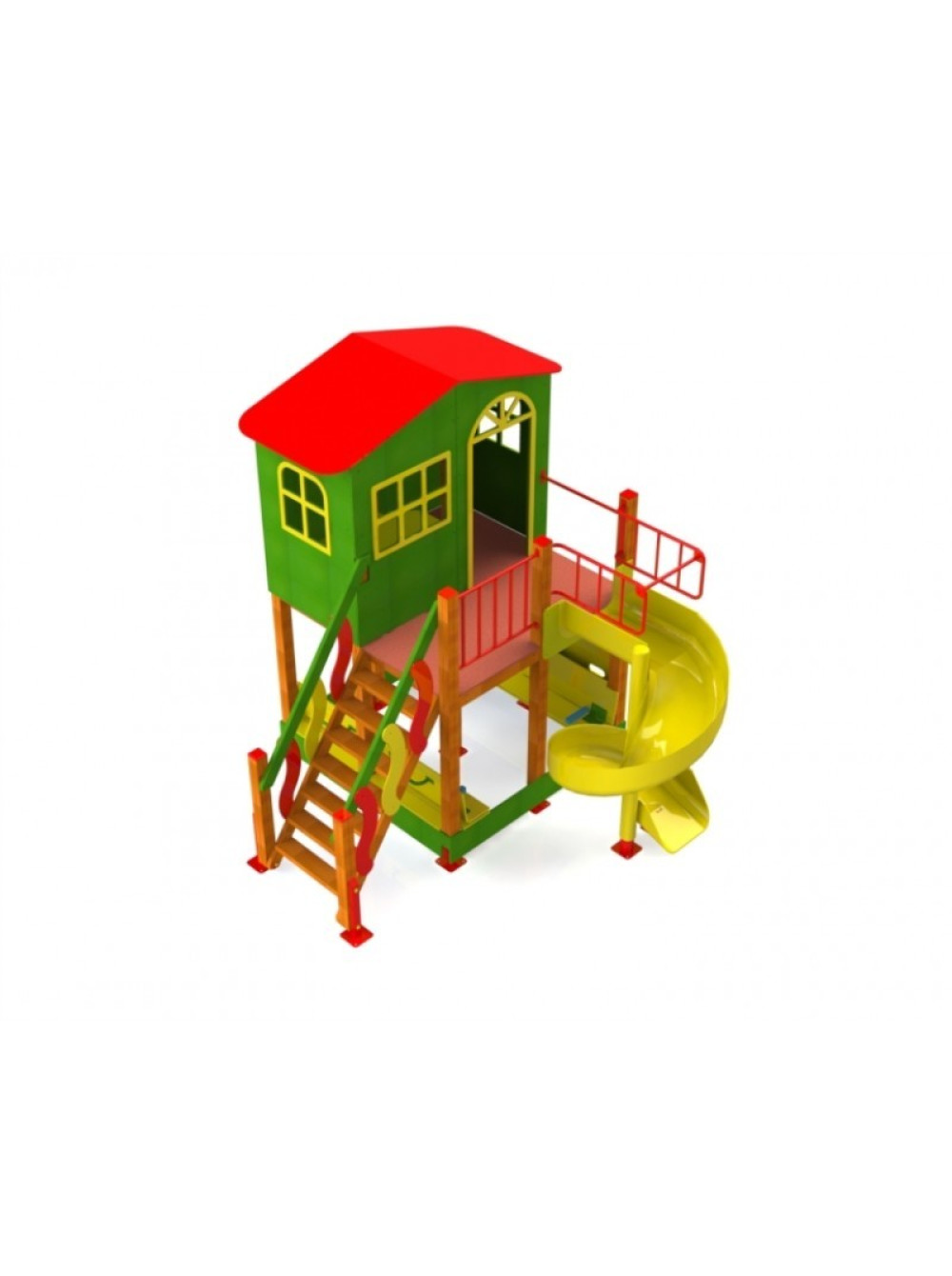Ігровий комплекс Хатинка з спіральною гіркою - цікава конструкція, яка складається з найбільш популярних і улюблених дітьми ігрових елементів. На відміну від більшості майданчиків з вежами, тут є повноцінний будиночок з вікнами, в який дітвора може потрапити двома способами: по сходах і скелелазі і вибратися з нього, з'їхавши з спіральної гірки. Внизу є зона відпочинку у вигляді двох лавок, які трансформуються в кришку для пісочниці . І звичайно ж, гойдалки для двох , що бажають погойдатися.