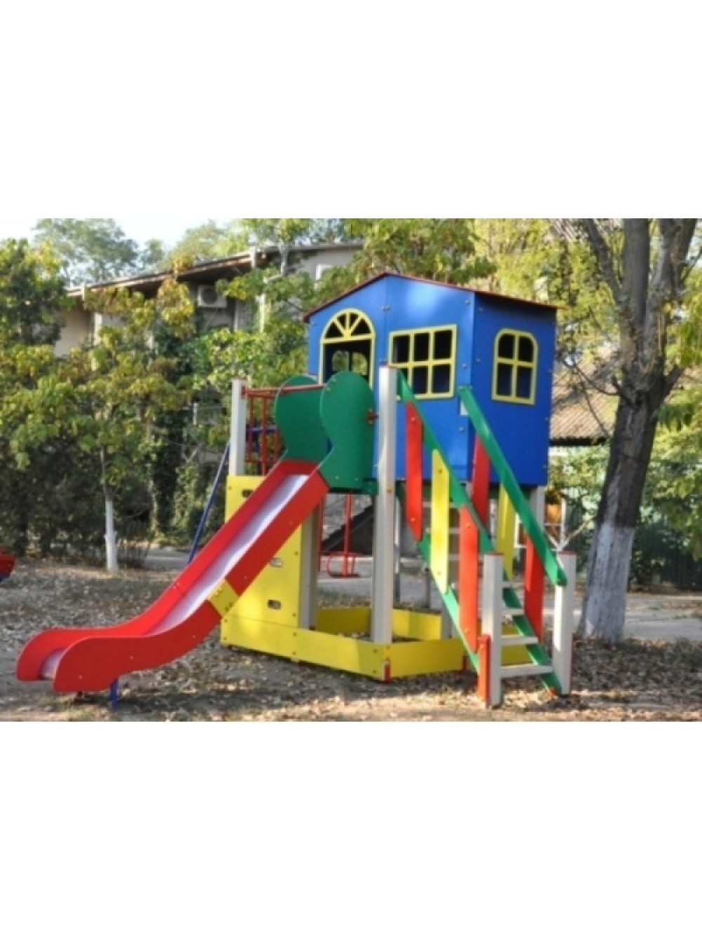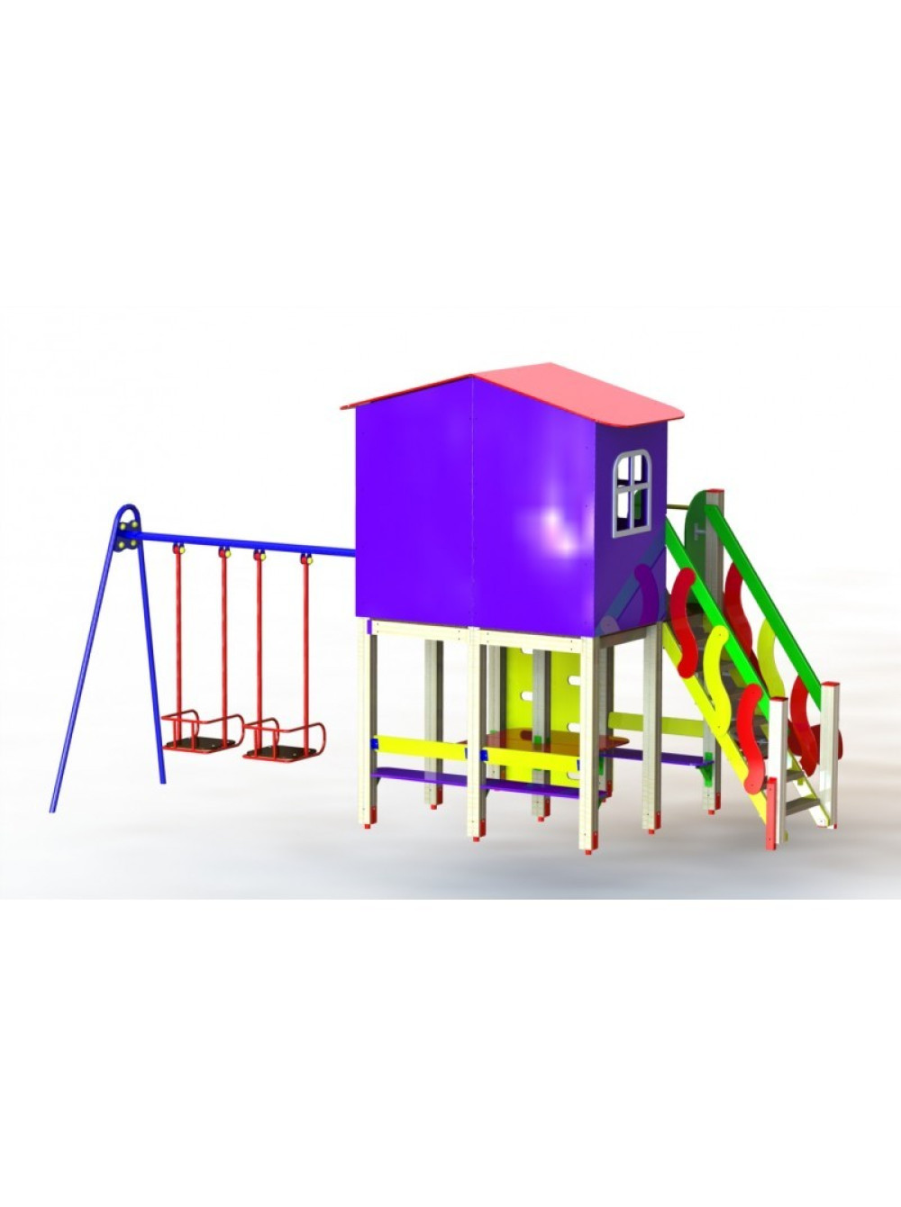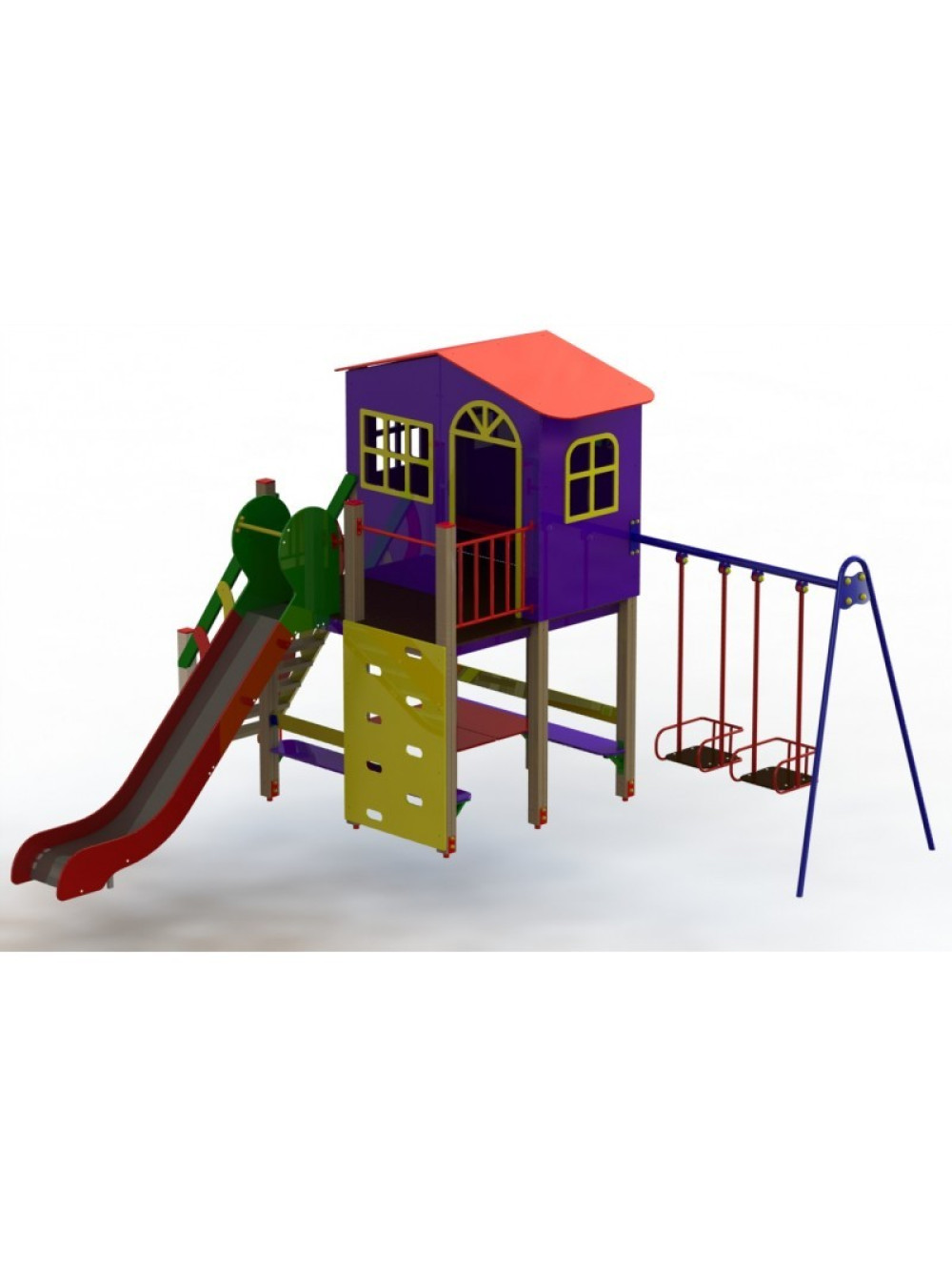 Ігровий комплекс Хатинка - цікава конструкція, яка складається з найбільш популярних і улюблених дітьми ігрових елементів. На відміну від більшості майданчиків з вежами, тут є повноцінний будиночок з вікнами, в який дітвора може потрапити двома способами: по сходах і скелелазі і вибратися з нього, з'їхавши з гірки. Внизу є зона відпочинку у вигляді столу з лавками. І звичайно ж, гойдалки для двох, що бажають погойдатися.