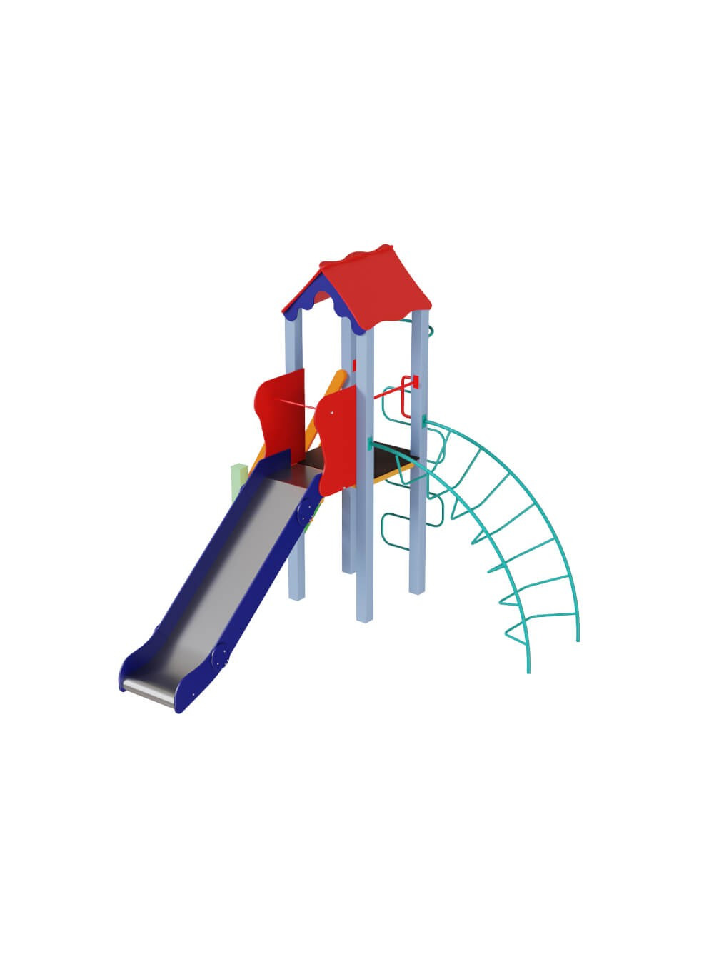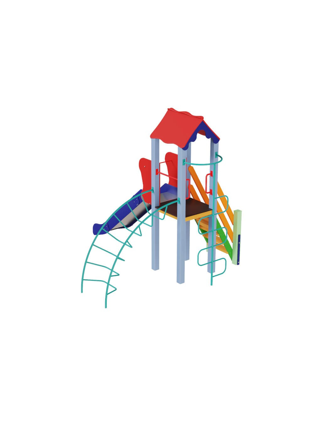 Добротний, якісний майданчик, ергономічний і багатофункціональний. Укомплектований вежею середньої висоти з дахом, яка доповнена спуском з нержавіючої сталі, зигзагоподібним лазом і лазом-ліаною.