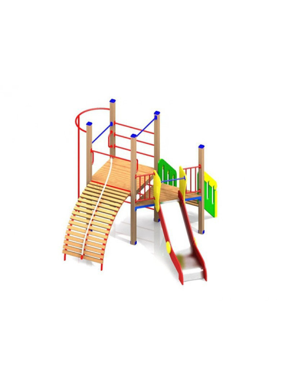 Вуличний майданчик для дітей Мурашник - незвичний дворівневий варіант виконання ігрової зони, комплектація якого дає великі можливості для підйомів, лазів і спусків дітлахів, яких тут кілька. Один - традиційна гірка, другий - це металева жердина для найактивніших і безстрашних. А залізти на платформу теж можна кількома способами - по драбинці або по містку за допомогою каната. Такий майданчик можна встановити в будь-якому громадському місці, парку, сквері або навіть на пляжі. З-за свого незвичайного дизайну вона досить компактна, практична і стійка.