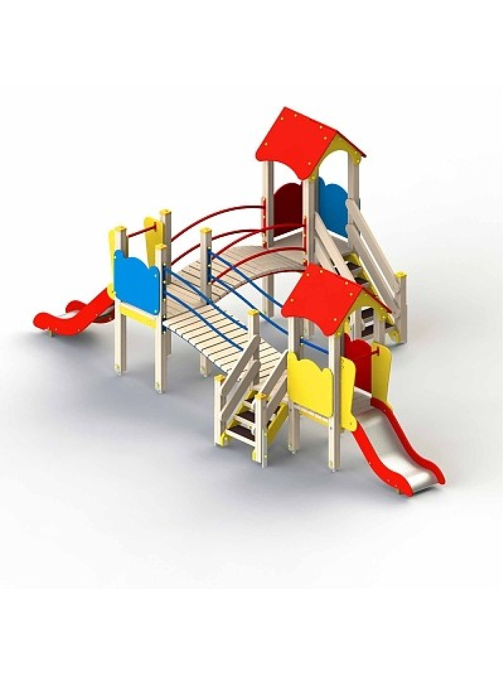 Вуличний майданчик Маша і Ведмідь - чудова ігрова споруда з переходами різної висоти і будиночками-вежами. У комплекті є дві гірки різної довжини, тому грати тут зможуть хлоп'ята різного віку.