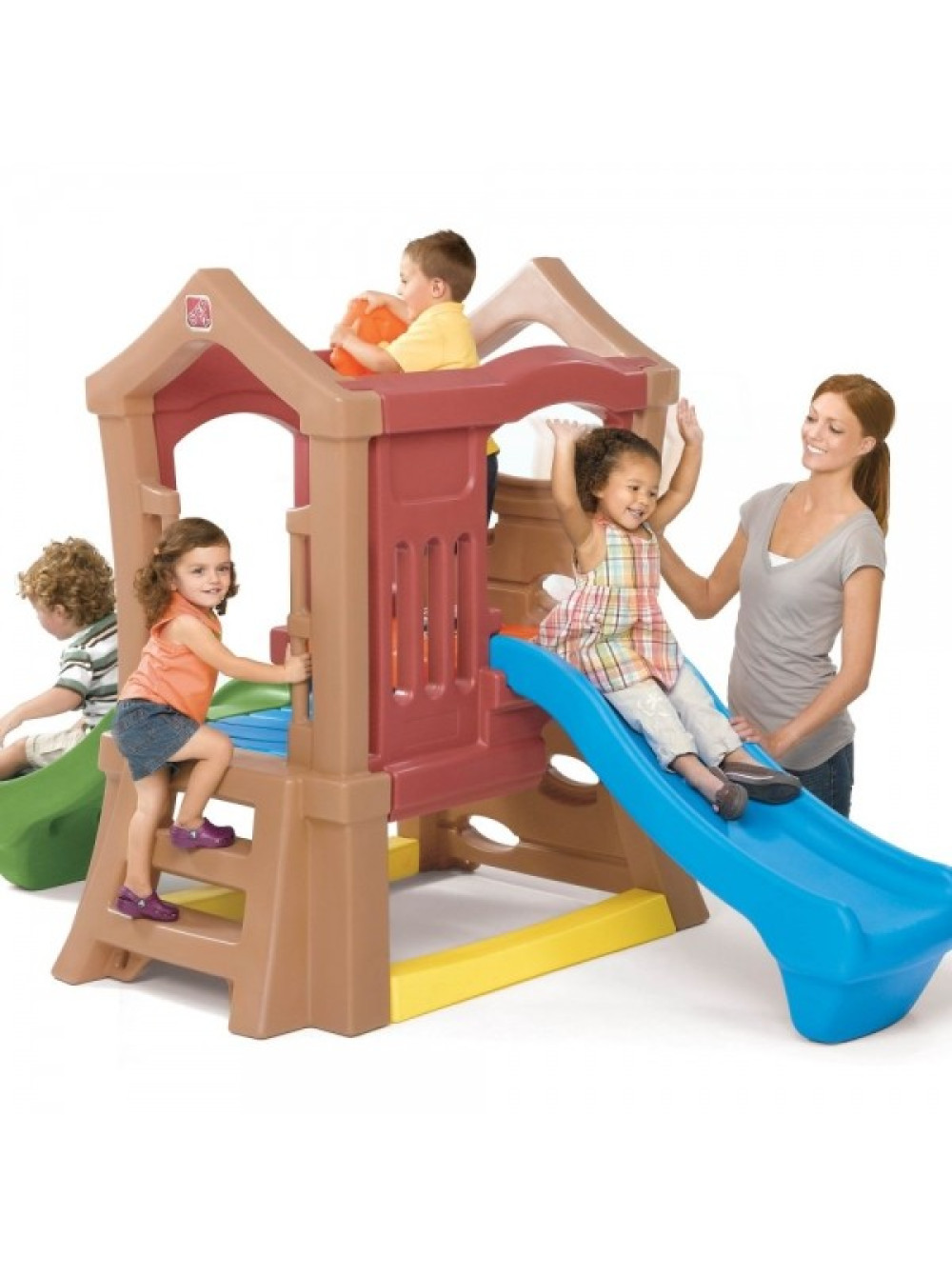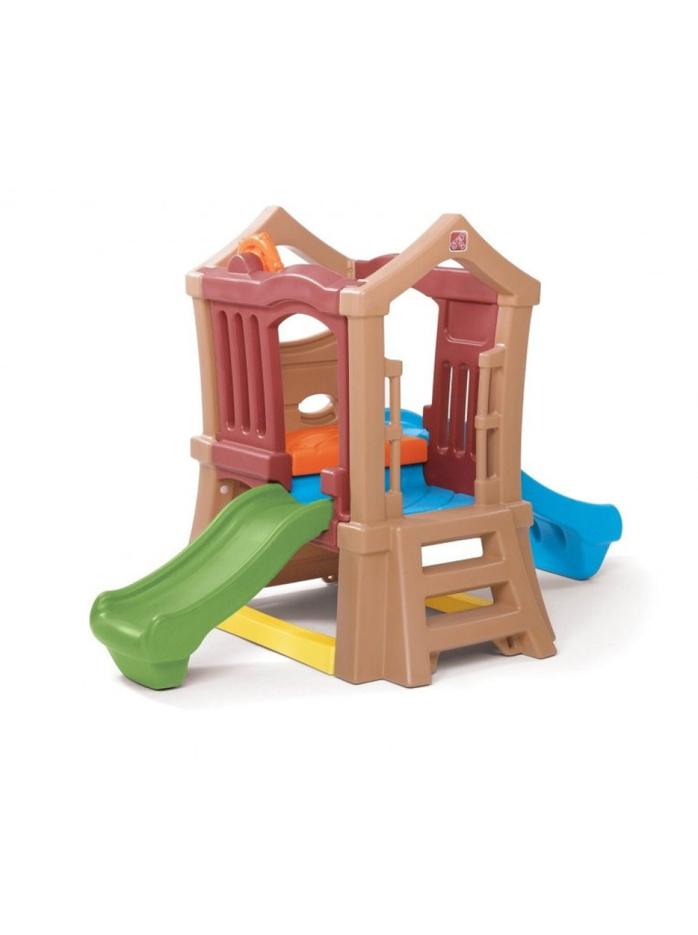 Конструкція цього комплексу розрахована на заняття для самих маленьких, зручні широкі сходи з поручнями і пологий спуск гарантують максимальний комфорт і безпеку. А кому буде нудно підніматися по сходах можуть скористатися стіною з отворами і по ній залізти в будиночок.