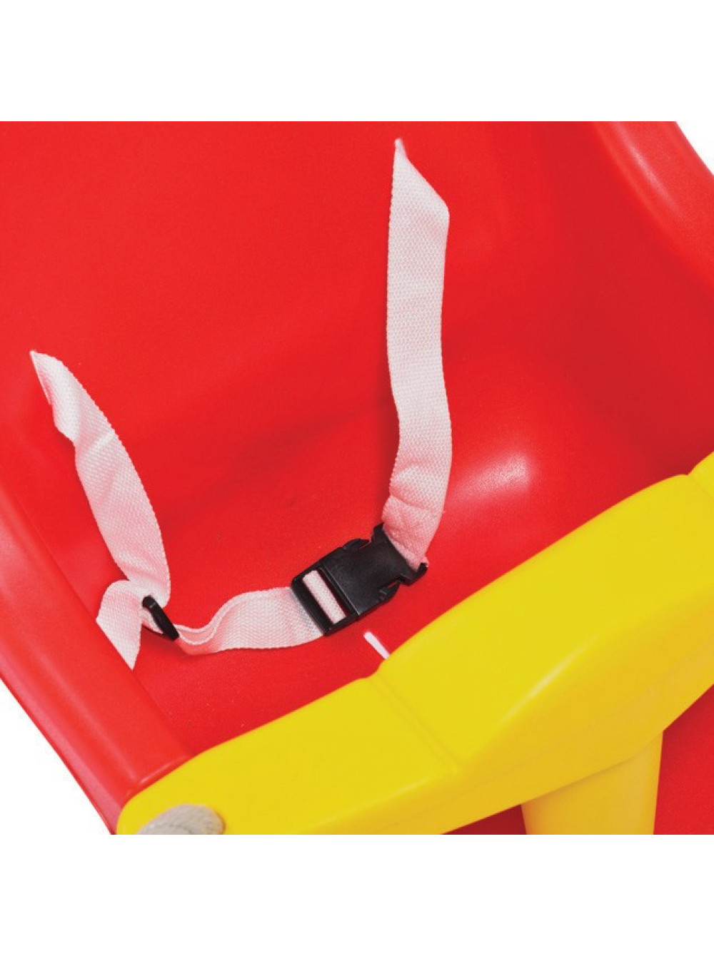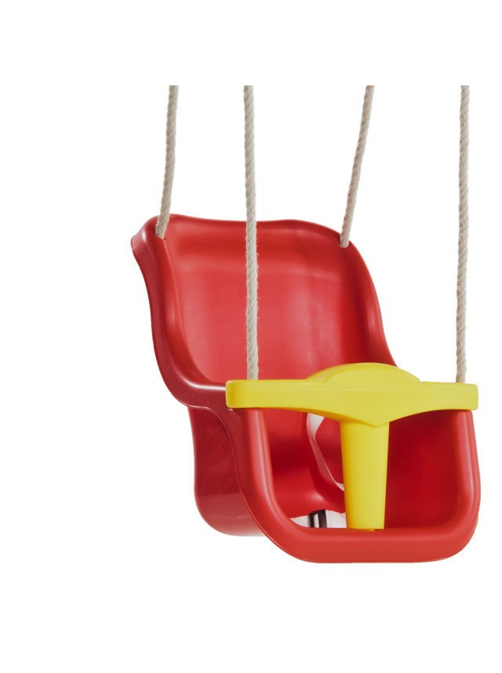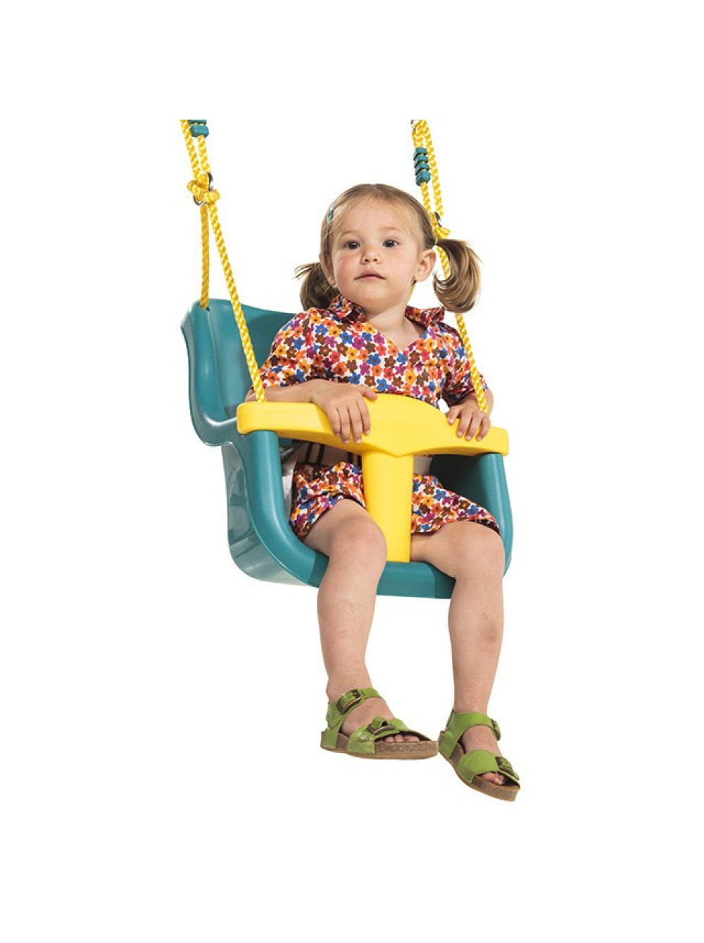 Сидіння для гойдалки з захистом зроблено з HDPE пластика (формована технологія лиття під тиском). Ця модель сидіння з окремою блокадою у вигляді букви Т, оснащена оберігаючою застібкою для безпеки малюка.