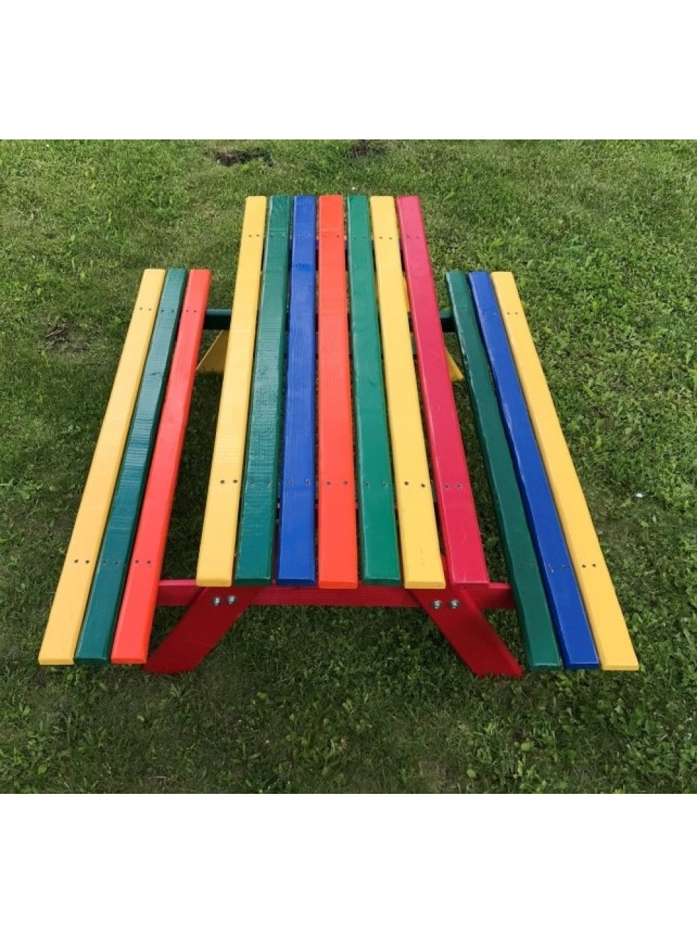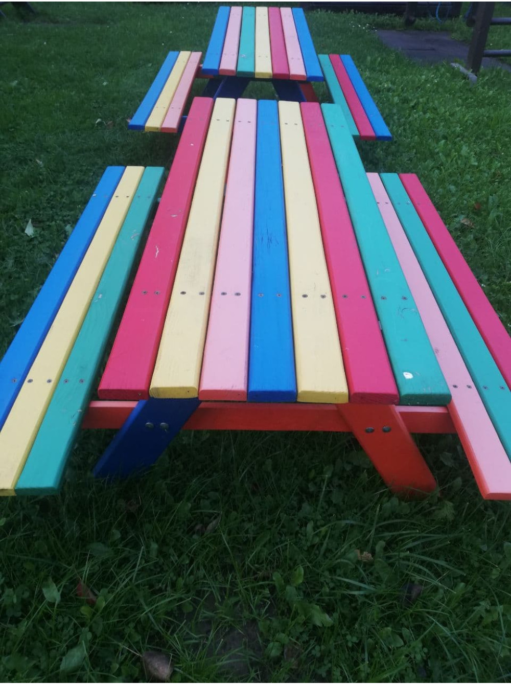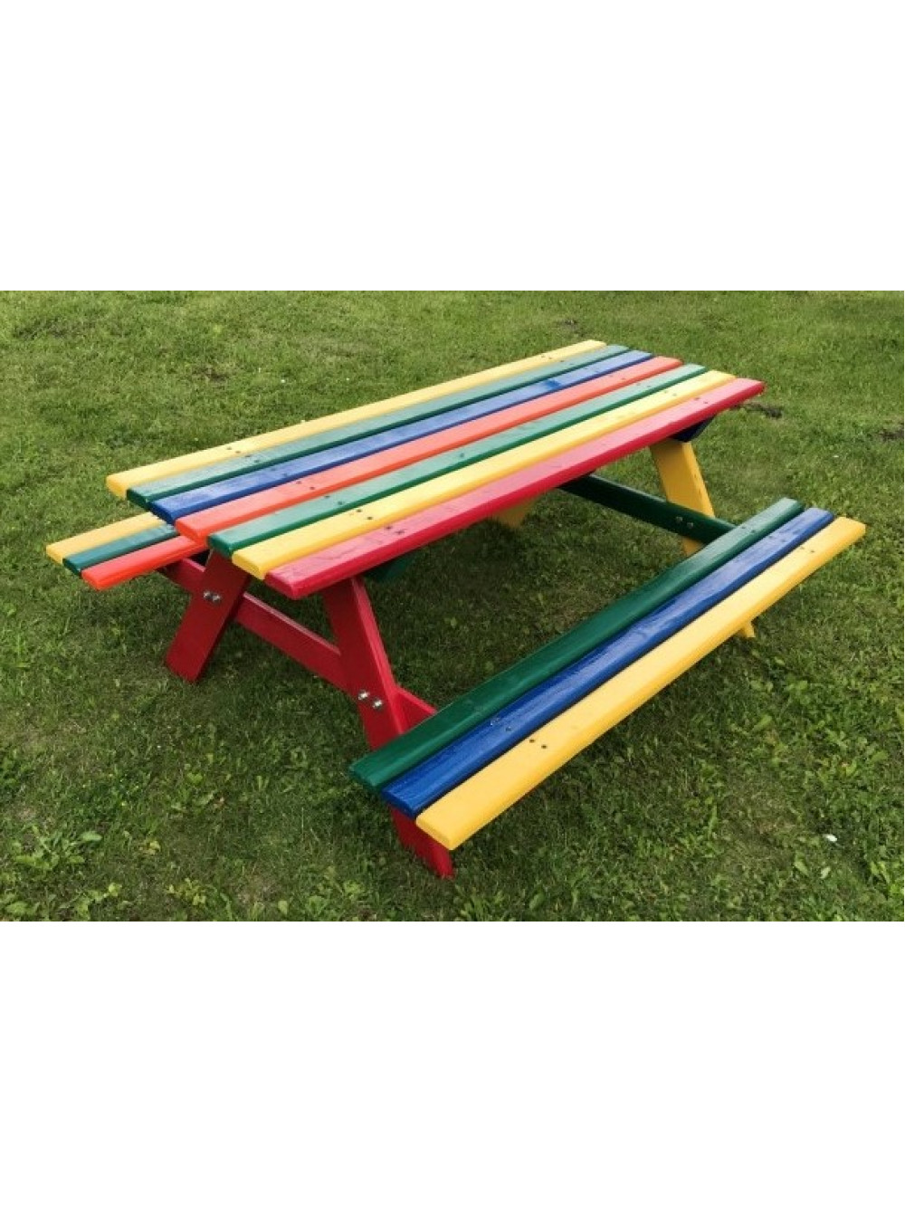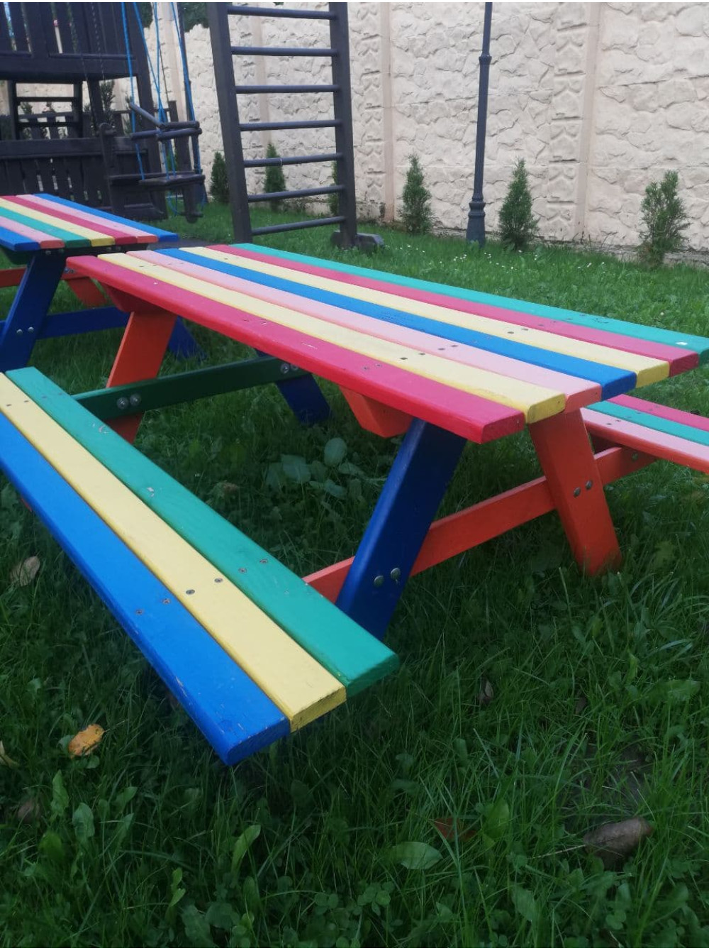 Дерев'яний стіл з лавками для дітей - це дуже потрібна річ на будь якій присадибній ділянці або у дворі приватного будинку. Конструкція кольорова, зроблена якісно і забарвлена в райдужні кольори, габаритні розміри розраховані на дітей дошкільного та шкільного віку.