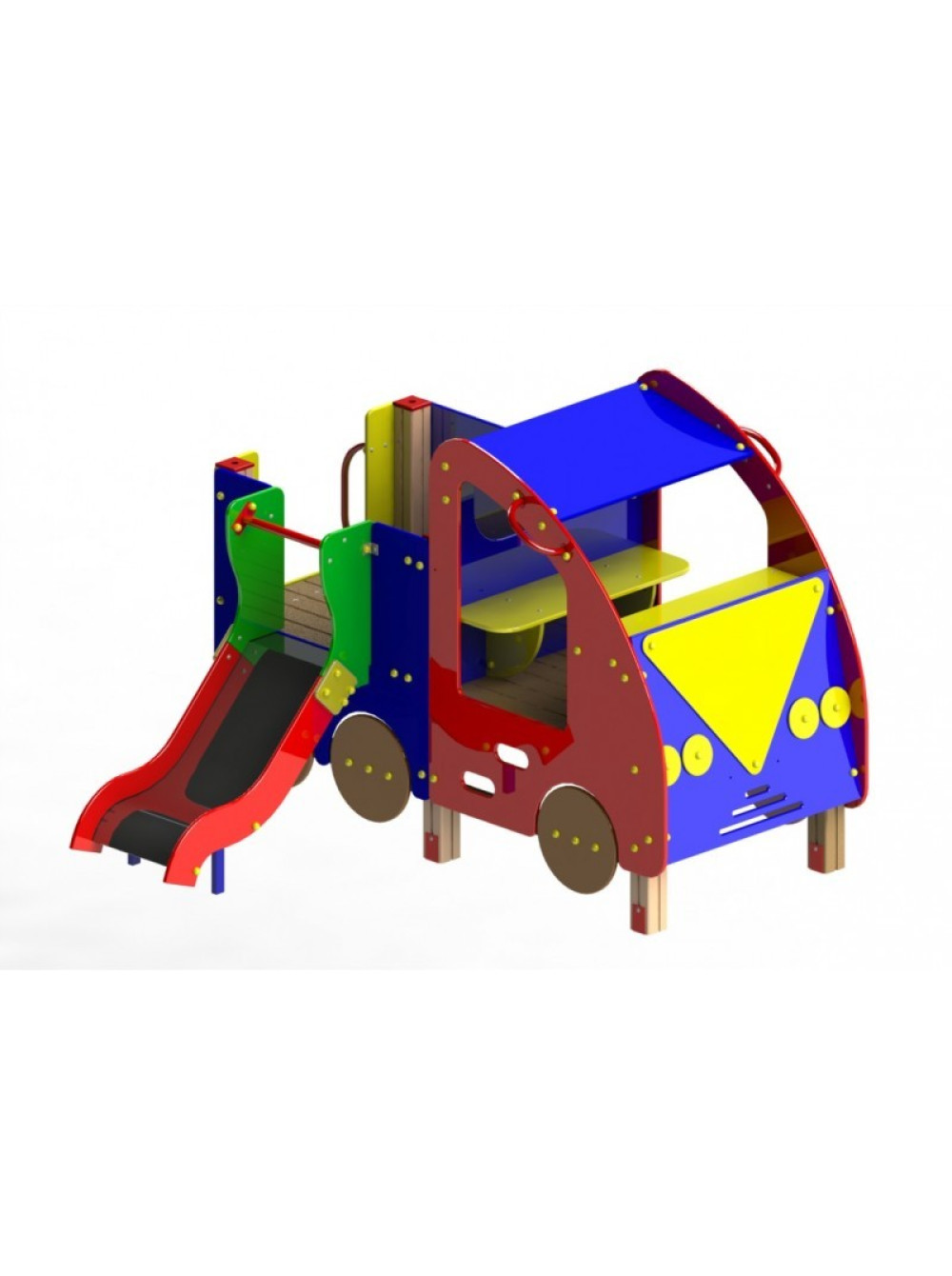 Ігровий комплекс Машинка - красивий і кольоровий, майже іграшковий, стане яскравим додатком ігрової зони в будь-якому громадському місці чи у дворі житлового будинку. Незважаючи на свій гарненький зовнішній вигляд, виріб досить міцний, стійкий та якісний.