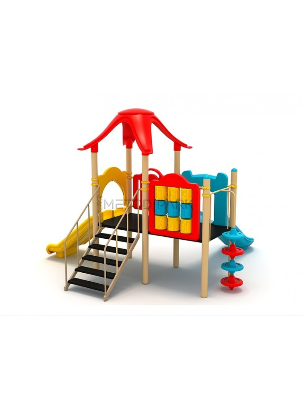 Ігровий комплекс виконаний з металу. Електростатична порошкова фарба наноситься на металеві деталі шляхом піскоструминної обробки, оцинкування, полірування ґрунтовки або катафорезу. Поліетиленові деталі виготовлені з антистатичного матеріалу, нешкідливого для здоров'я.
