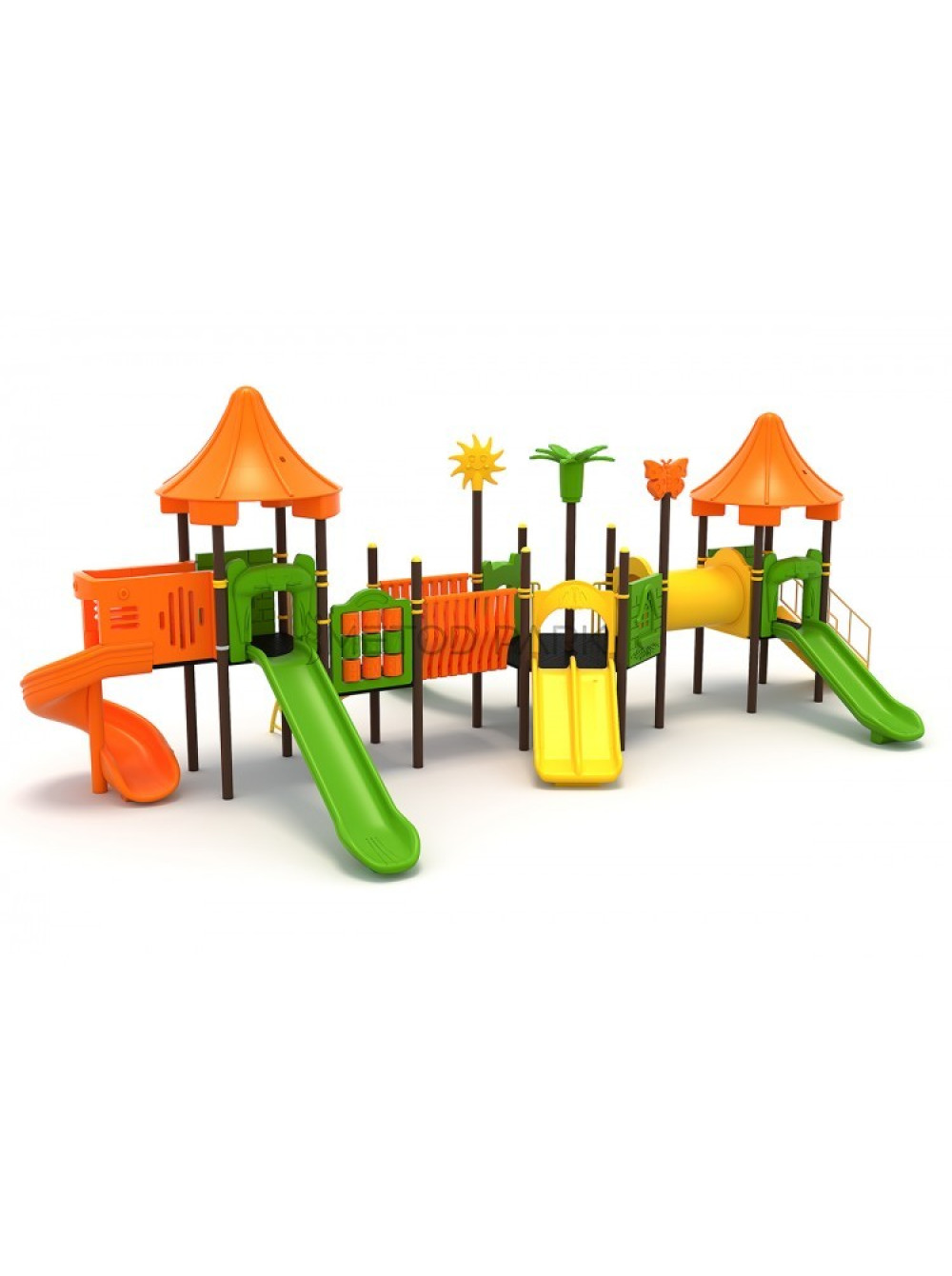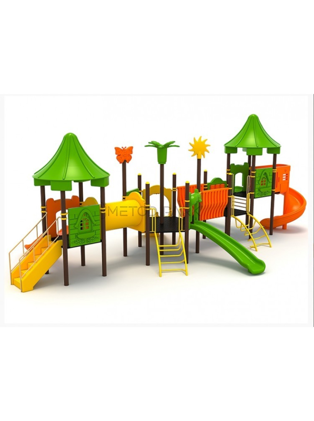 Игровая площадка Метод Парк Классик-4 - интересный развлекательный мини городок для детей с множеством игровых элементов: переходов, платформ, мостиков и конечно же горок. В этом комплексе их четыре, их них три стандартных прямых и одна винтовая, все изготовлены из пластика. Стойки украшены разнообразными фигурками, а крыши над платформами выполнены в виде цирковых шатров.  Добротное приобретение для элитных новостроек или общественных зон отдыха.