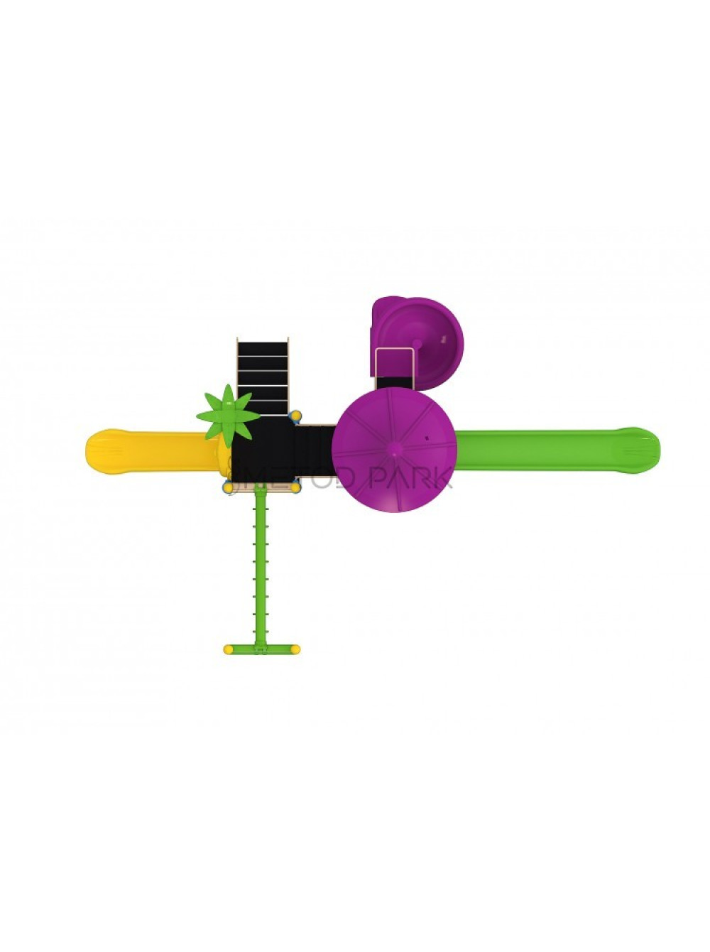Майданчик Метод Парк Класик-5 - спортивно-ігровий комплекс для діток різного віку, виконаний в яскравих, контрастних кольорах з мінімальною прикрасою у вигляді пальми і тематичним дахом, стилізованим під шатро. Основні акценти цього дитячого майданчика - спіральна гірка і незвичайний рукохід.