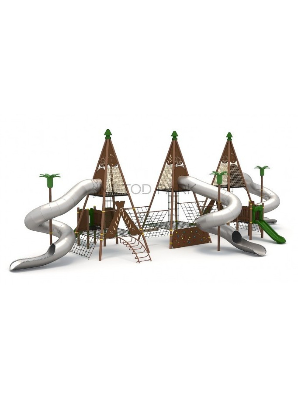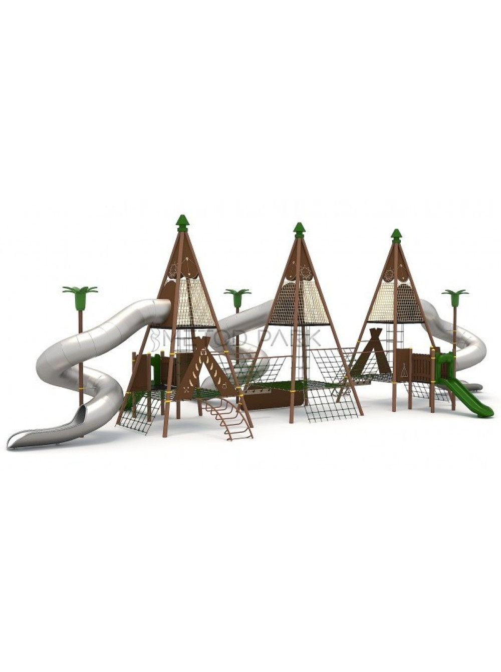 Ігровий майданчик тематичний Вігвам-2 Туреччина виконана в стилі житла корінних американців, дизайн мінімалістичний і не перевантажений функціональним наповненням, що робить його елегантним, витонченим і неповторним. Ігровий комплекс просторий і виглядає як повітряний замок, який доповнюють різноманітні ігрові сітки, панелі і запаморочливі гвинтові гірки з нержавіючої сталі. А для зовсім маленьких відвідувачів - невеликі класичні пластикові спуски.