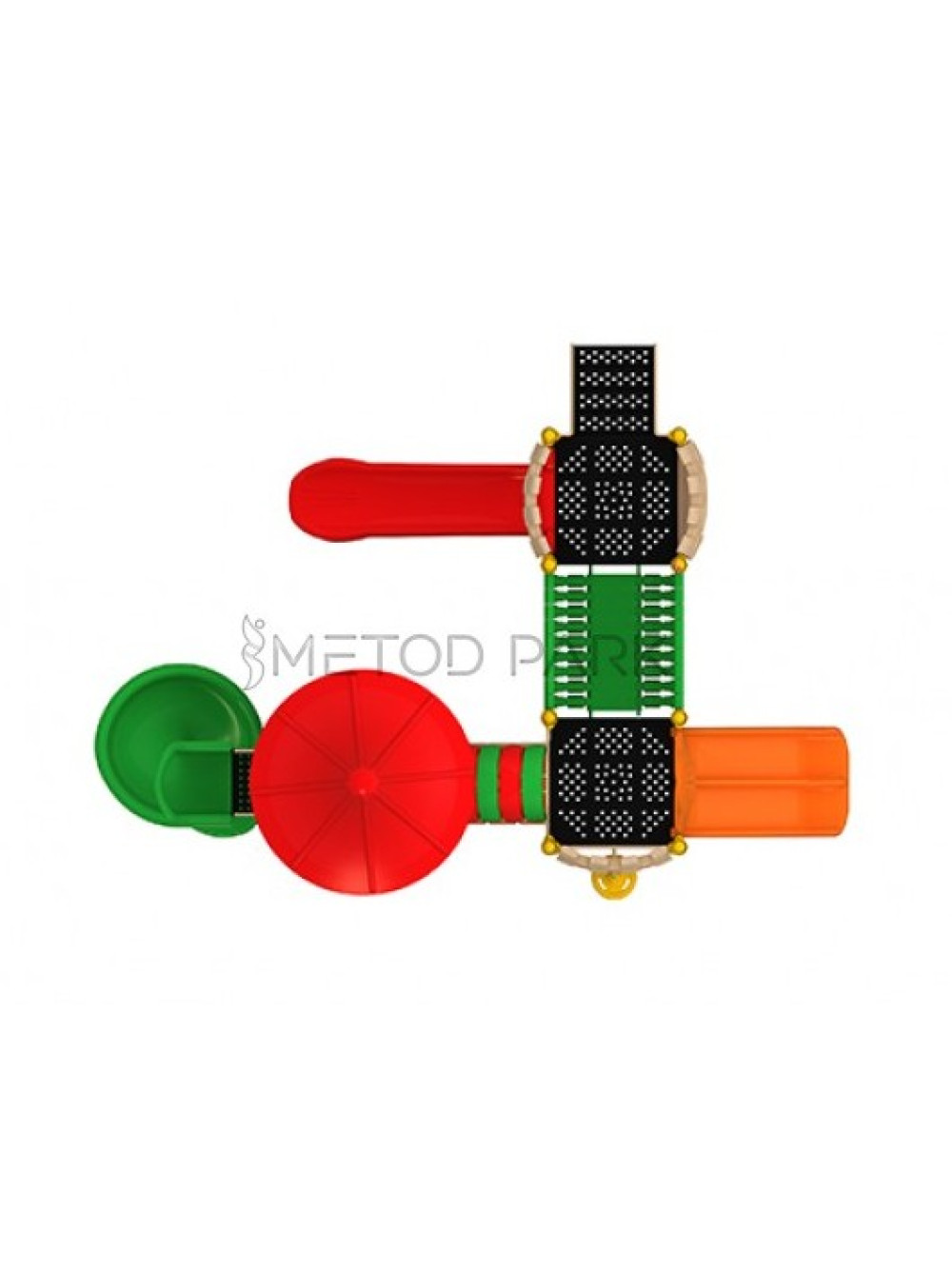 Комплекс розташований на двох рівнях, платформи з різноманітними пластиковими спусками з'єднані між собою містком-переходом. Також для зручності дітей і батьків укомплектований двома лавками.